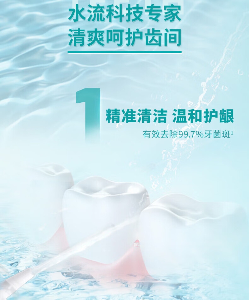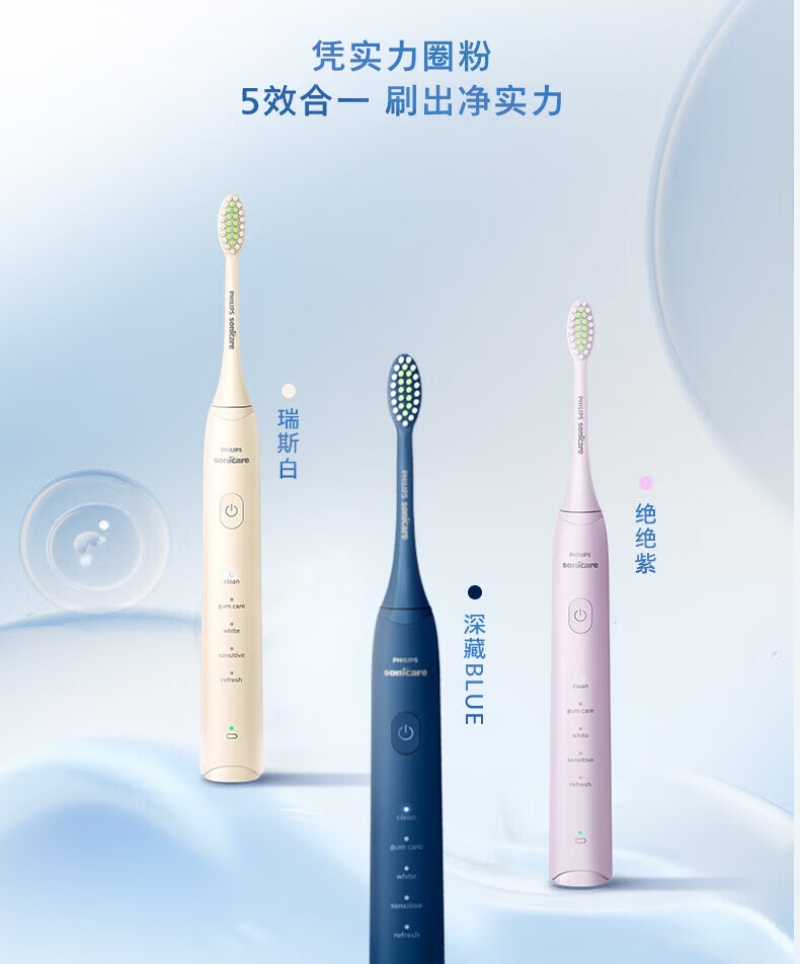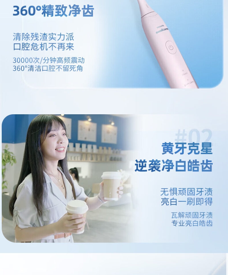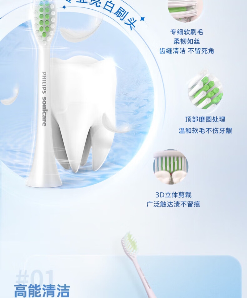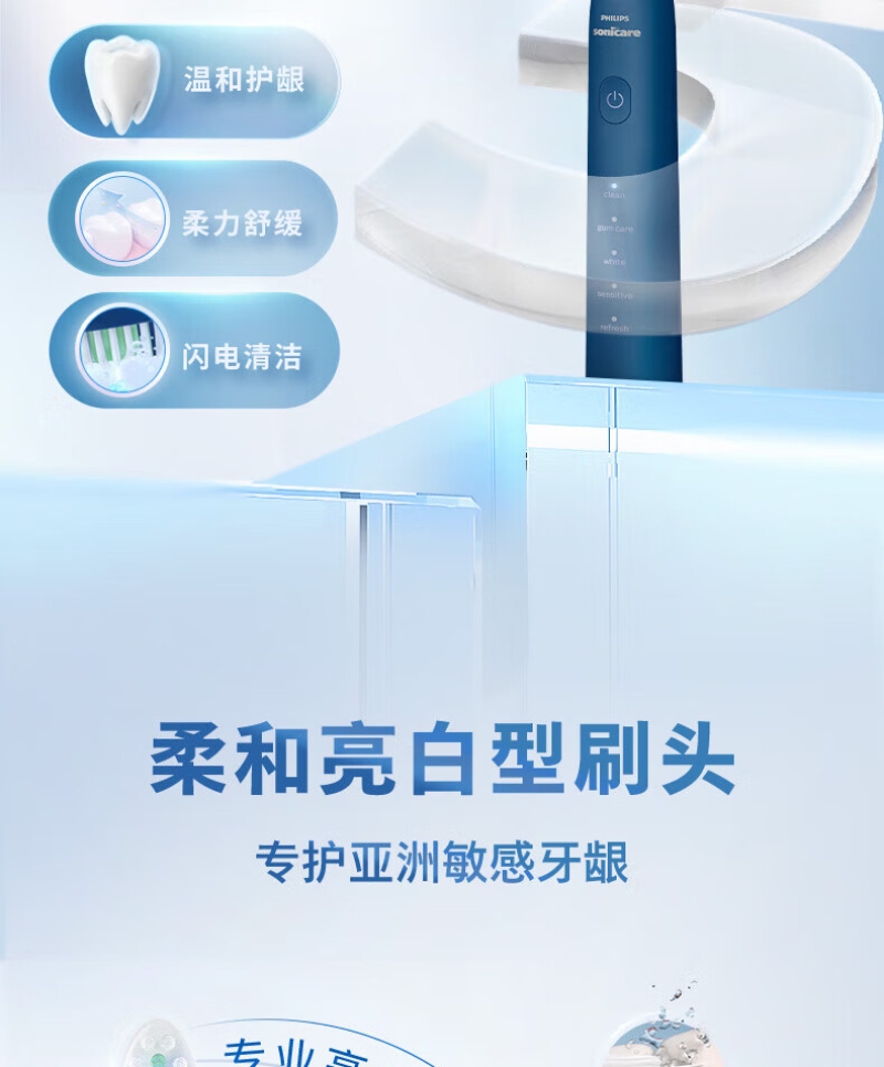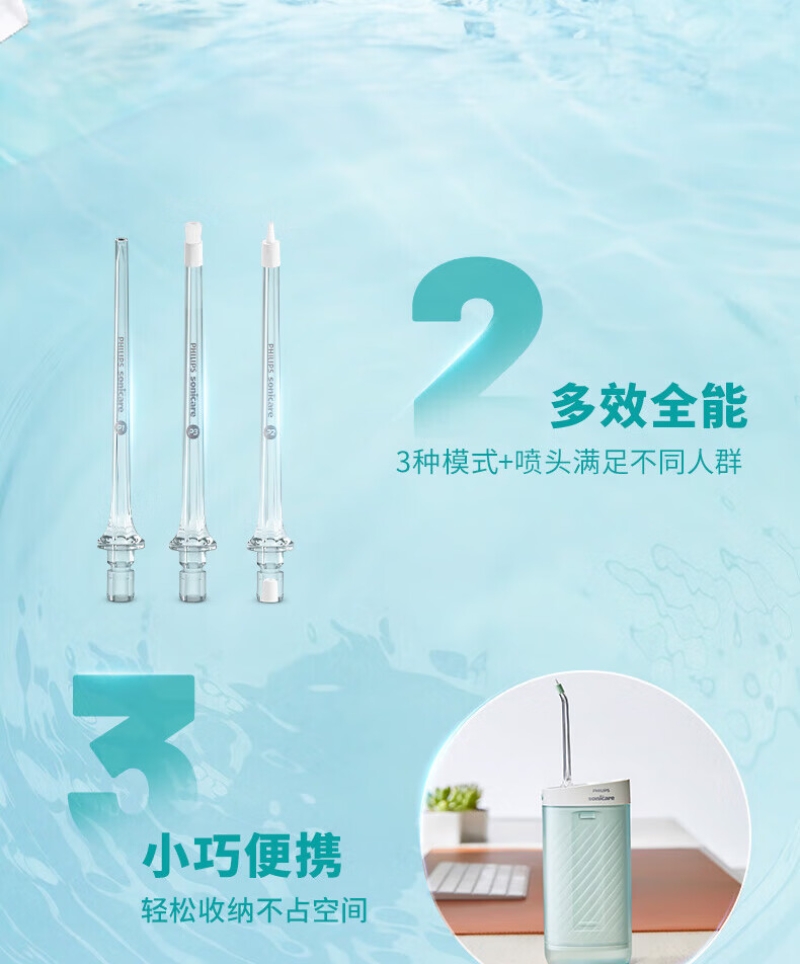Quad Stream脉冲水流技术引导您逐一清洁各;360°可旋转喷头,全方位清洁无盲区;Sonicare 先进声波技术可获得轻柔的清洁效果;2种模式:清洁模式日常清洁;敏感模式轻柔清洁牙齿