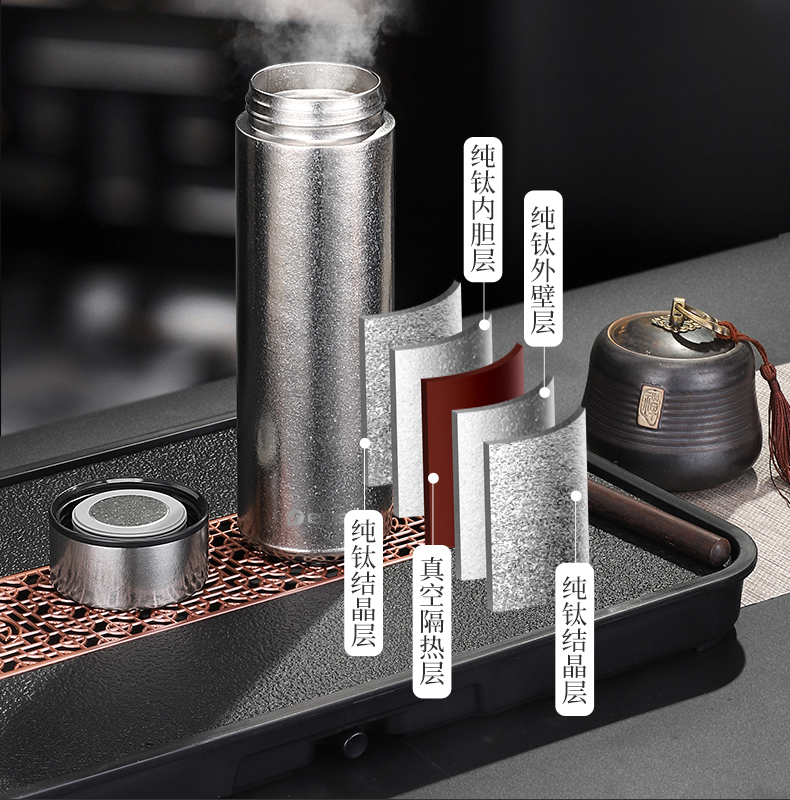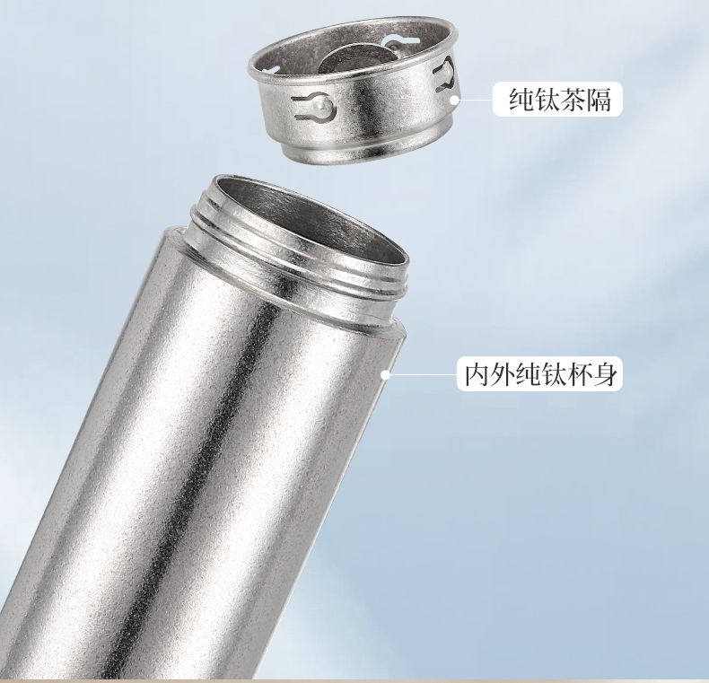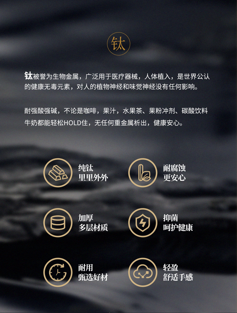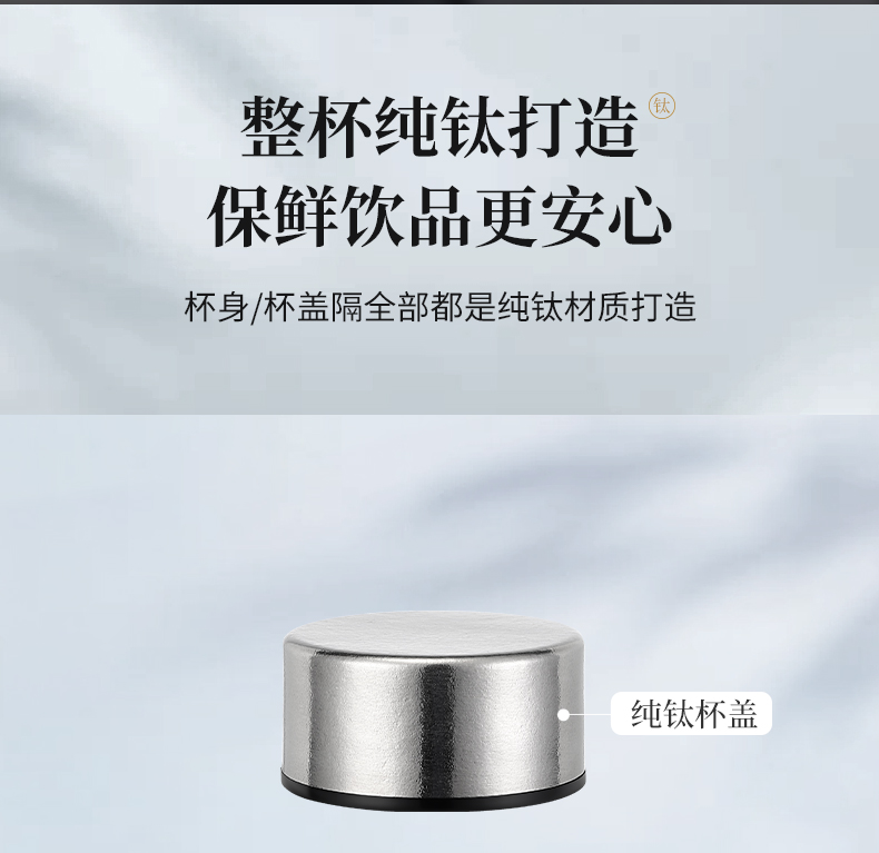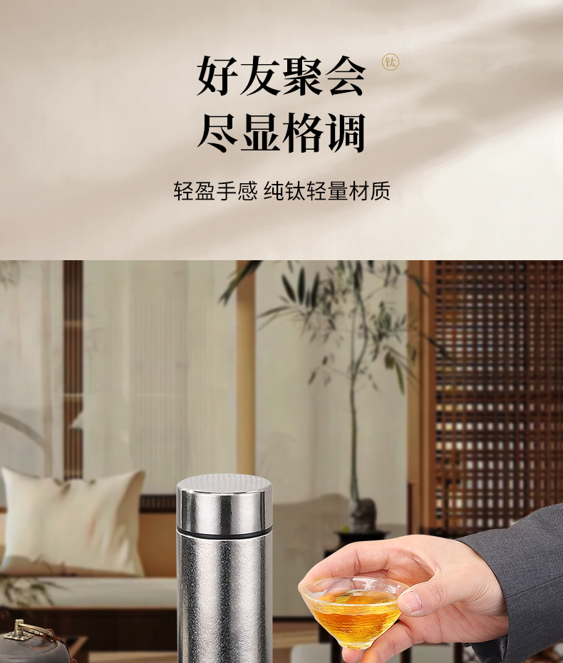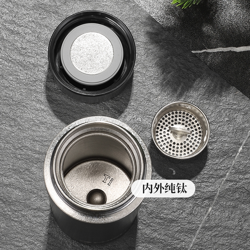 内外99.8%纯钛、安全健康;抑制多种细菌滋生、保鲜饮品不变味;双层真空、保温&保冷、轻盈便携;耐酸耐碱抗腐蚀、适合各种饮品