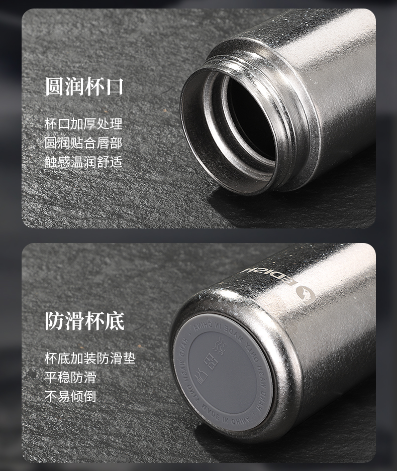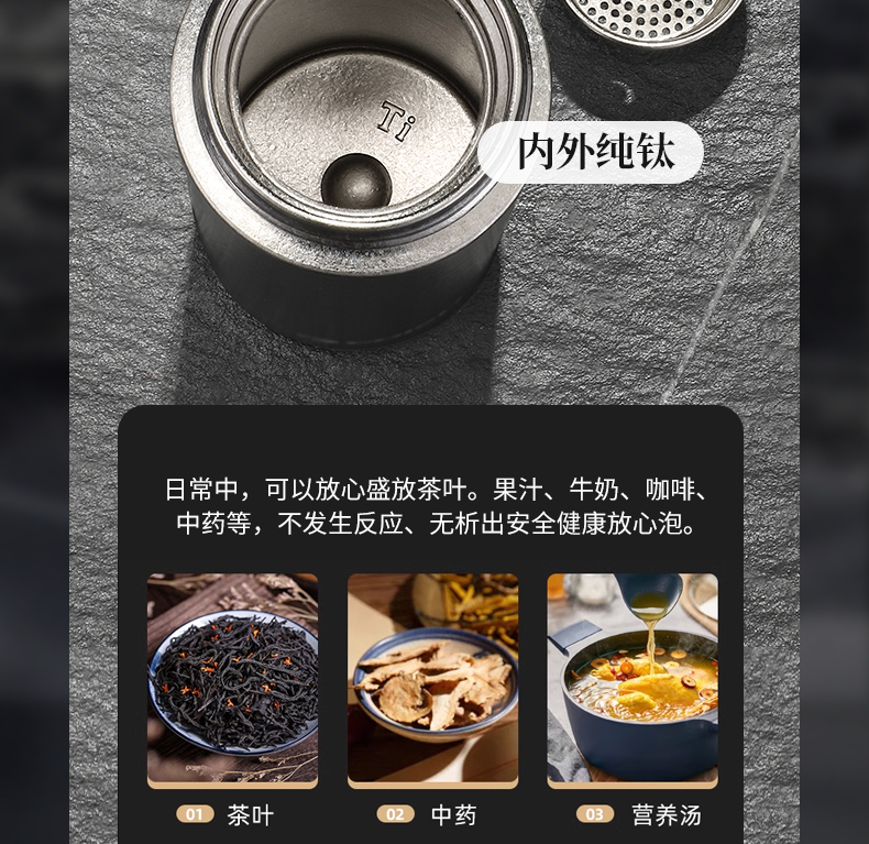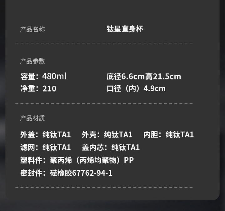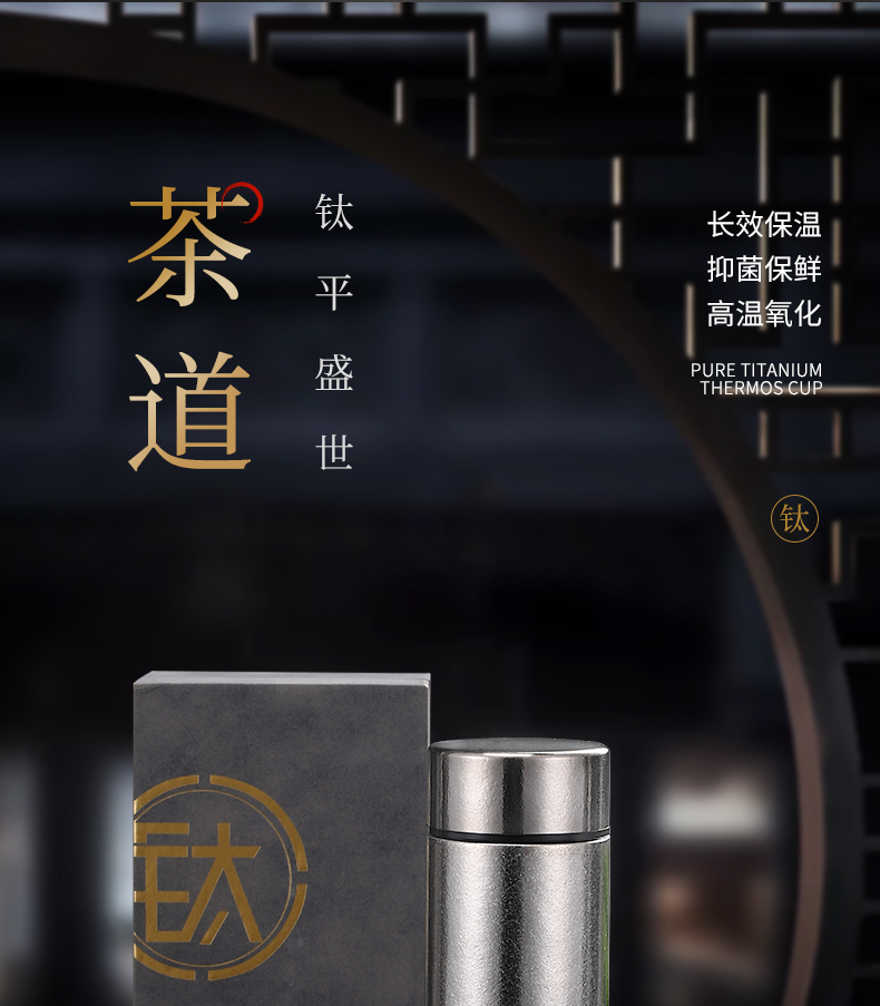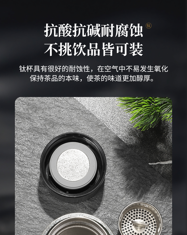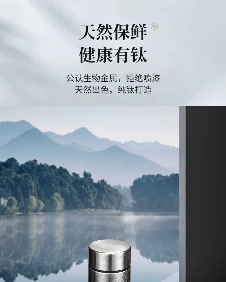 内外99.8%纯钛、安全健康;抑制多种细菌滋生、保鲜饮品不变味;双层真空、保温&保冷、轻盈便携;耐酸耐碱抗腐蚀、适合各种饮品