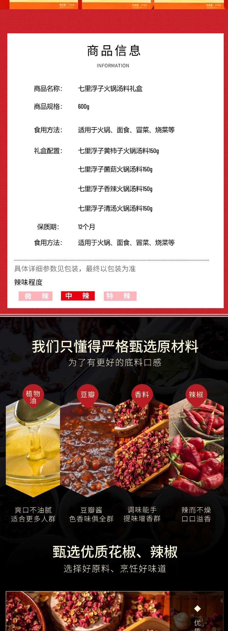 配置清单:礼盒配置: 1、七里浮子黄柿子火锅汤料150g 2、七里浮子菌菇火锅汤料150g 3、七里浮子香辣火锅汤料150g 4、七里浮子清汤火锅汤料150g