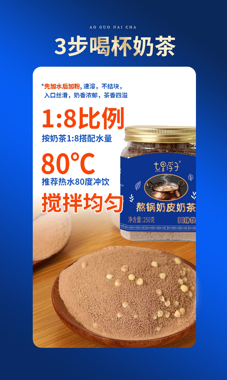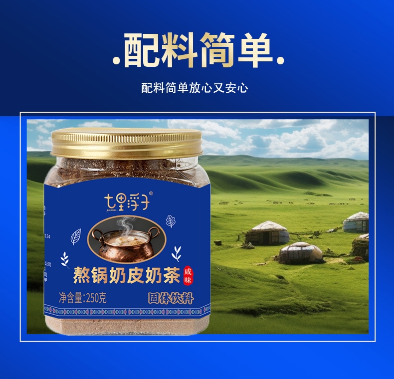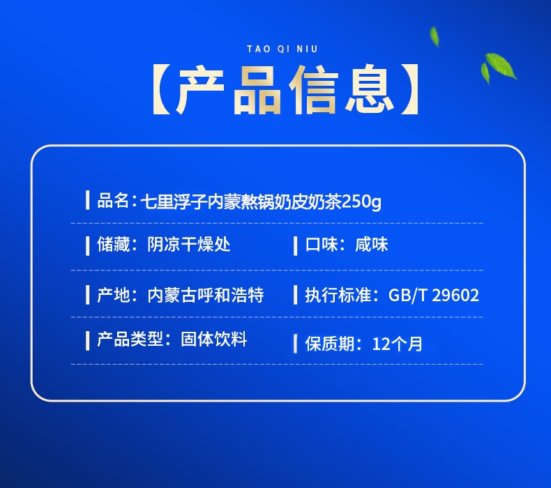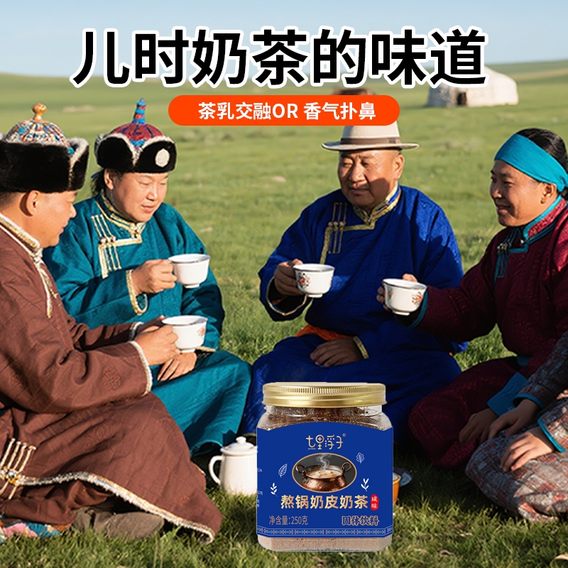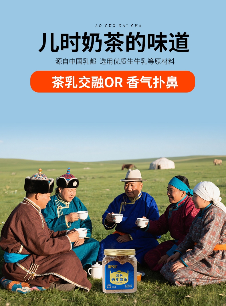 内蒙古奶源地,品质保证;口感醇厚、香而不腻;乳粉+砖茶+奶皮子+炒米