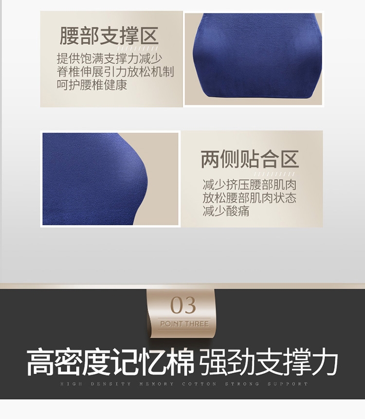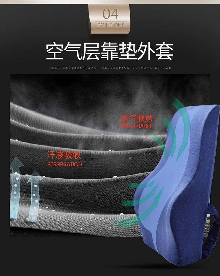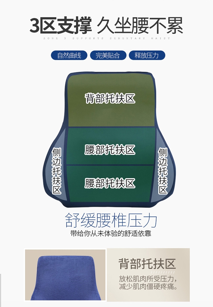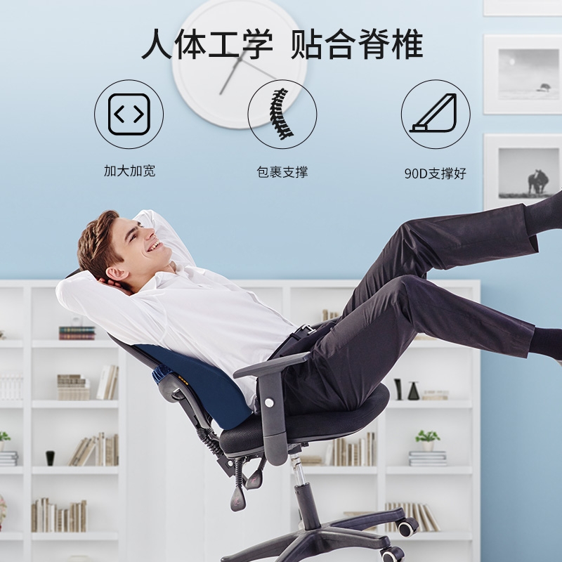 靠垫设计符合人体工程学原理,良好的弹性和支撑性;贴合腰部曲线,背部贴服区增高;对腰椎盘突出腰肌劳损等疾病的预防和康复有积极意义