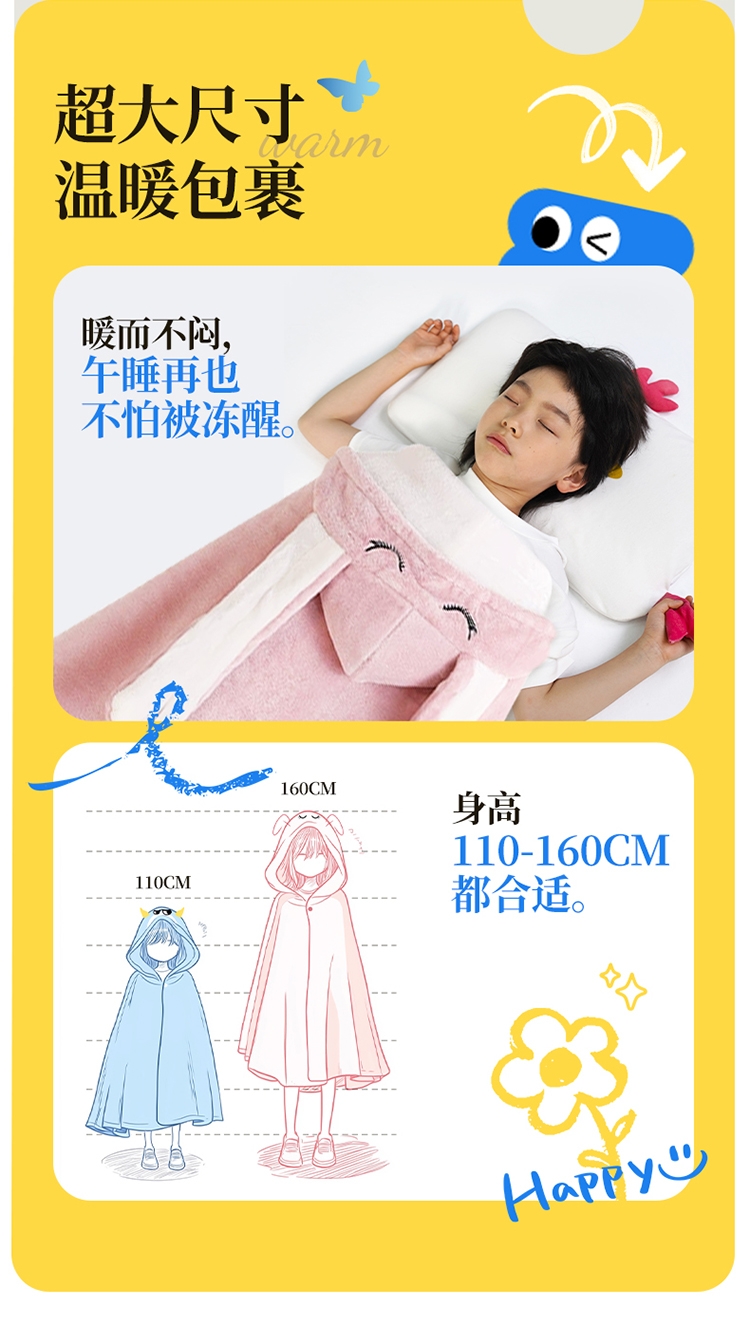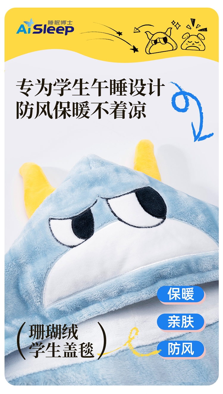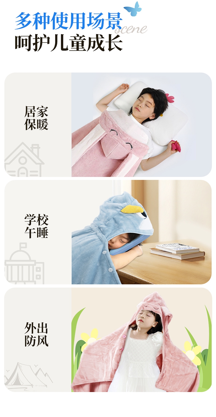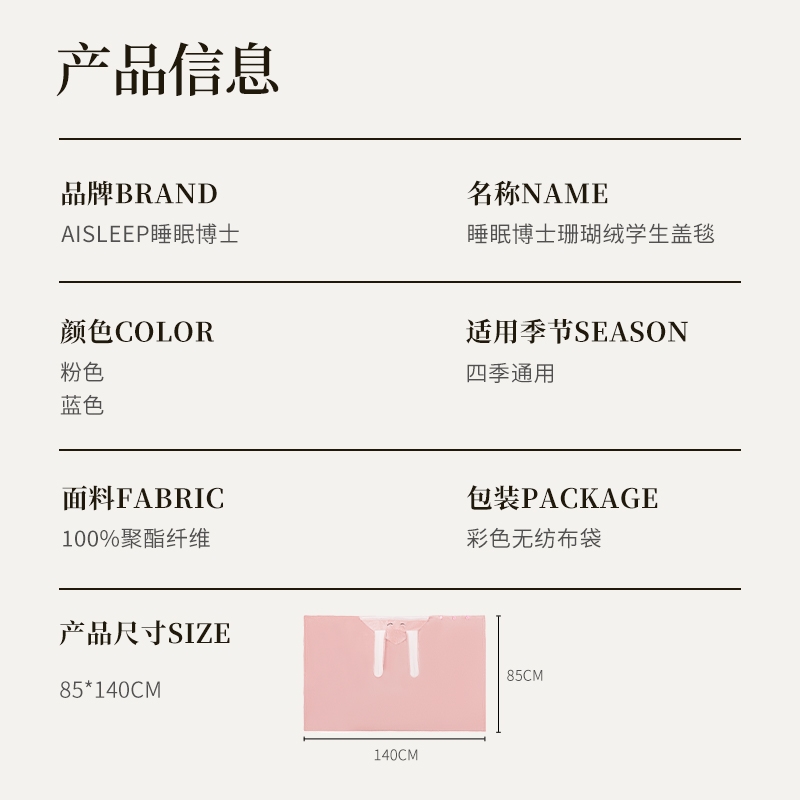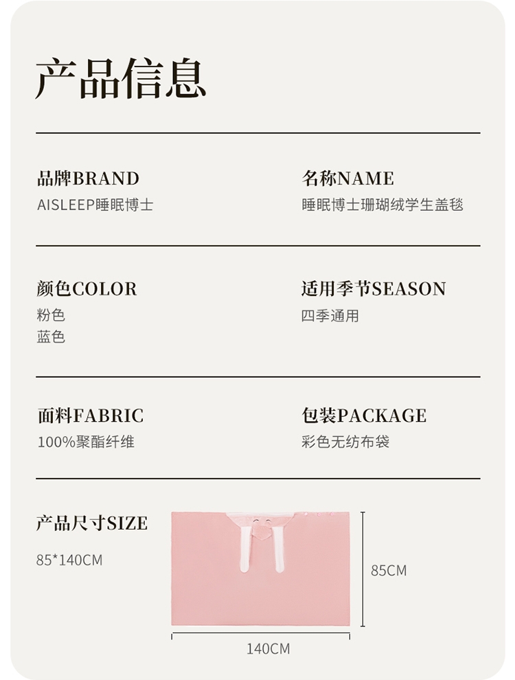 珊瑚绒面料,柔软、舒适、保暖、抗菌或防静电功能;轻便易折叠适合学生不同场所使用(睡毯、披肩或垫子);可机洗,方便学生日常维护