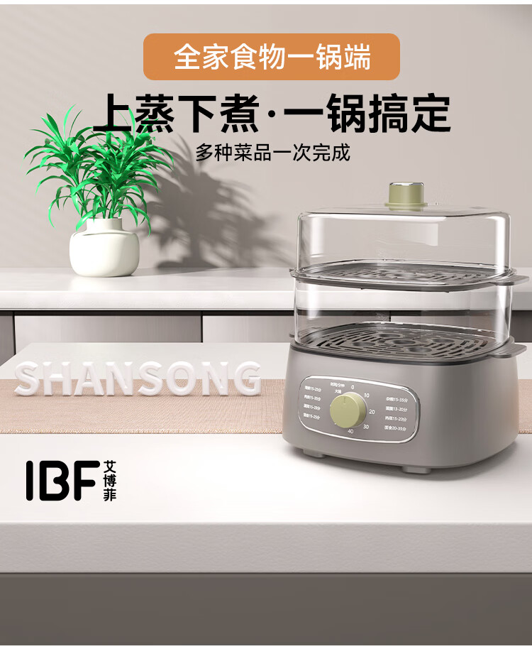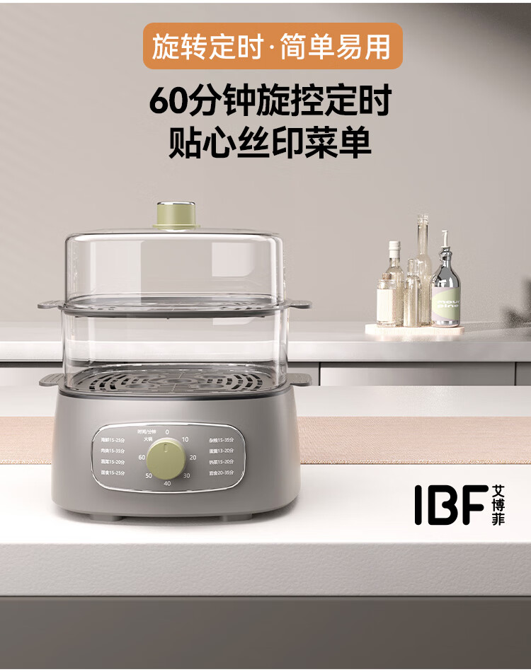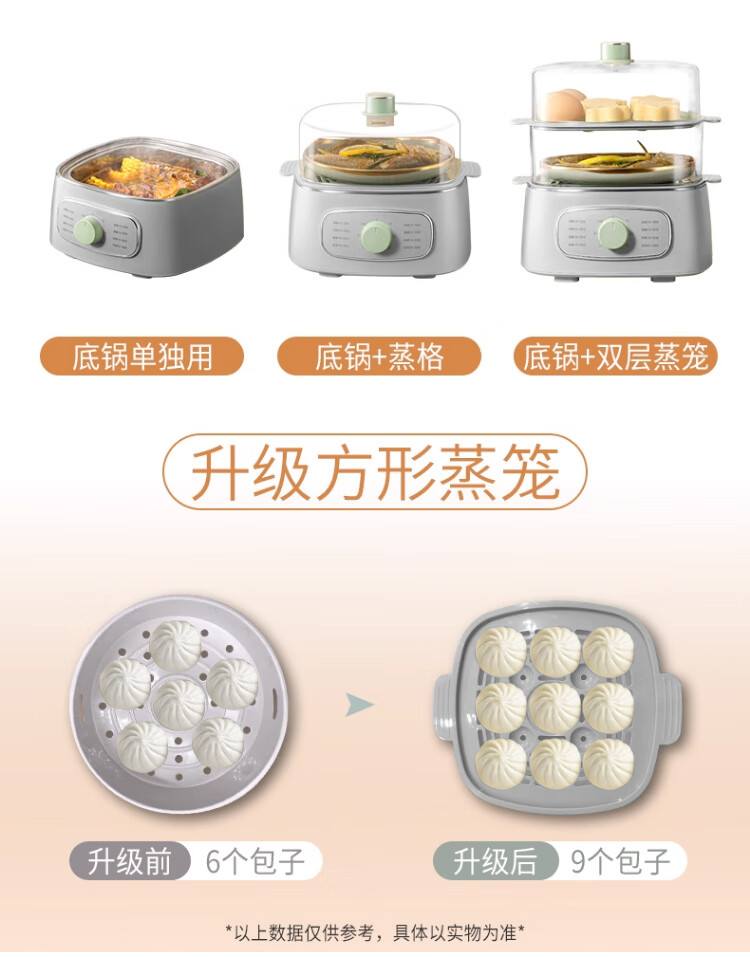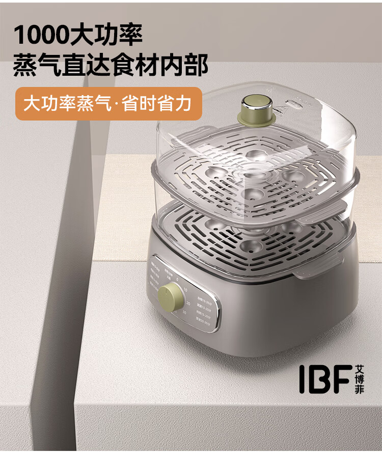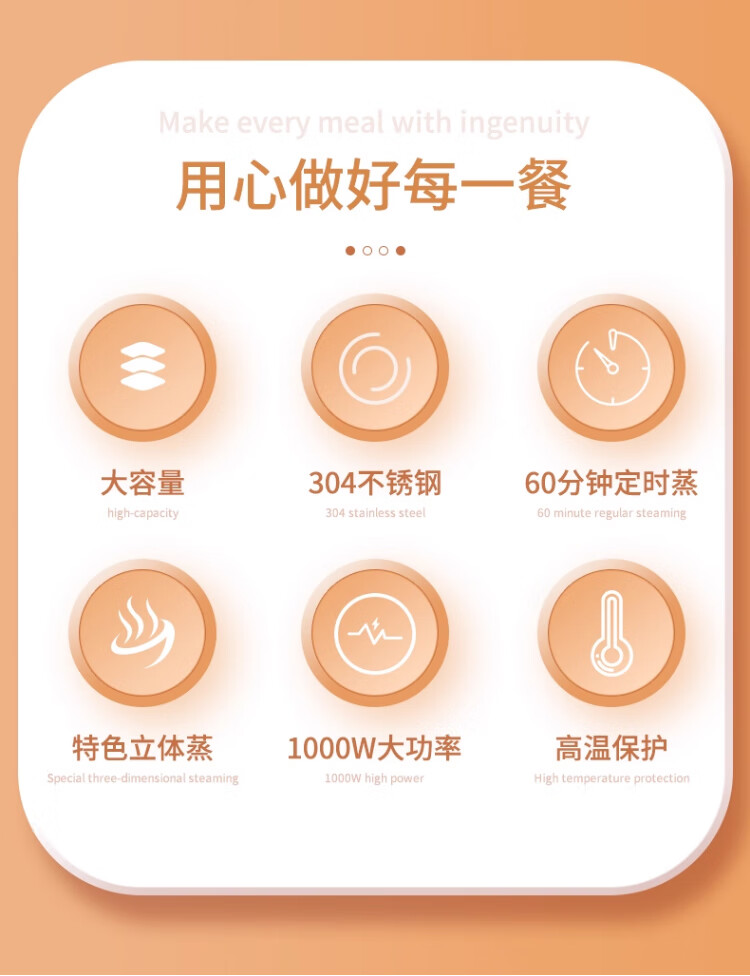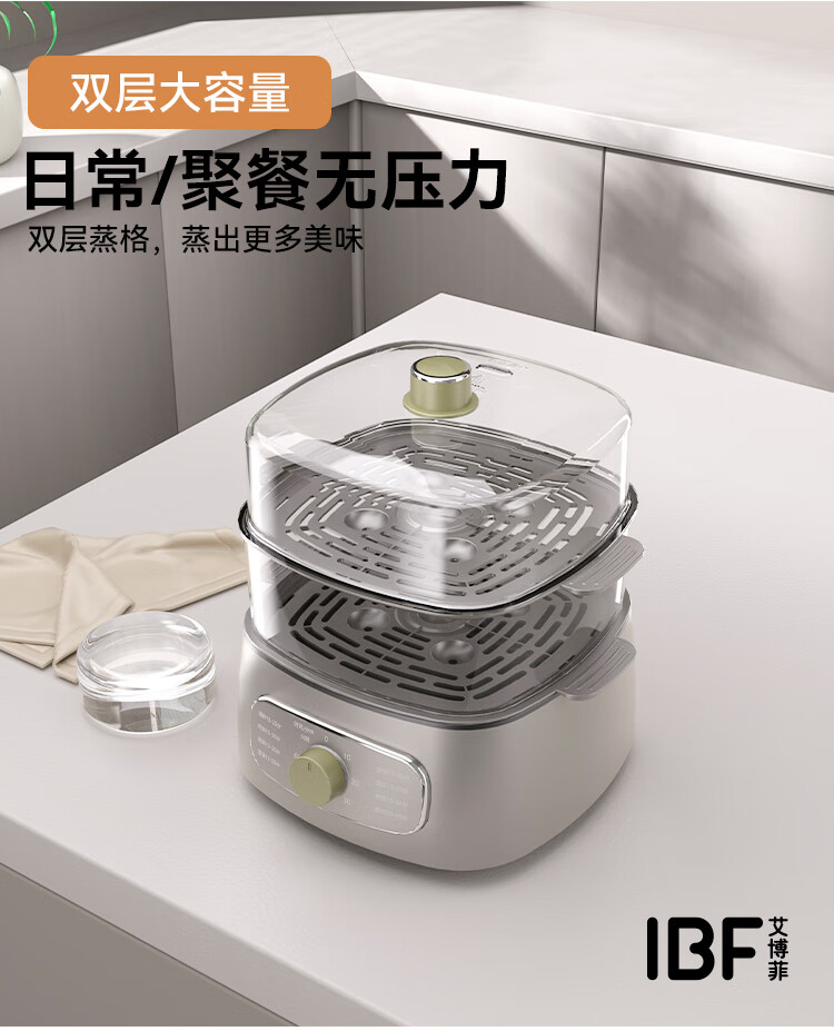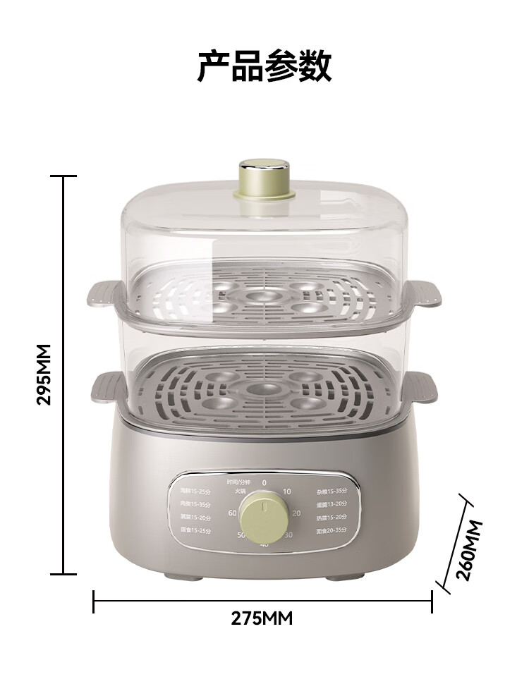 1000W聚能发热速出蒸气 锁鲜锁嫩。;适用3-5人家庭,可整鱼或多层蒸制;蒸汽快且均匀,高端机型常见。