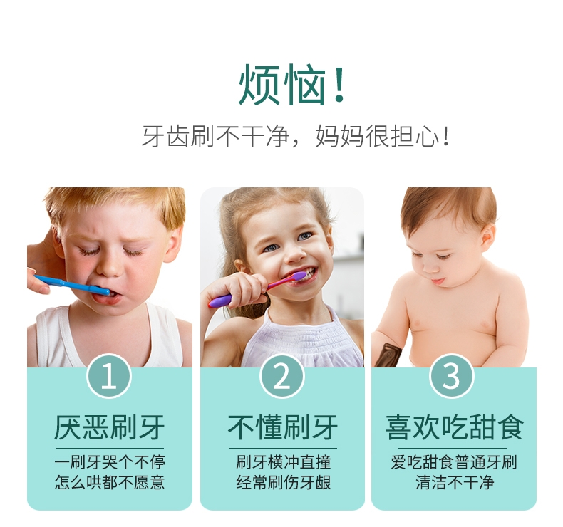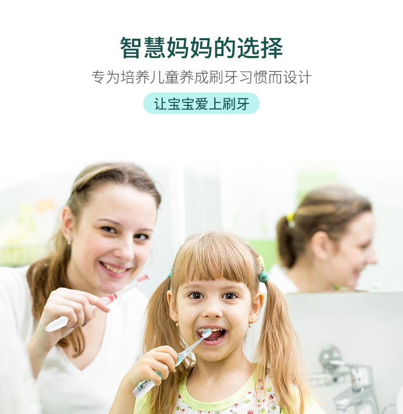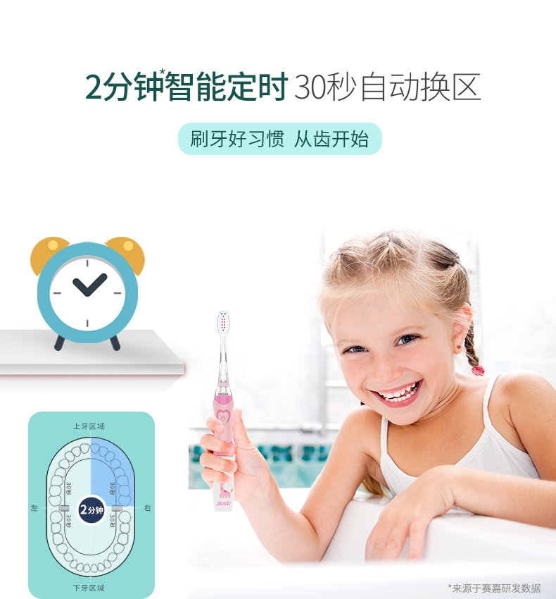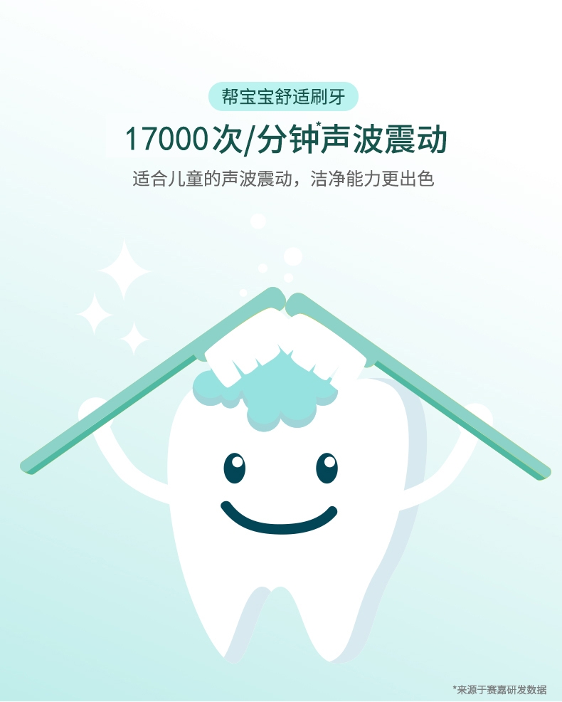 17000次/分钟震动;LED观察灯 帮助查看宝宝口腔情况提前预防;30秒换区提醒 2分钟自动关机
