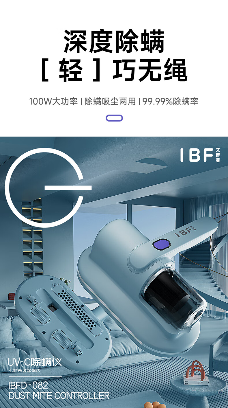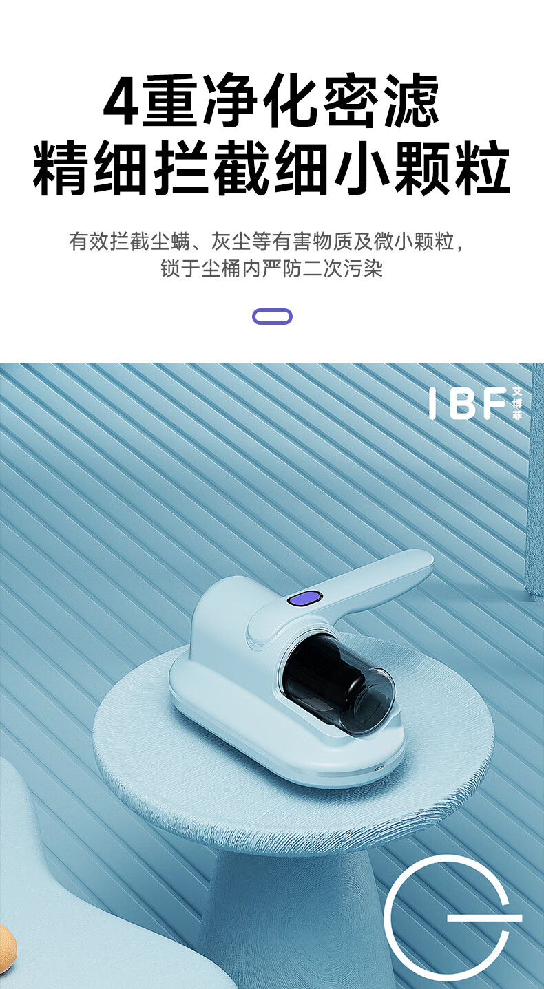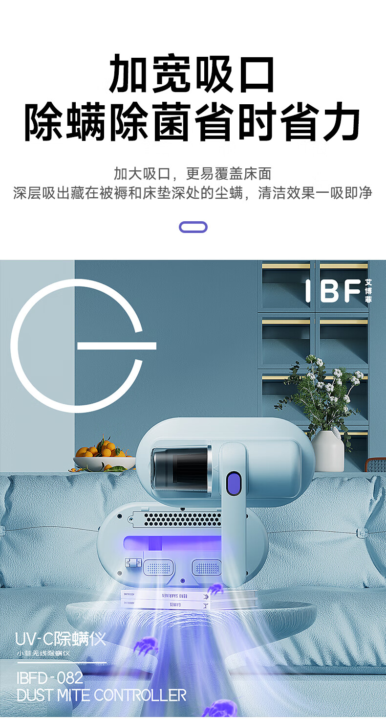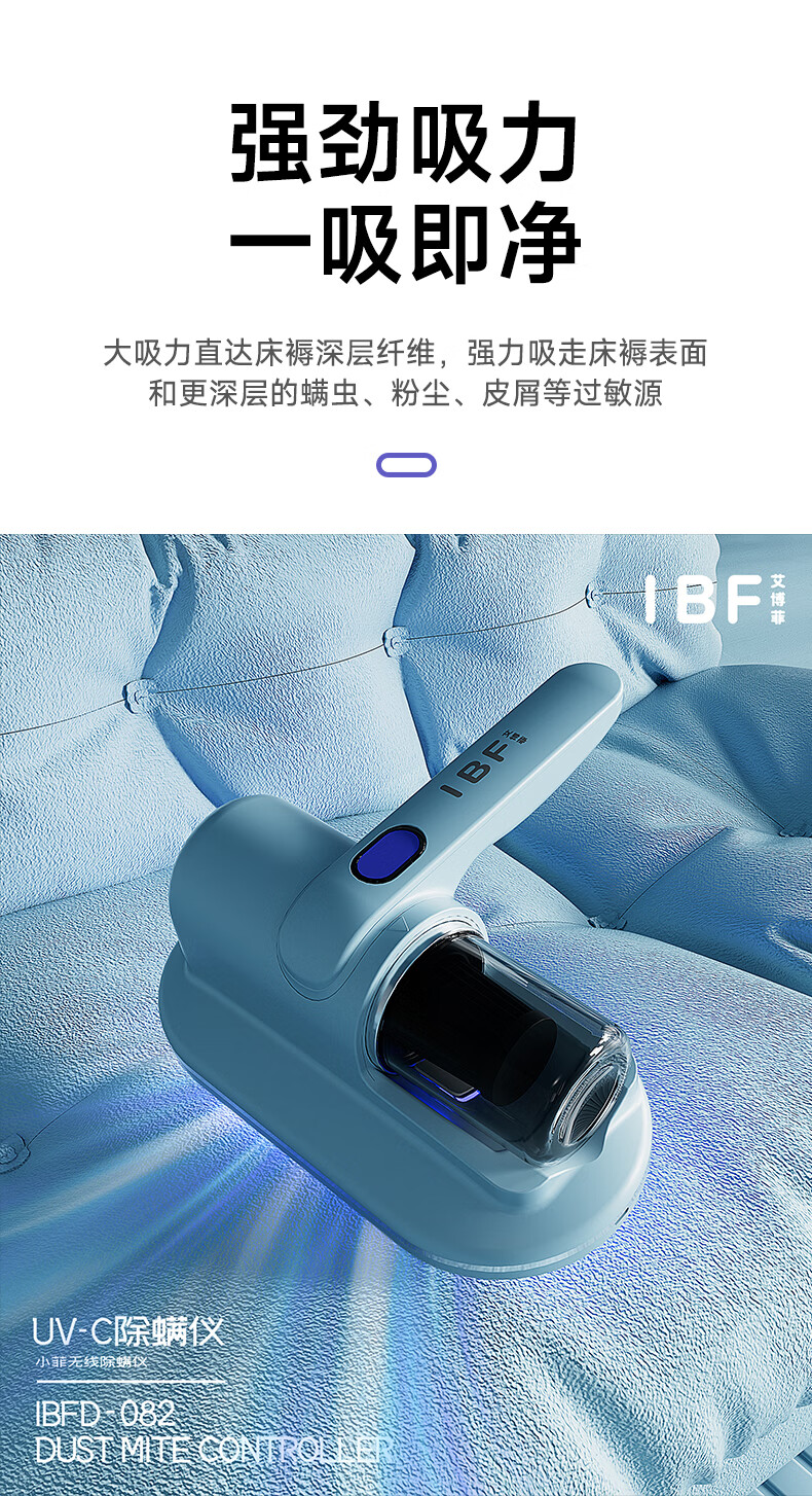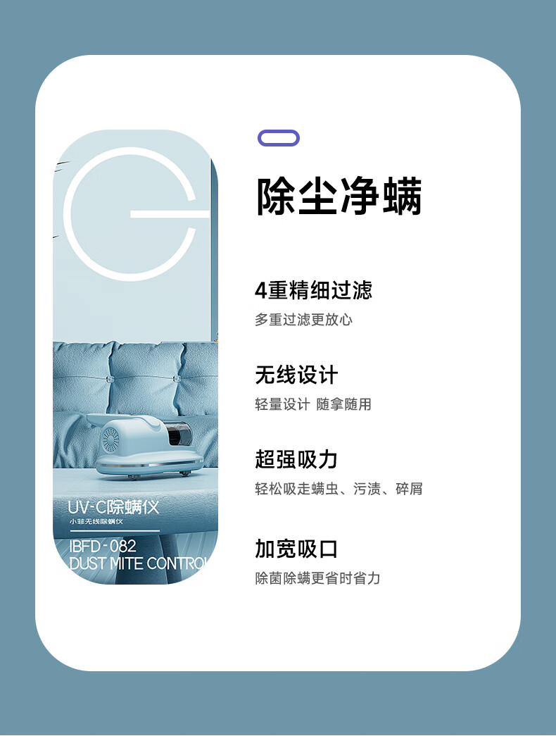 速净除螨,深度清洁,除螨杀菌除湿吸毛一机搞定 ;飓风式吸力,边吸边扫,轻松扫除毛发 ;宽吸口无刷设计,效率提升,快速洗完整个床面