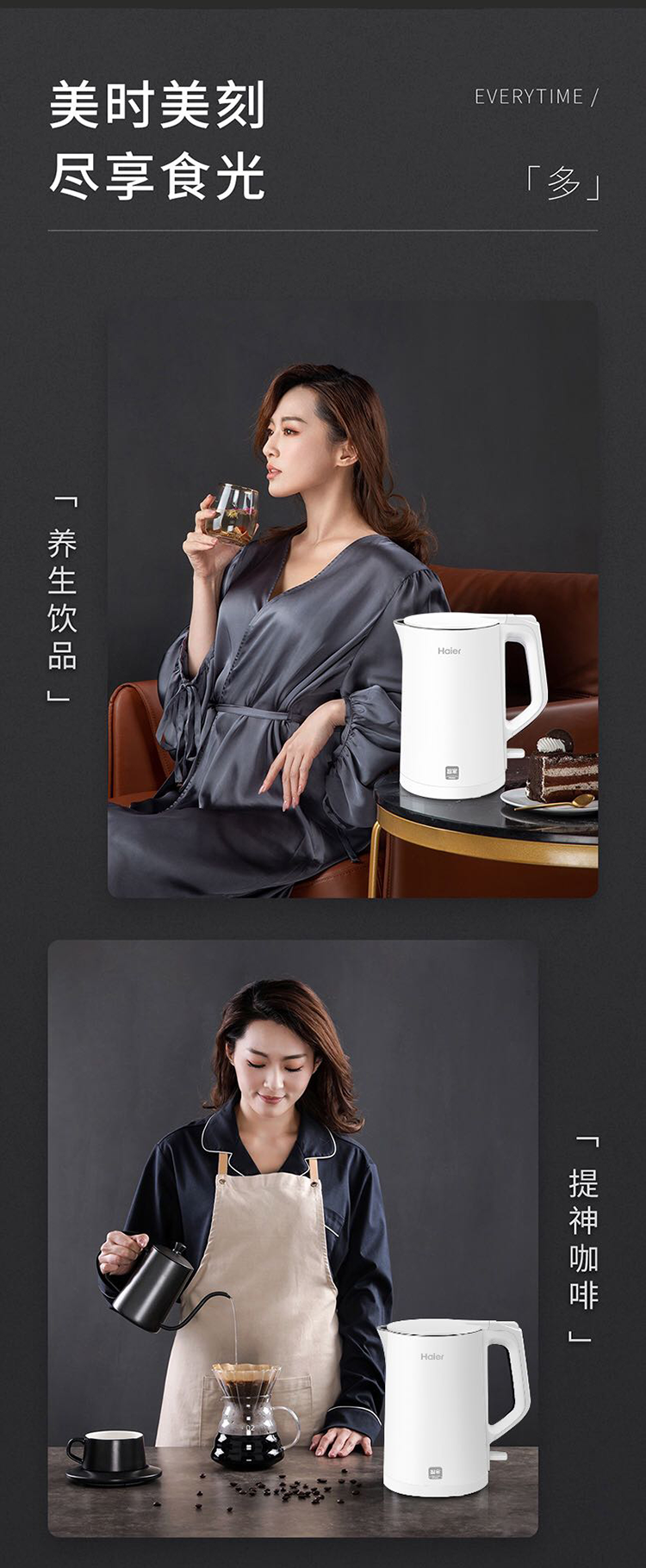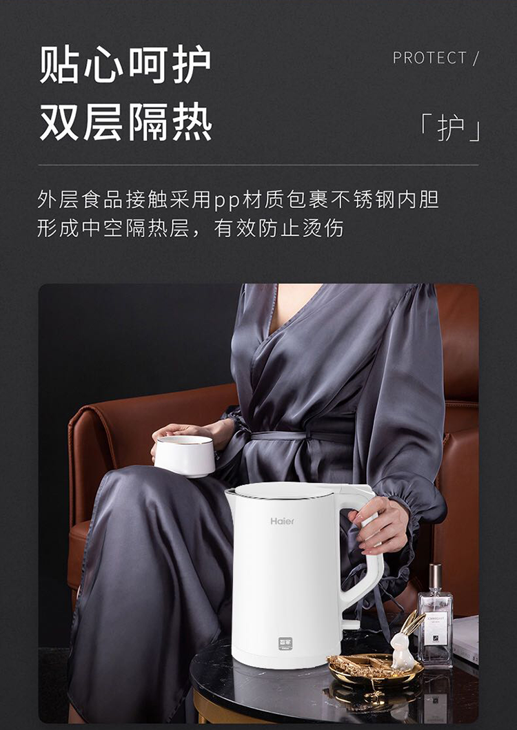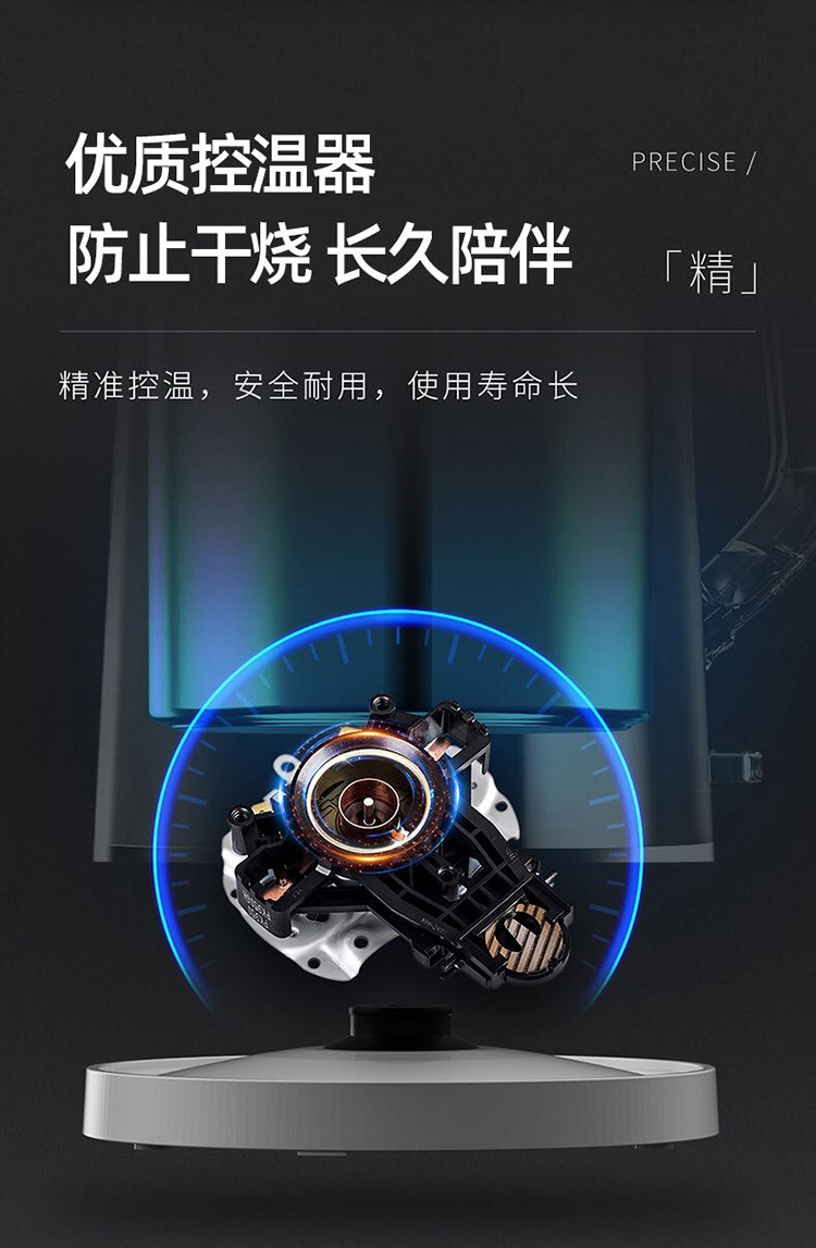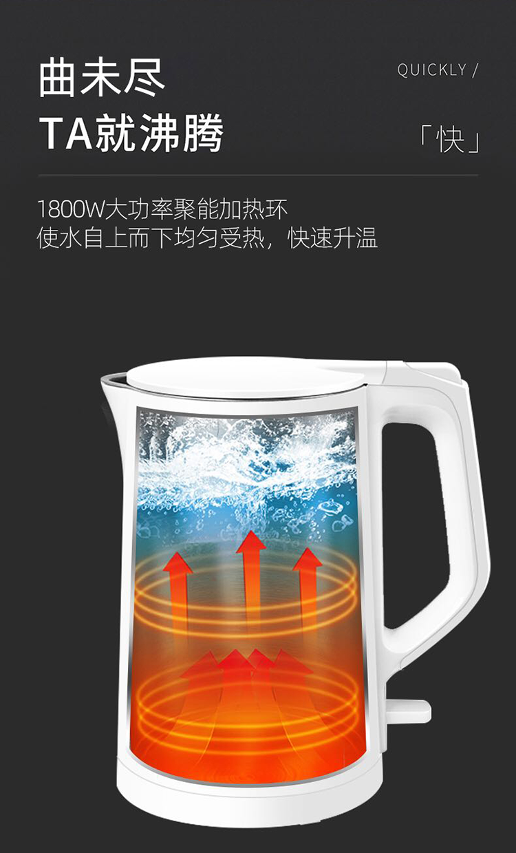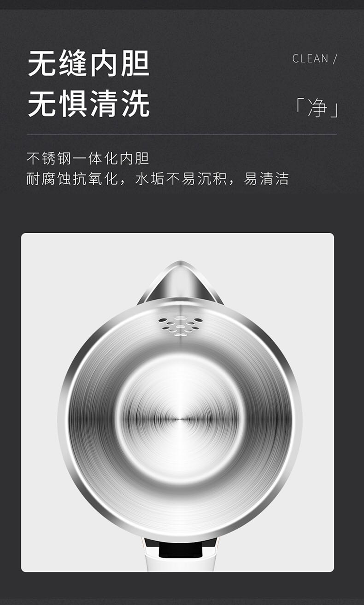 双层防烫,无缝一体式;1.7L大容量,304不锈钢内胆;大功率聚能加热