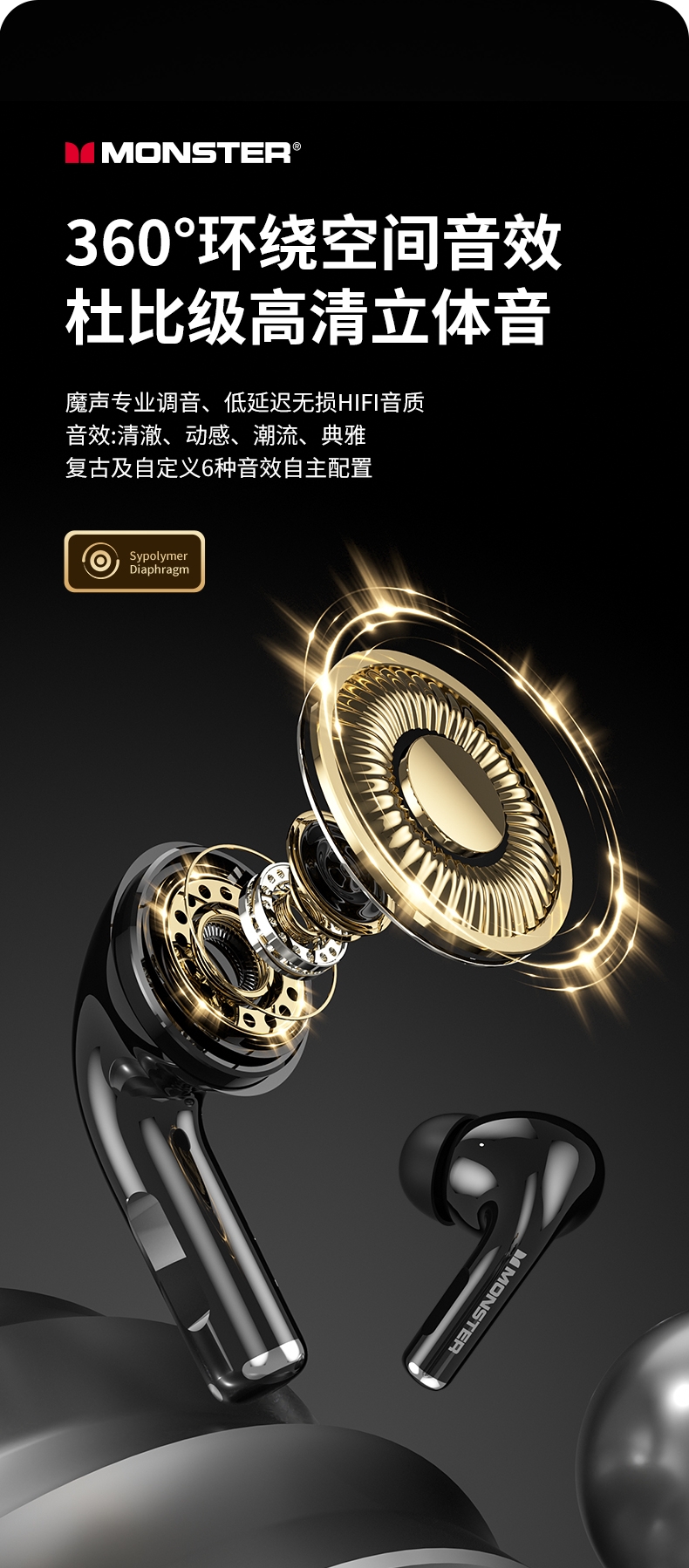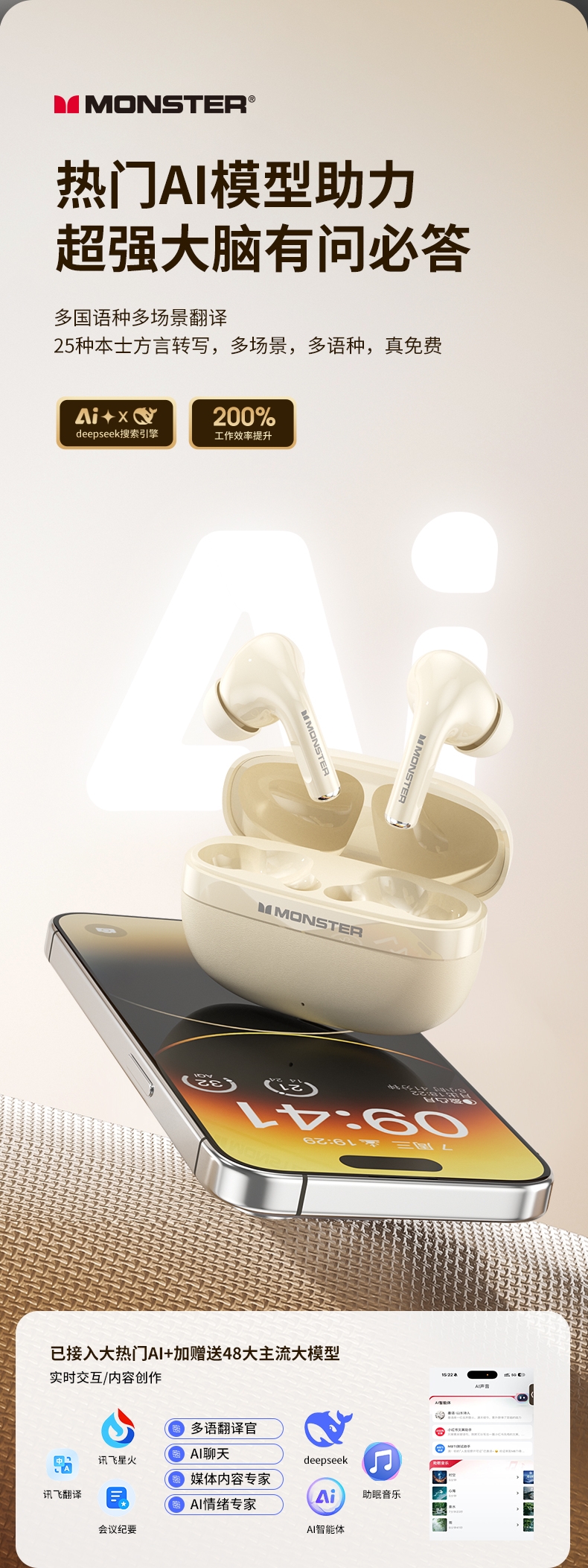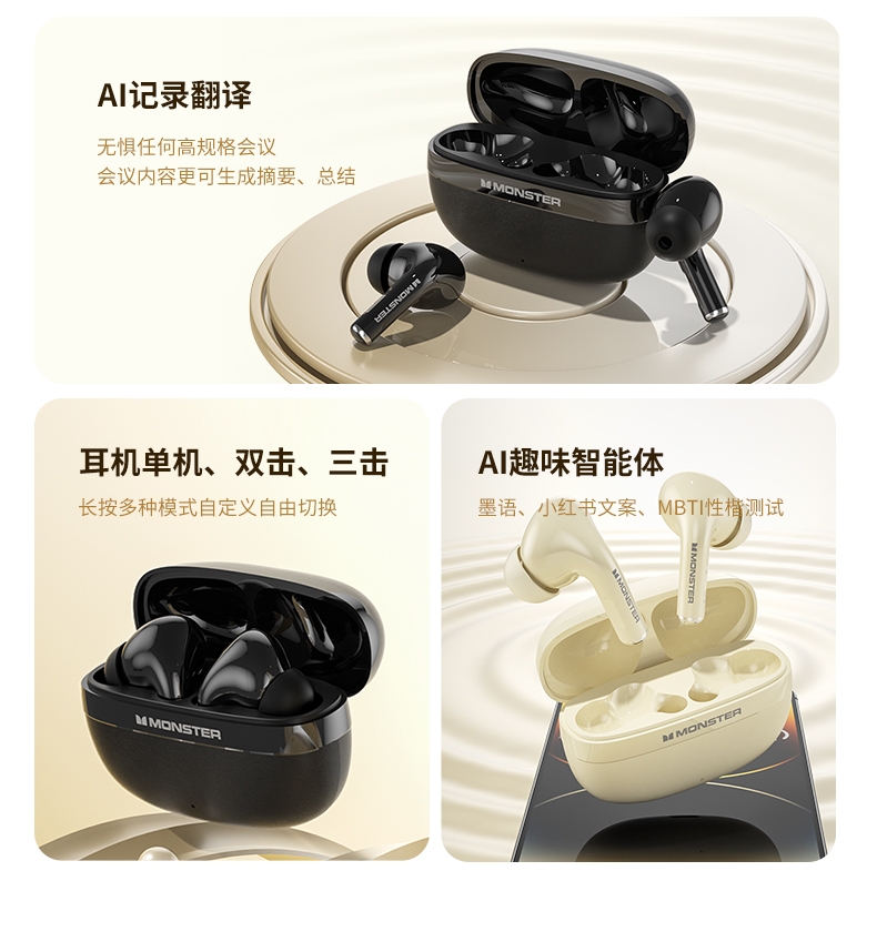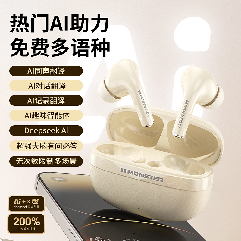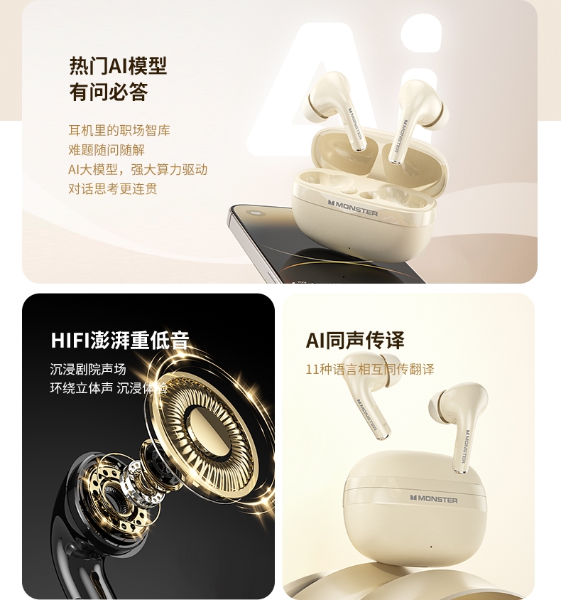 TWS入耳式设计,三频腔体结构,超感还原,杜比听感;智能算法降噪麦克风,高清通话,低延迟,音画同步;专属定制APP,50大热门AI模型助力,AI免费用