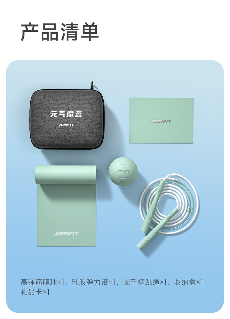 配置清单:高弹筋膜球*1、乳胶弹力带*1、圆手柄跳绳*1、收纳盒*1、礼品卡*1