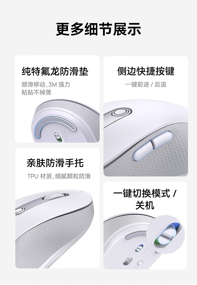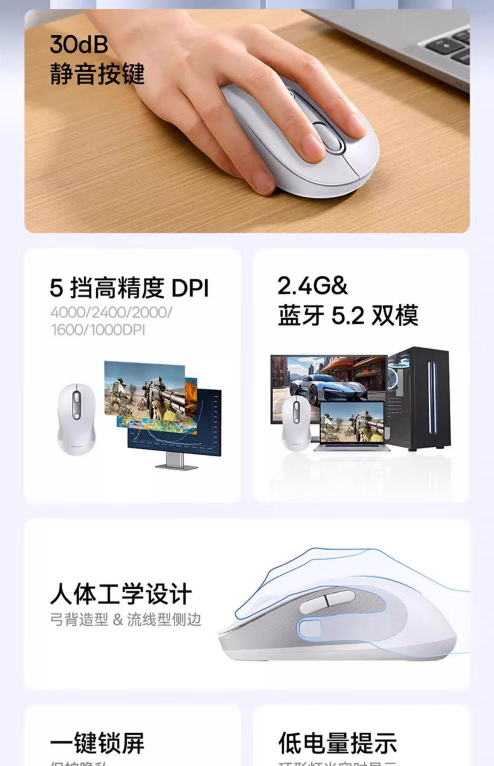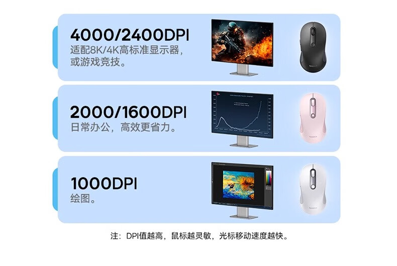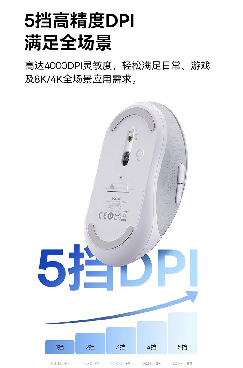 2.4G&蓝牙双模 多设备通用;5挡高精度DPI 满足全场景;自动休眠模式 省电更耐用