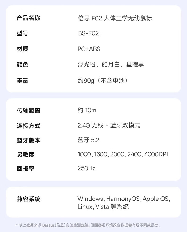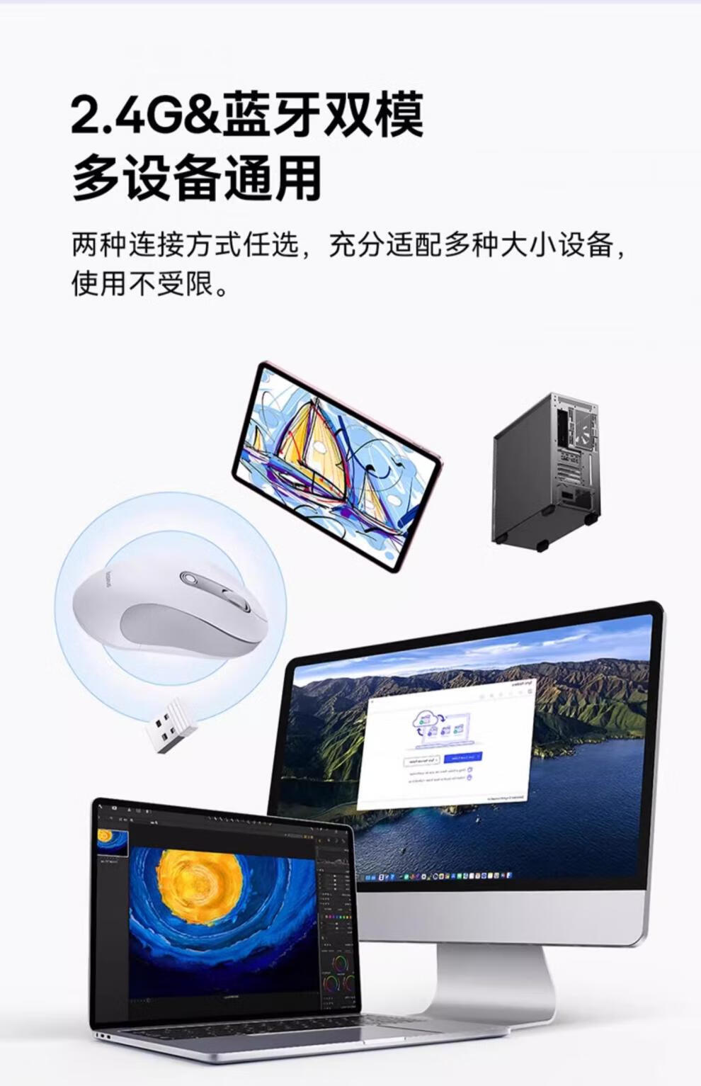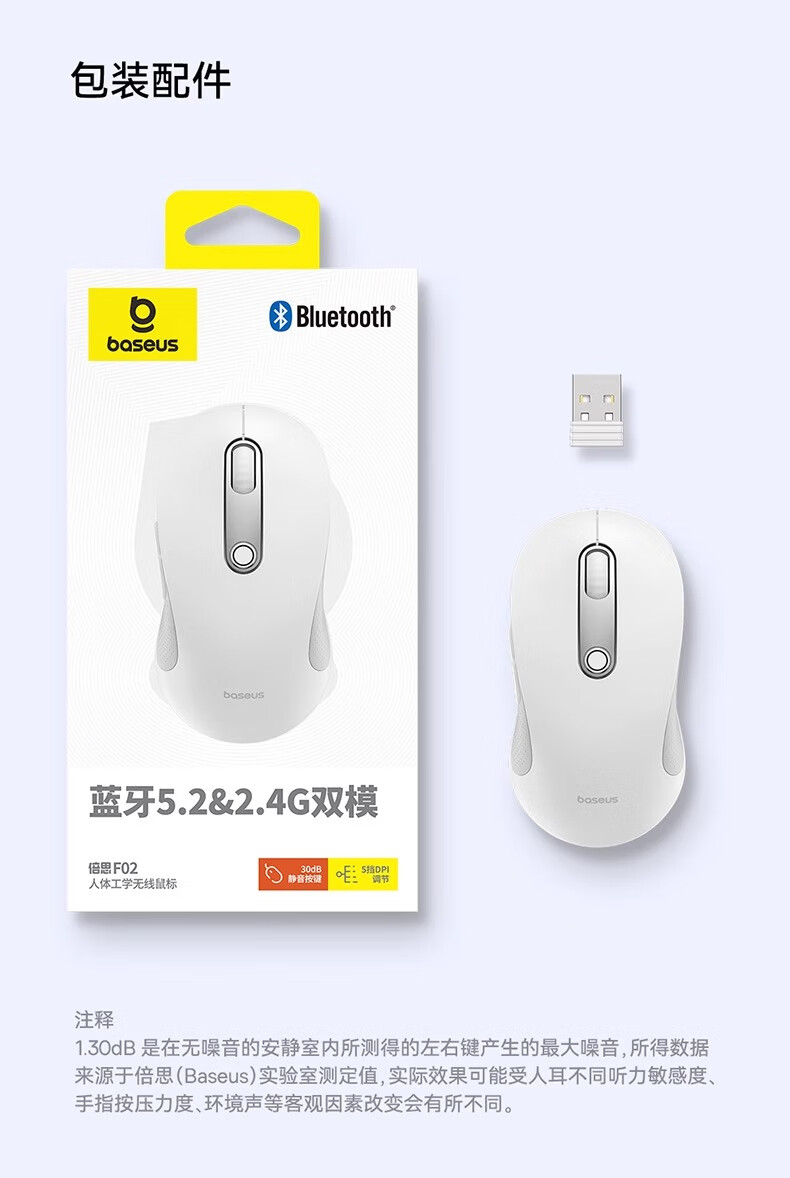 2.4G&蓝牙双模 多设备通用;5挡高精度DPI 满足全场景;自动休眠模式 省电更耐用
