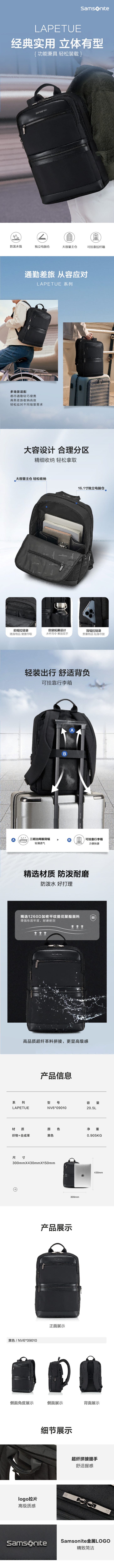 精选1260D加密平纹提花聚酯面料,防泼水,好打理;后置独立电脑仓,可装16.1寸电脑;轻装出行,舒适背负,可挂靠行李箱