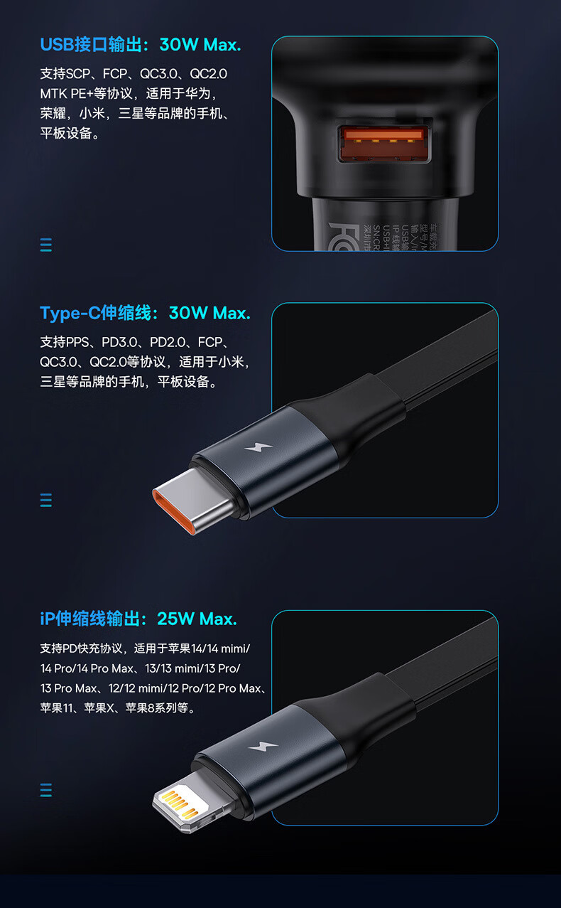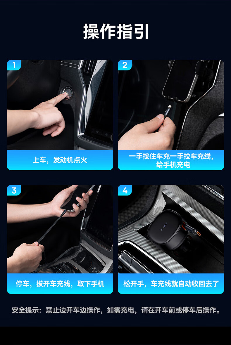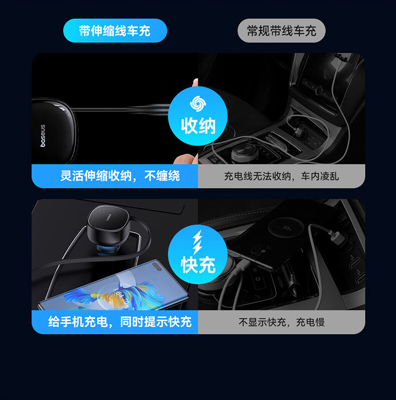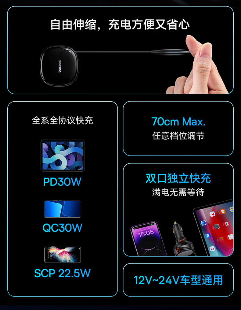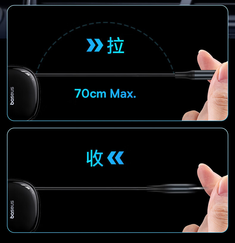 伸缩自如 松开手 自动收纳;夜晚充电 一眼能看见;加长防滑弹片 不怕颠簸弹出