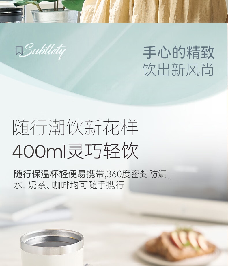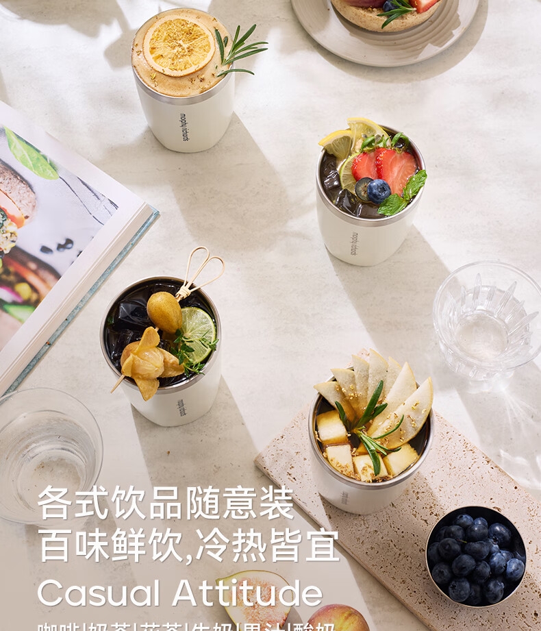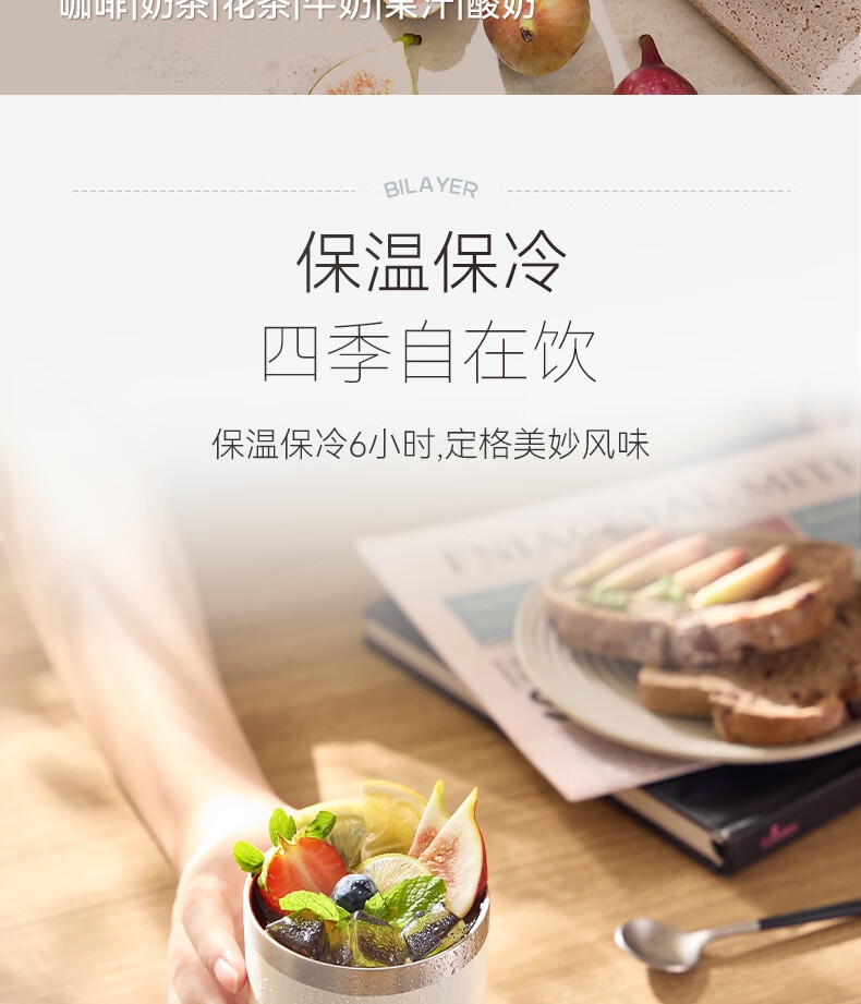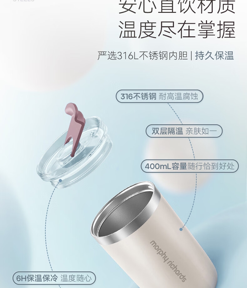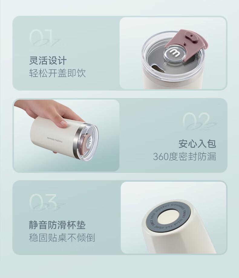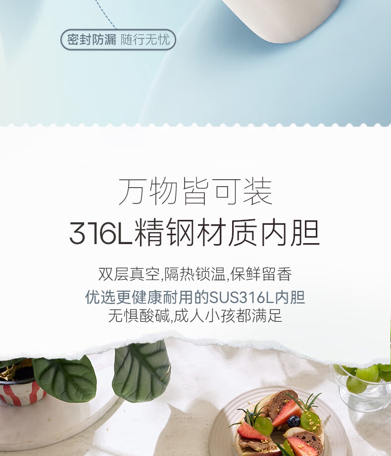 食品级耐高温材质,翻盖即饮;不锈钢316L材质,耐高温酸碱;时尚美观