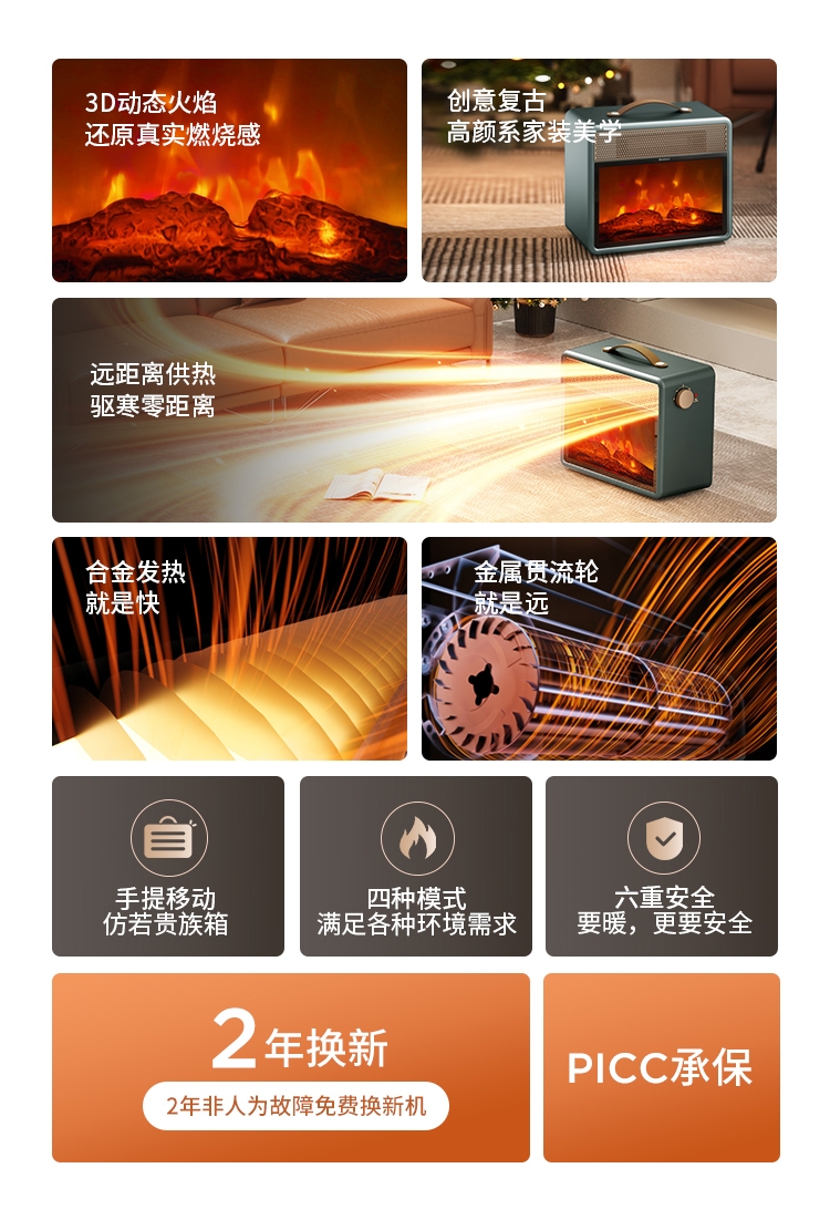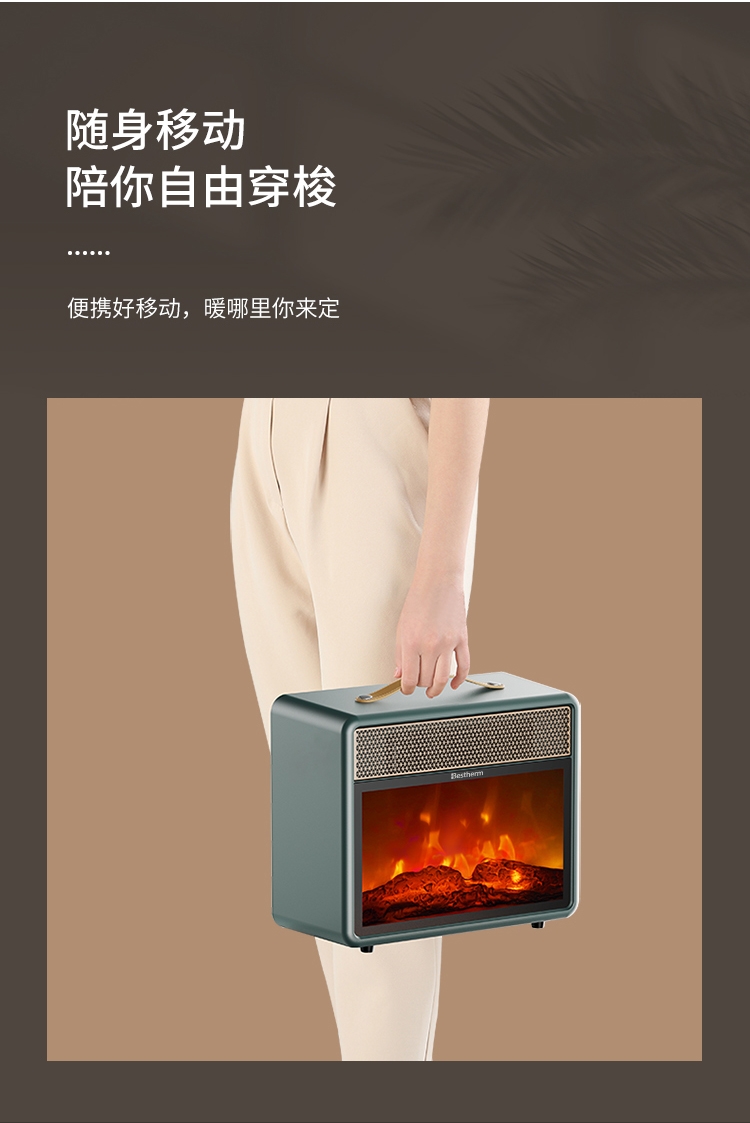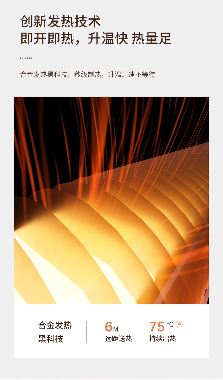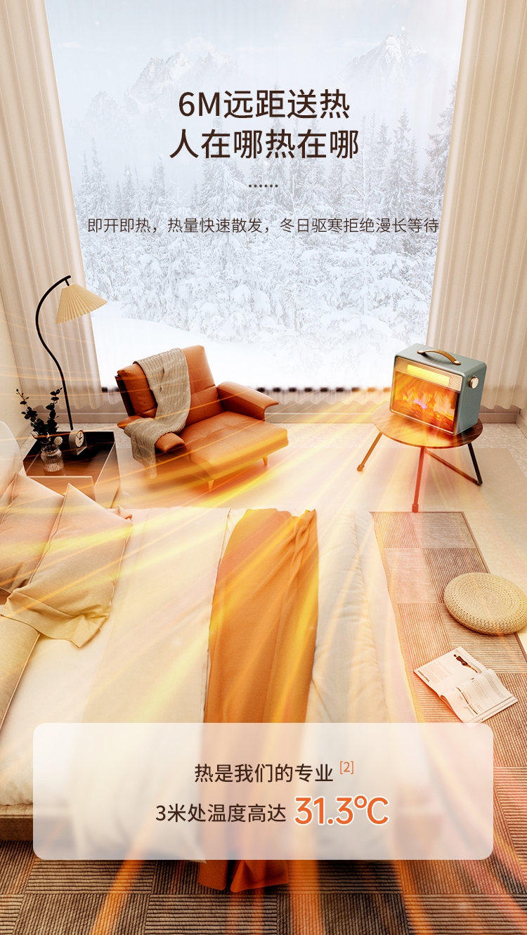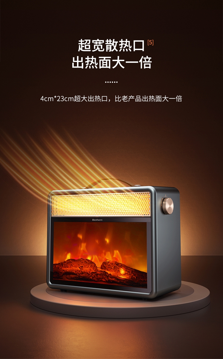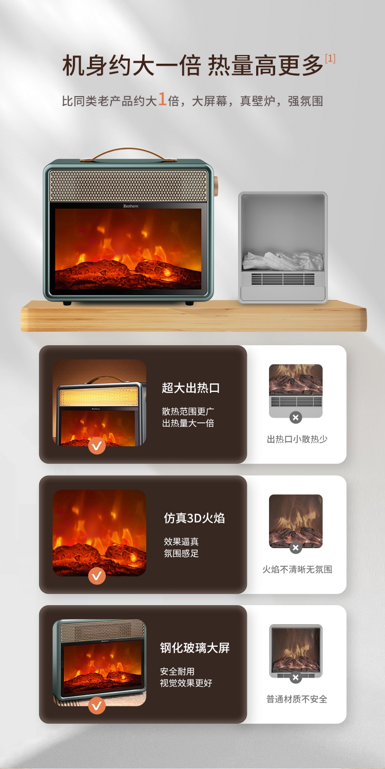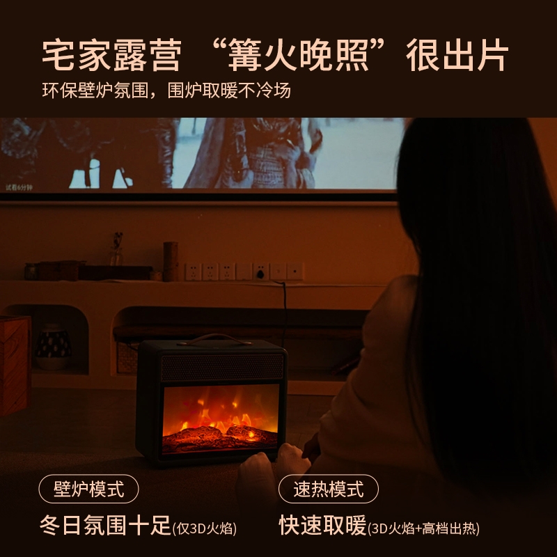仿真3D动态火焰,还原篝火烈焰氛围感;机身比同类老产品约大一倍,热量高更多;即开即热,6米远距送热