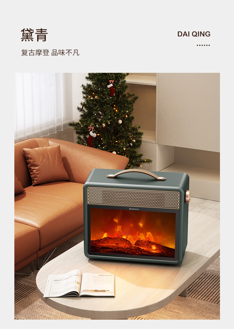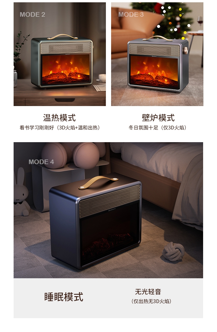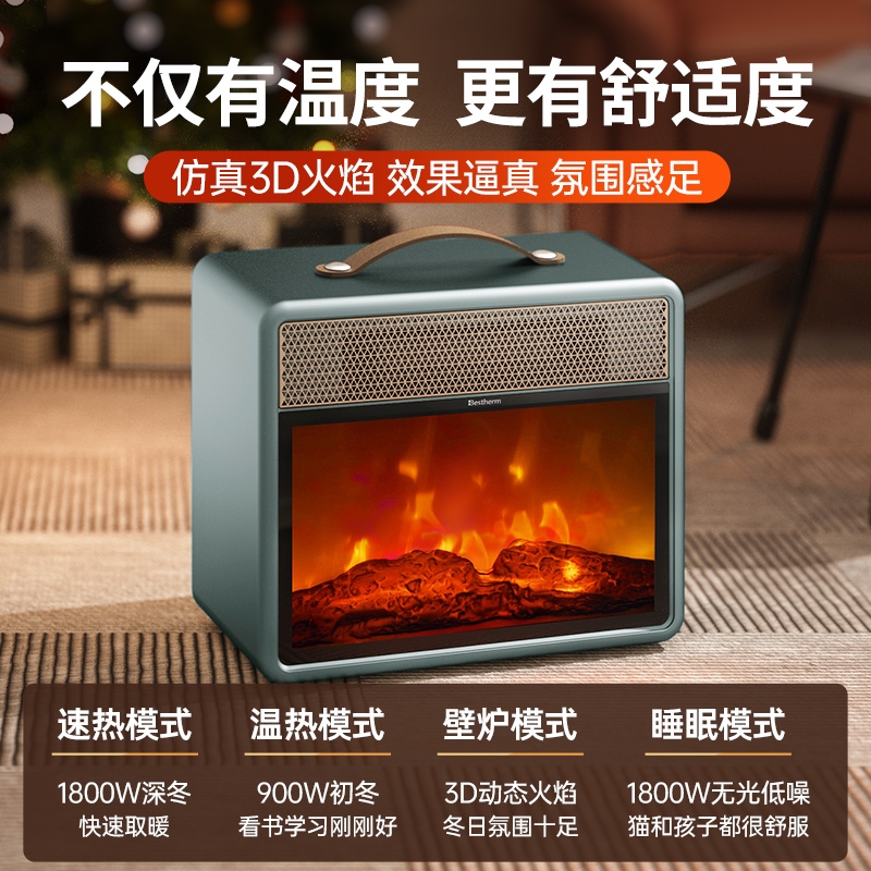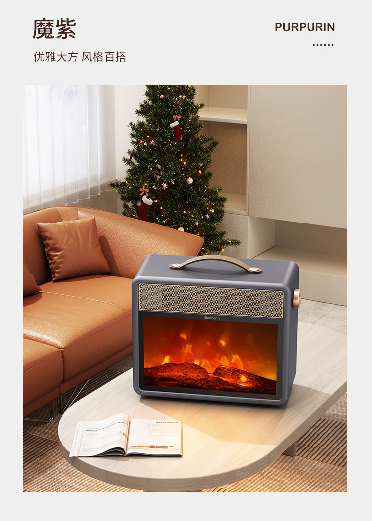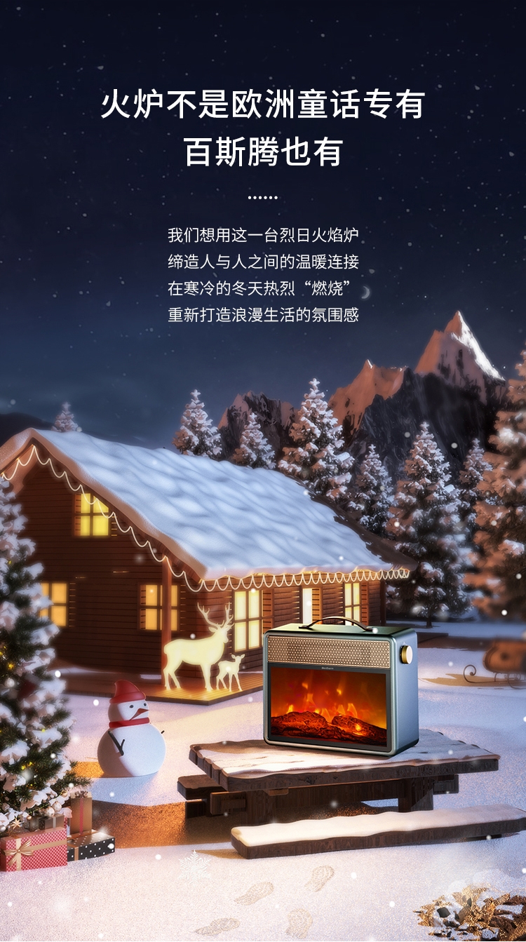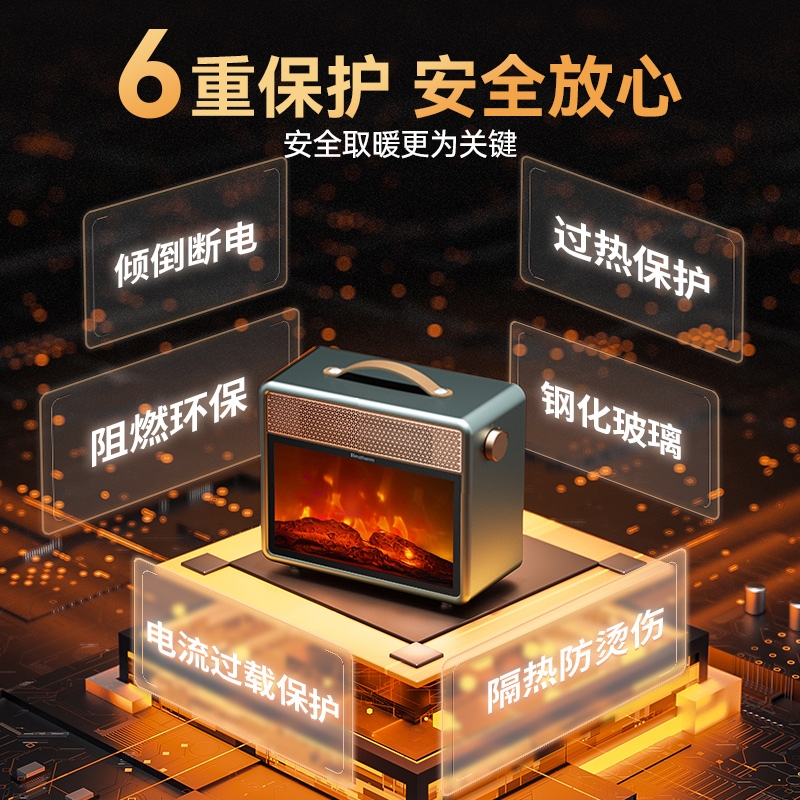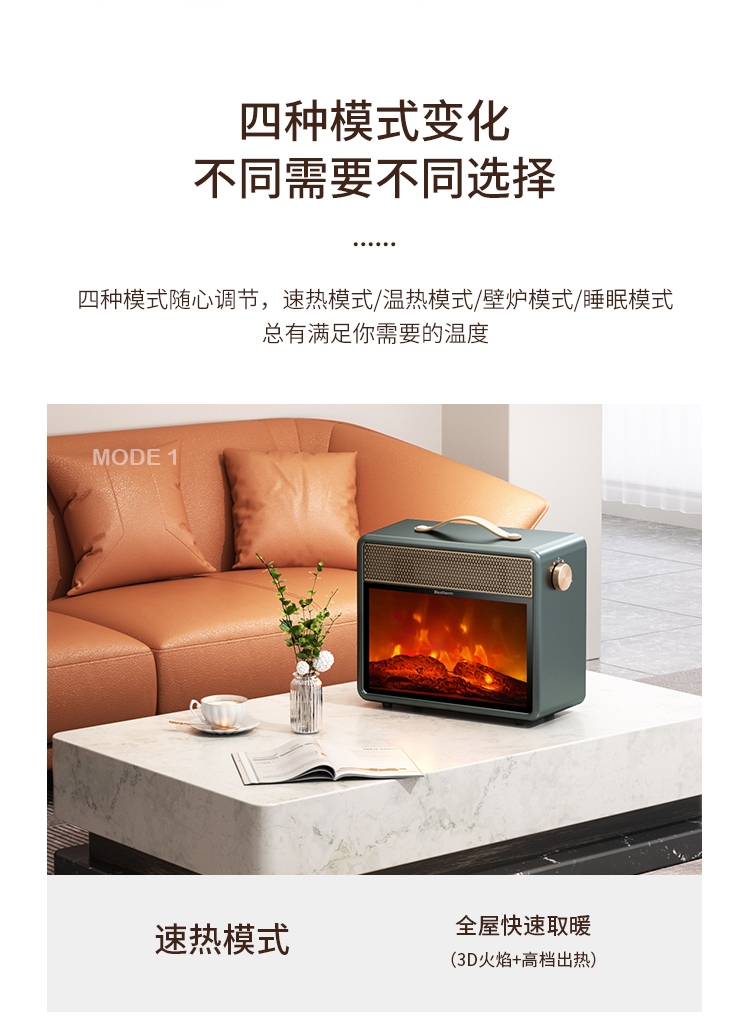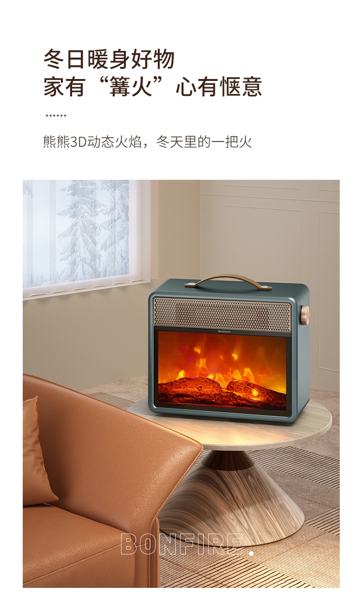 仿真3D动态火焰,还原篝火烈焰氛围感;机身比同类老产品约大一倍,热量高更多;即开即热,6米远距送热