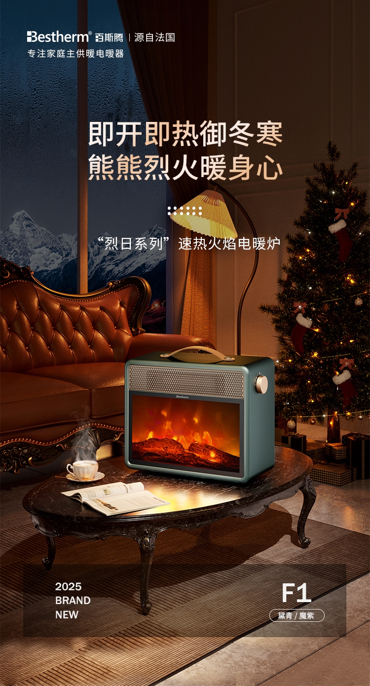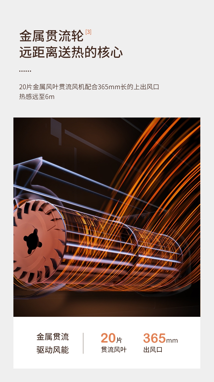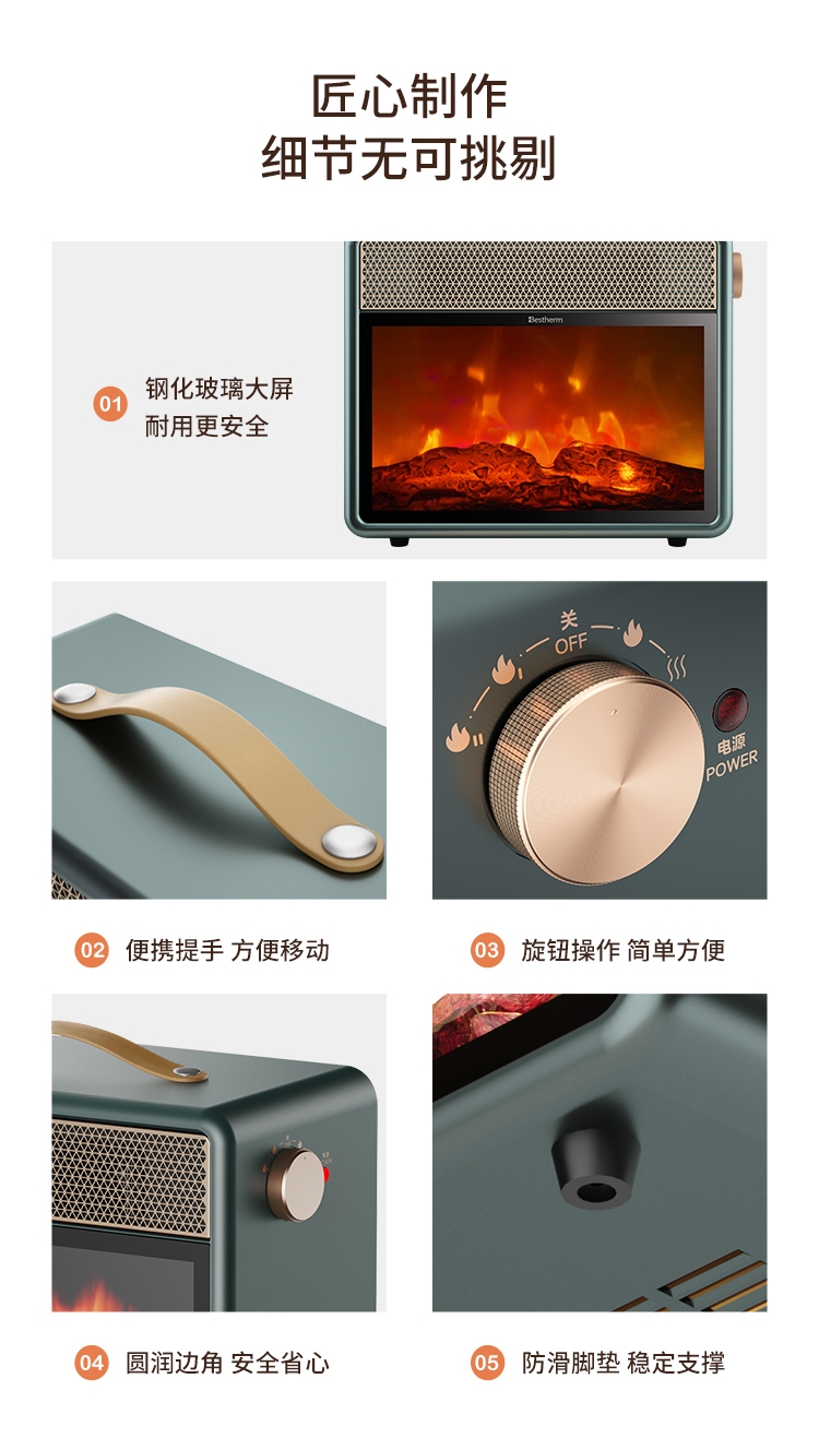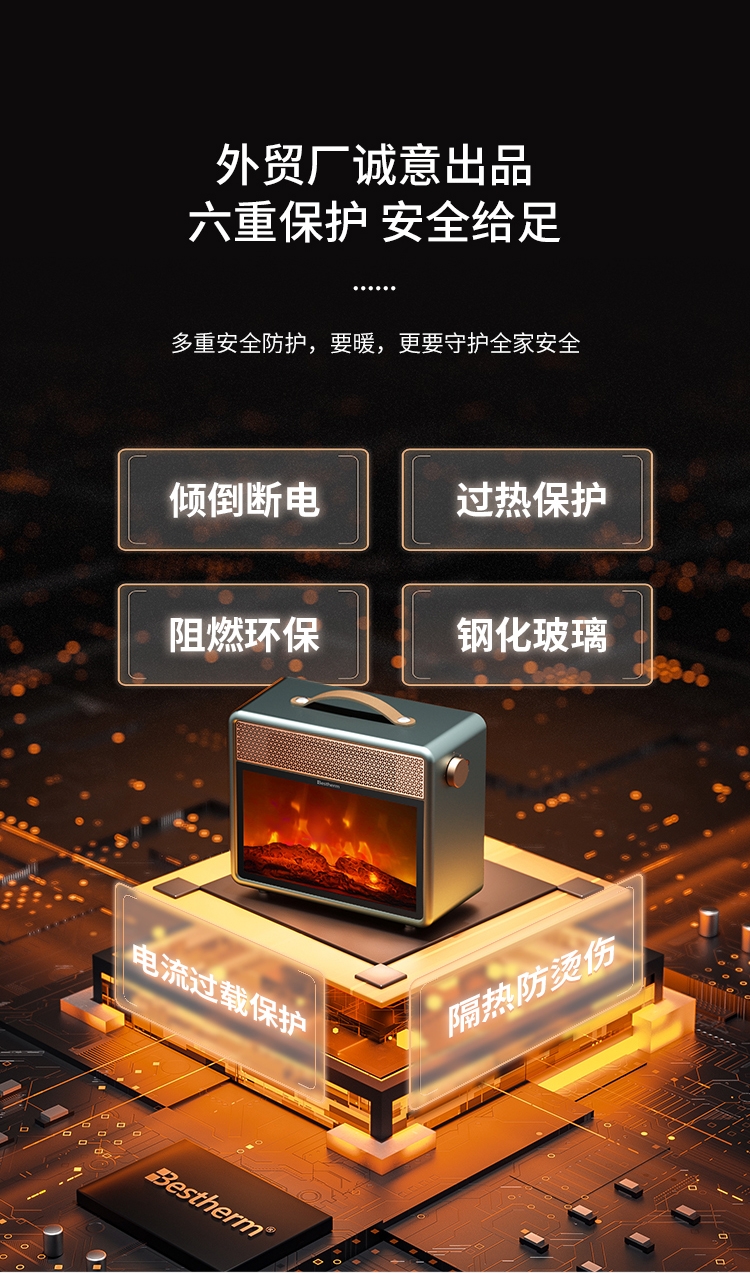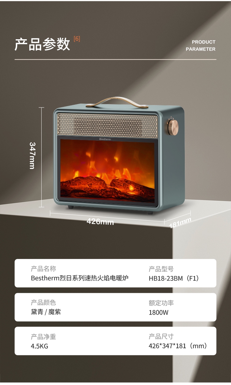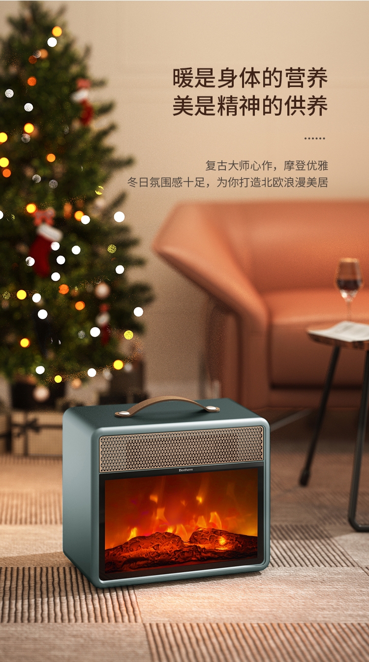 仿真3D动态火焰,还原篝火烈焰氛围感;机身比同类老产品约大一倍,热量高更多;即开即热,6米远距送热