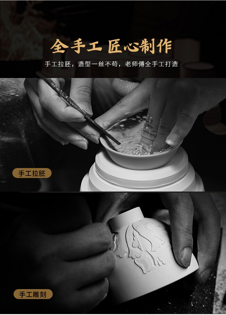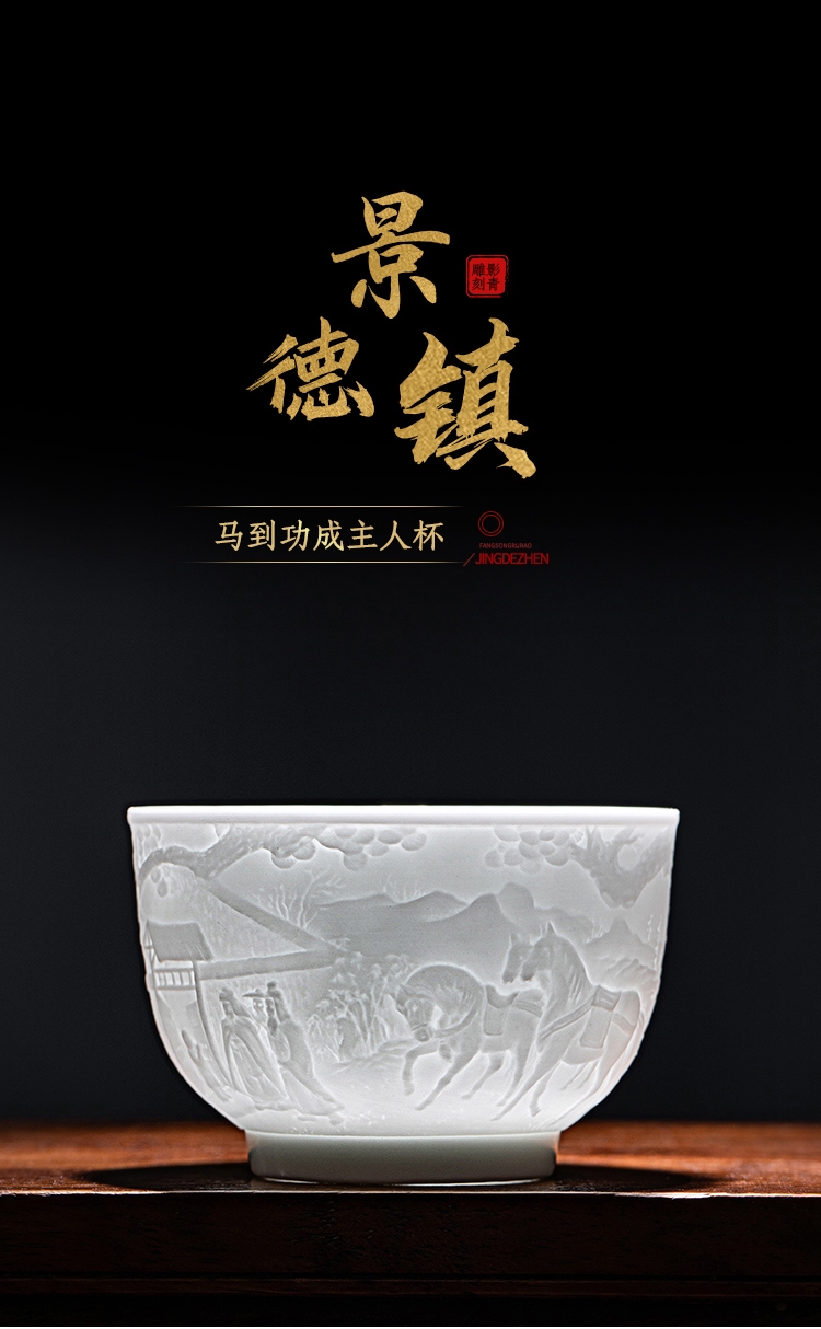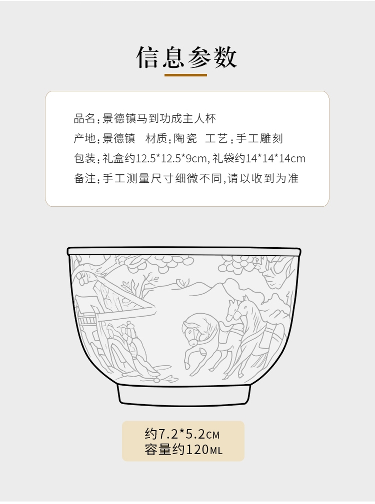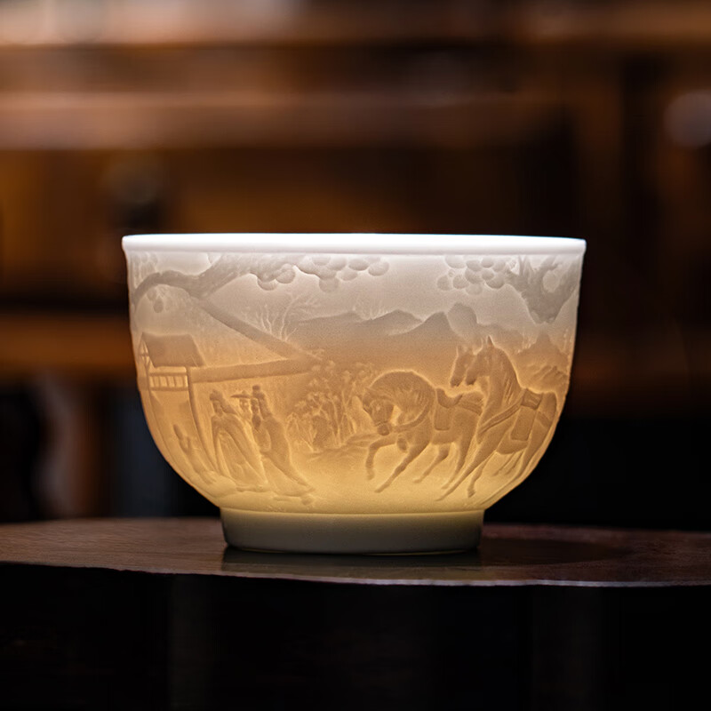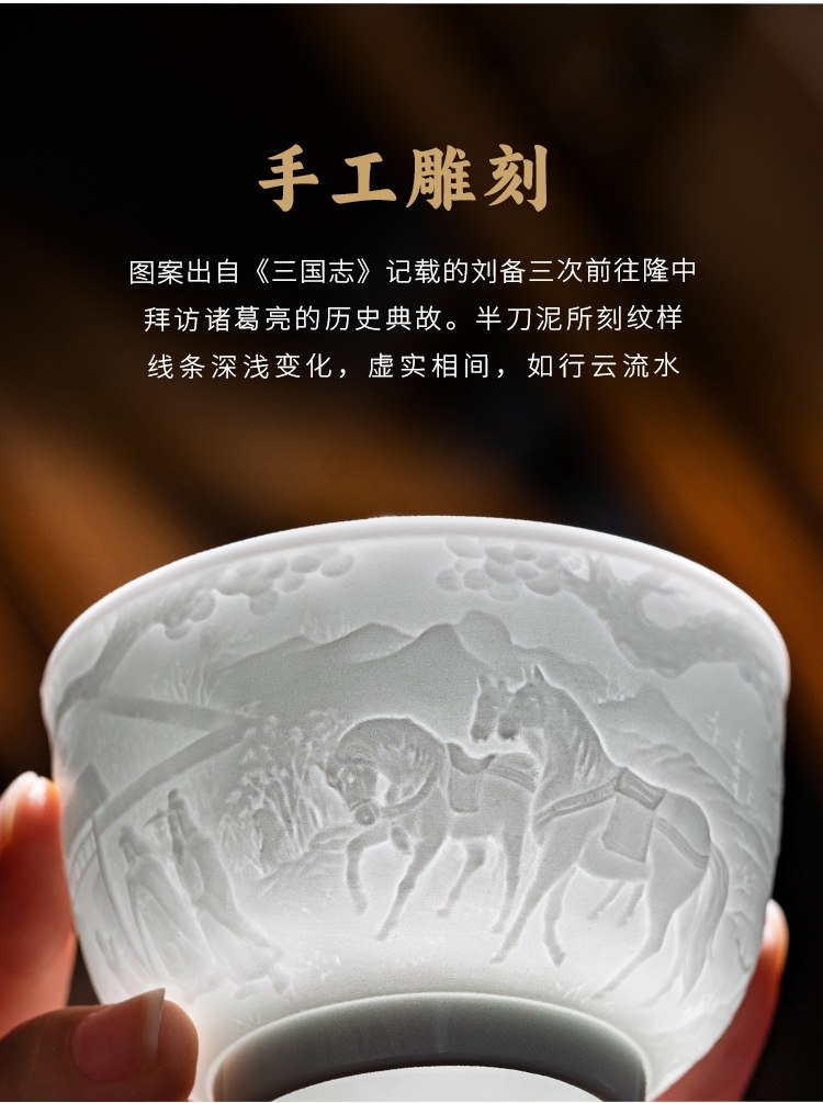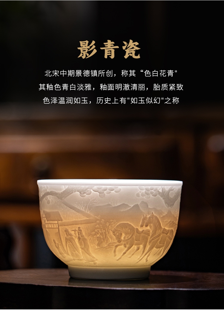 景德镇手工影青瓷 釉面清澈 质地紧致 青白淡雅;手工雕刻 线条深浅变化 虚实相间 如行云流水;图案来源历史典故 文化底蕴深厚 送礼更显心意