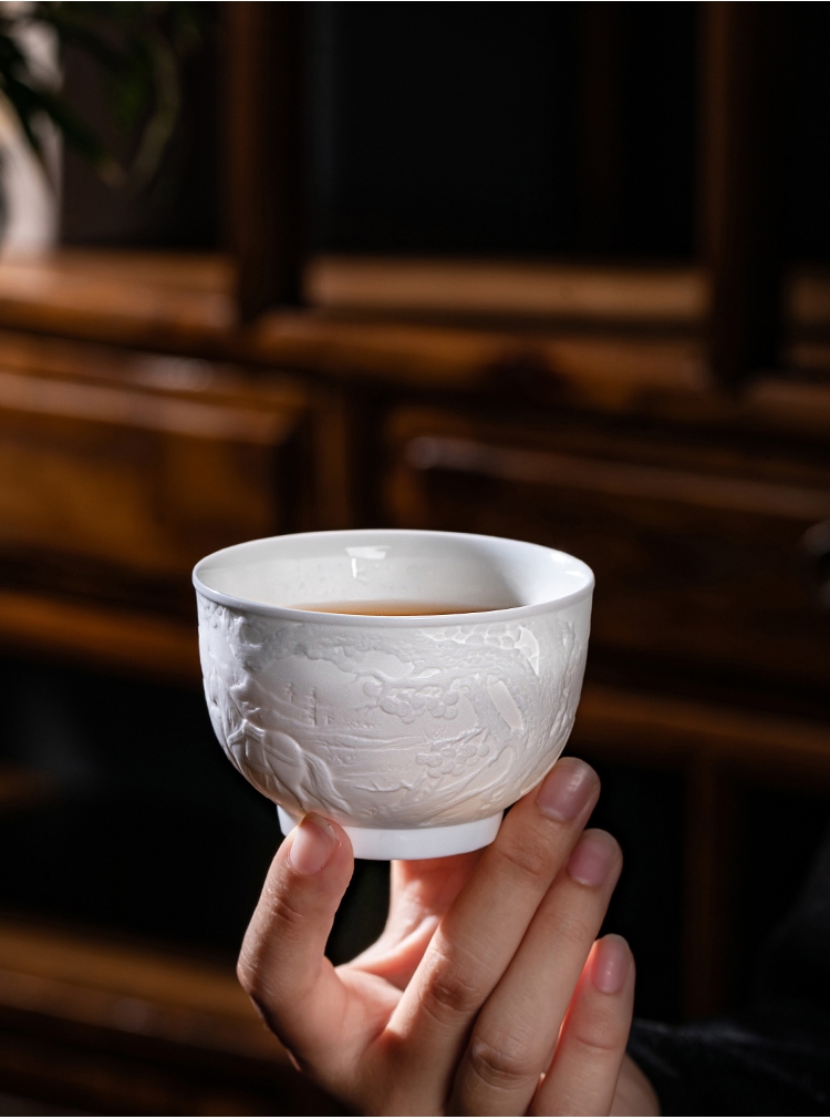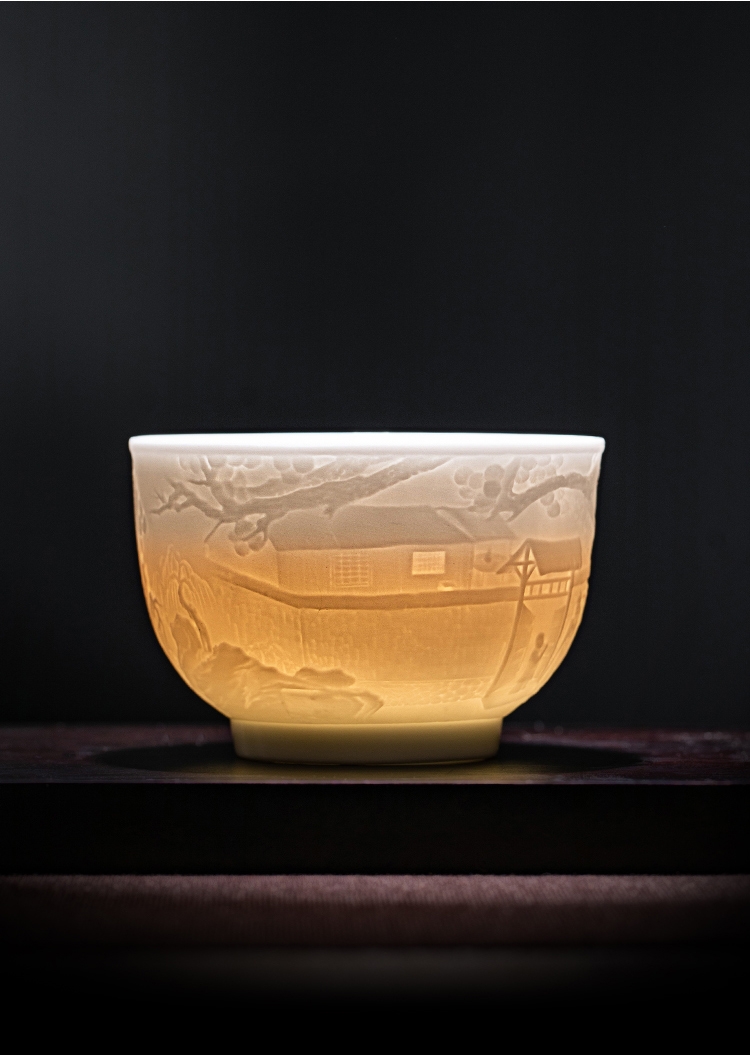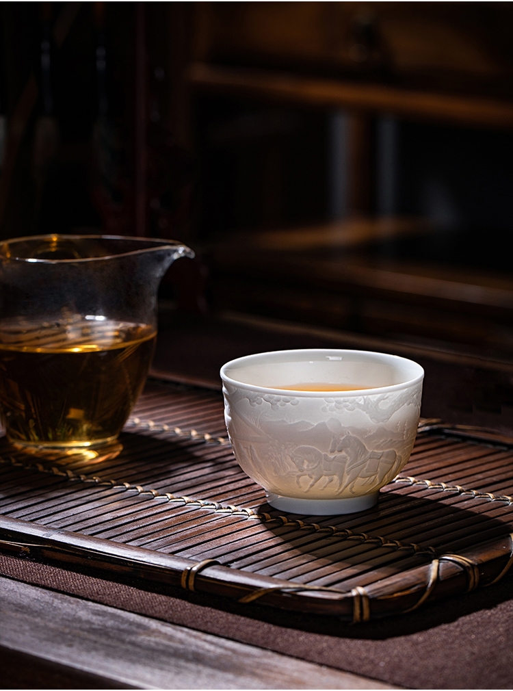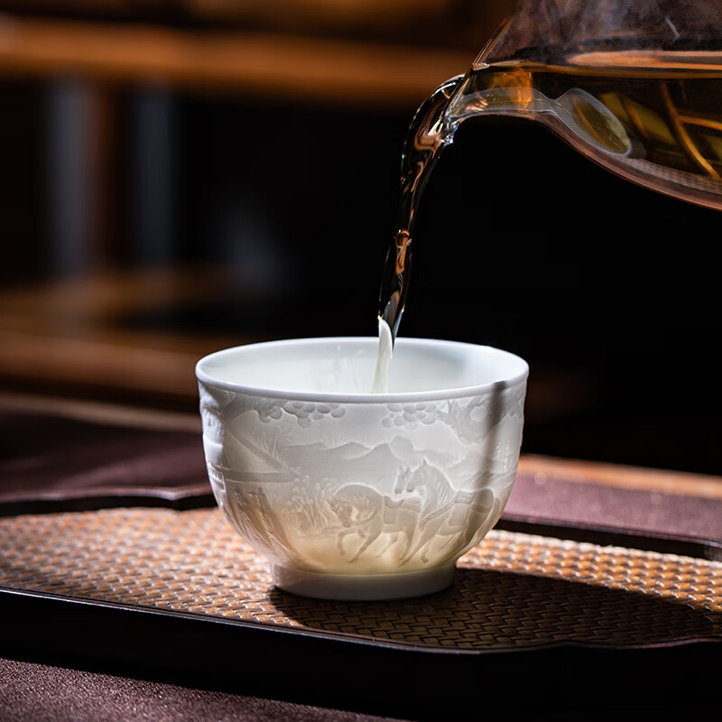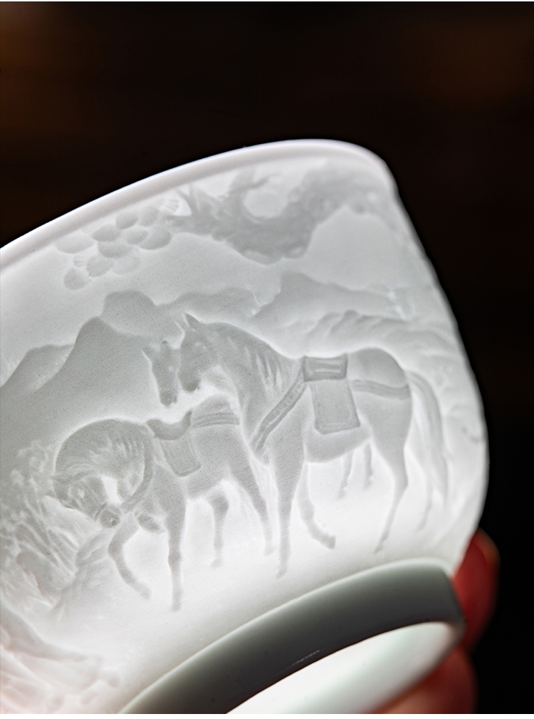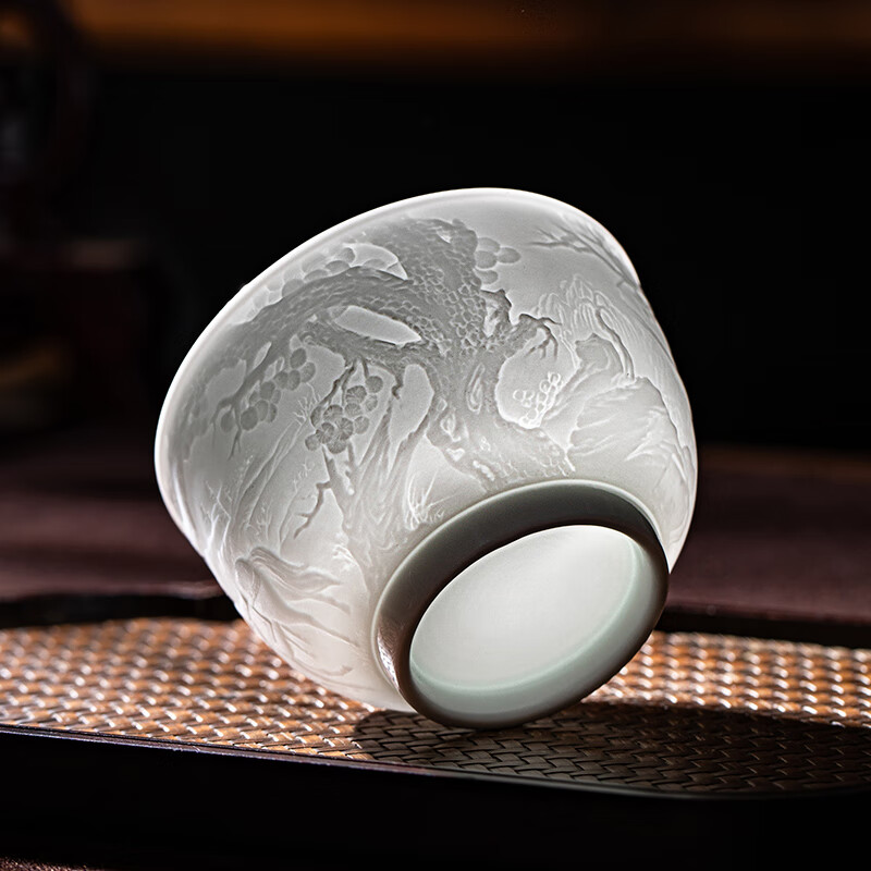 景德镇手工影青瓷 釉面清澈 质地紧致 青白淡雅;手工雕刻 线条深浅变化 虚实相间 如行云流水;图案来源历史典故 文化底蕴深厚 送礼更显心意