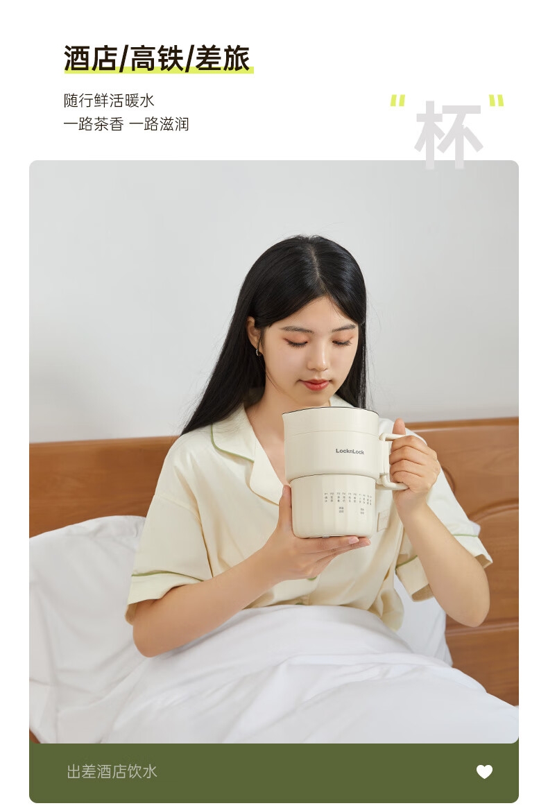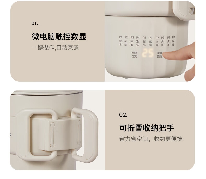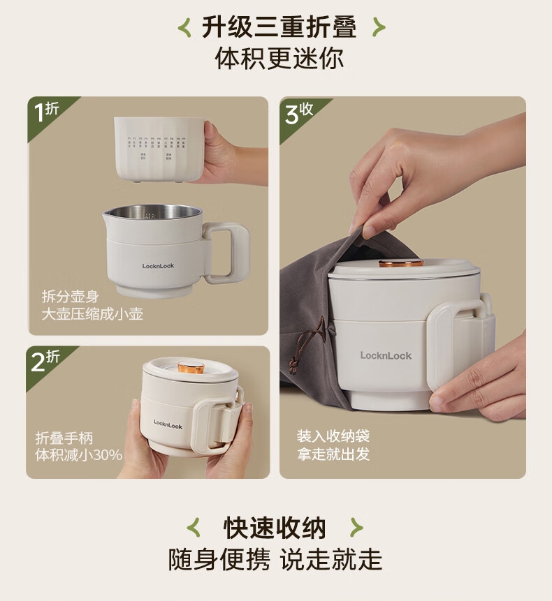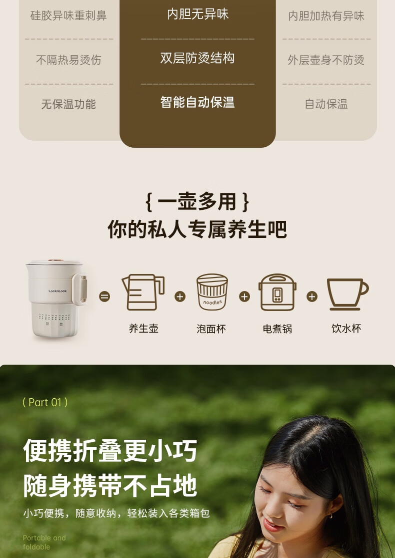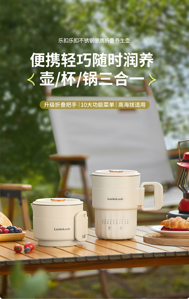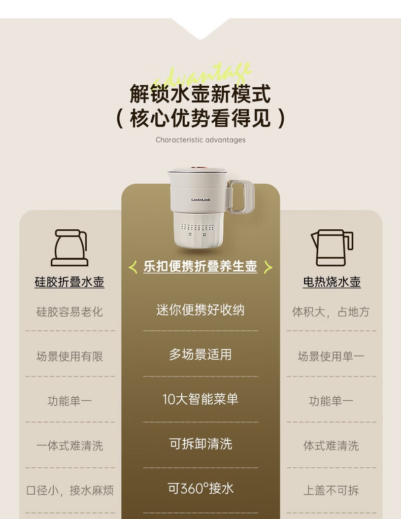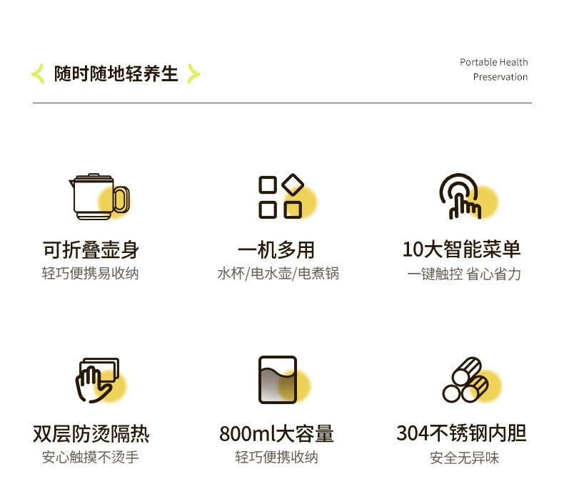 可折叠壶身,800ml大容量,轻巧便携易收纳。;一壶多用(养生壶+泡面杯+电煮锅+饮水杯);10大智能菜单,一键触控,省心省力。