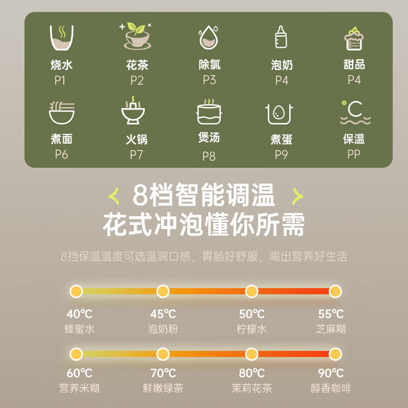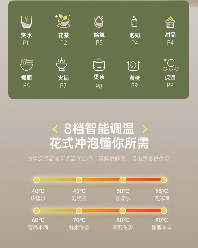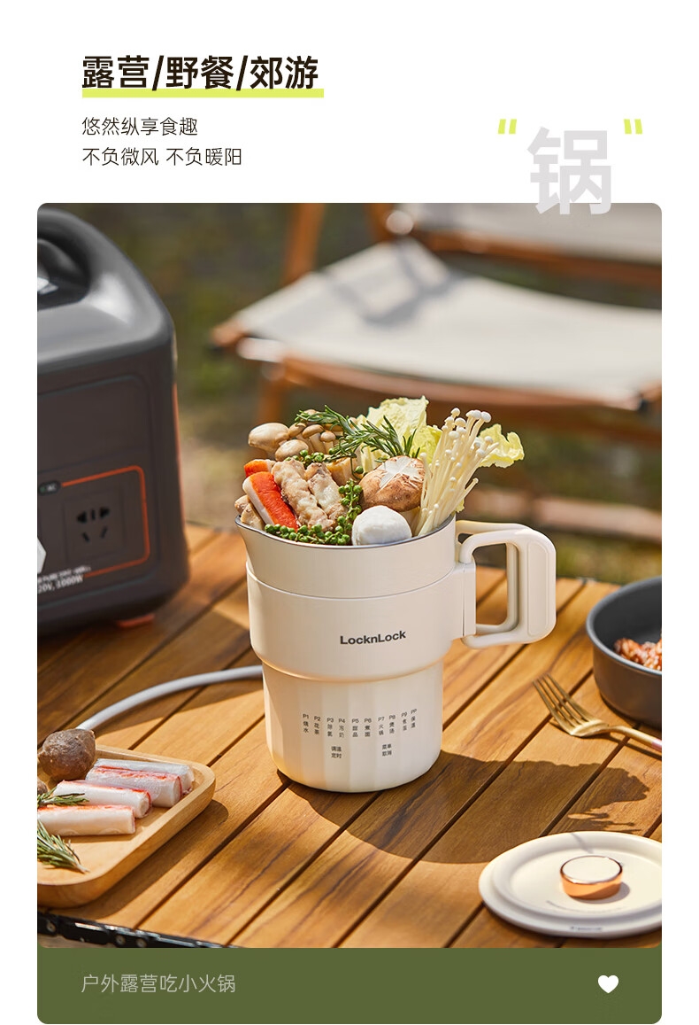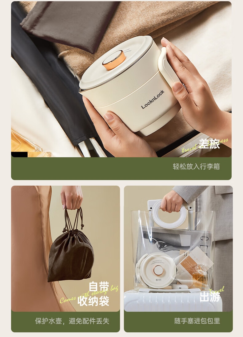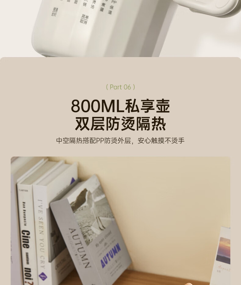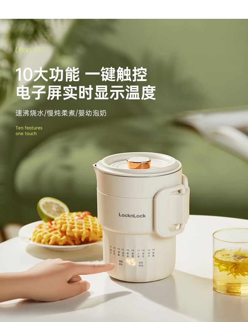 可折叠壶身,800ml大容量,轻巧便携易收纳。;一壶多用(养生壶+泡面杯+电煮锅+饮水杯);10大智能菜单,一键触控,省心省力。