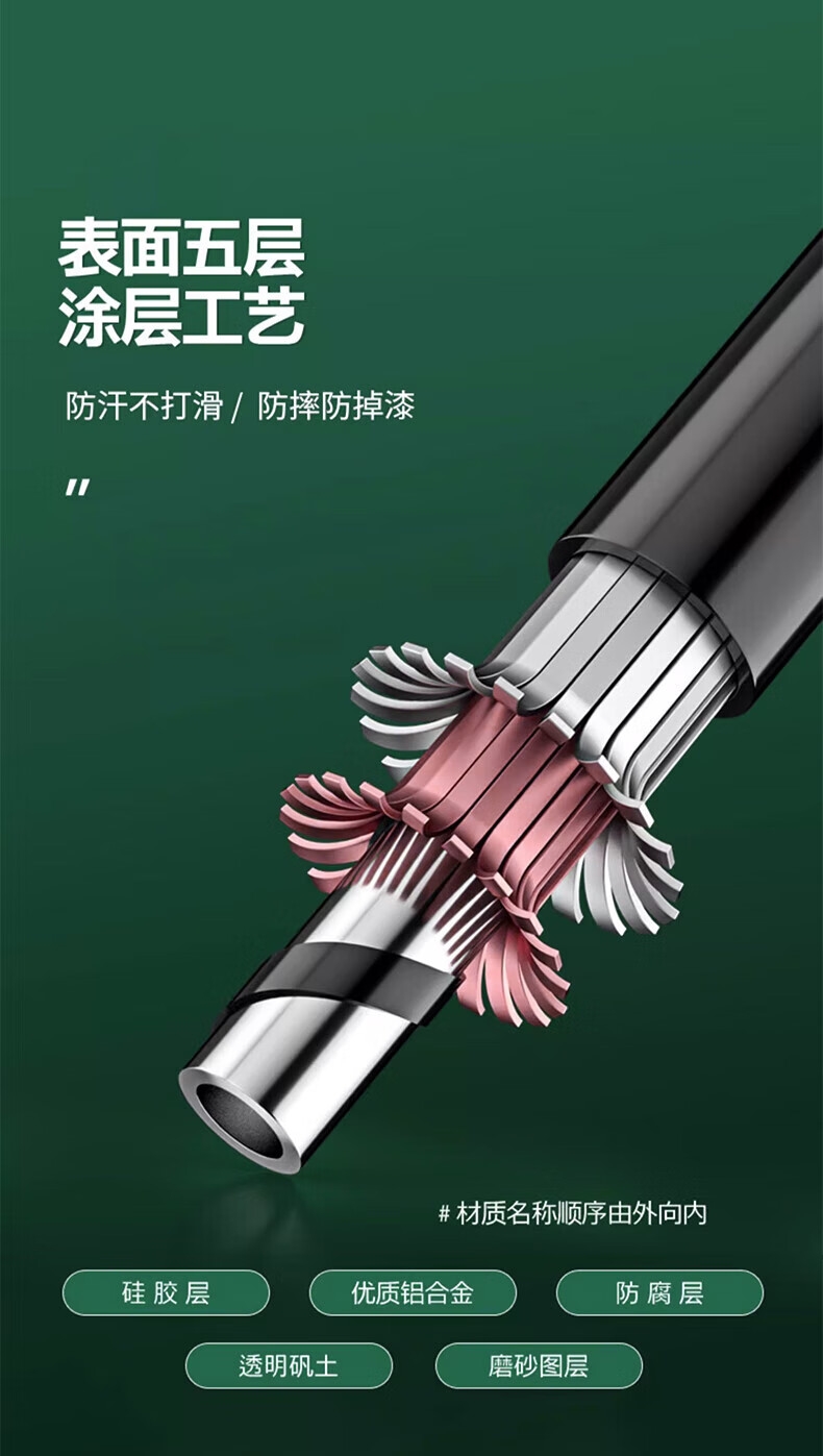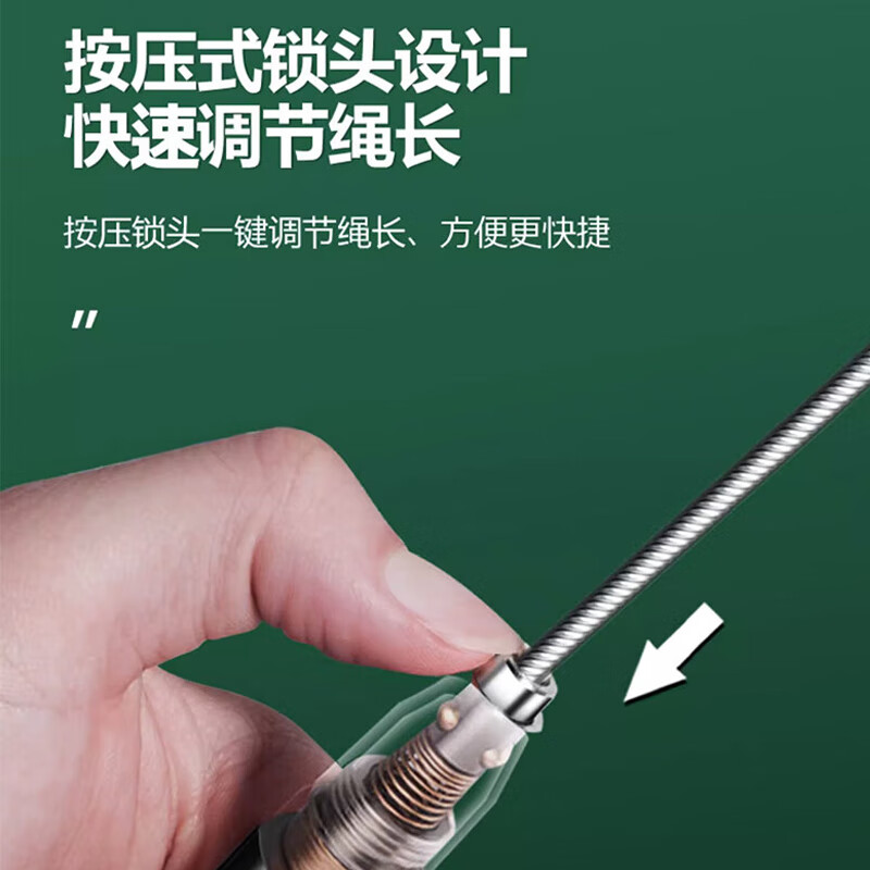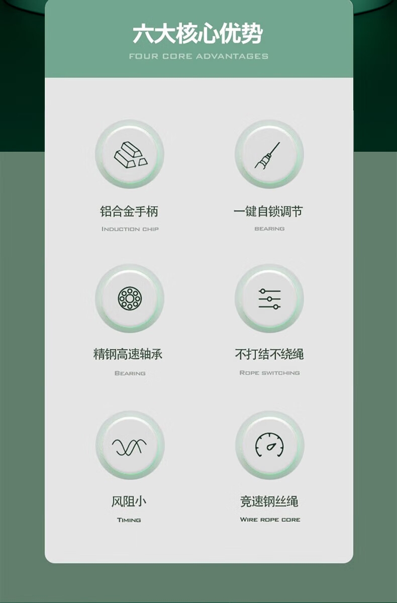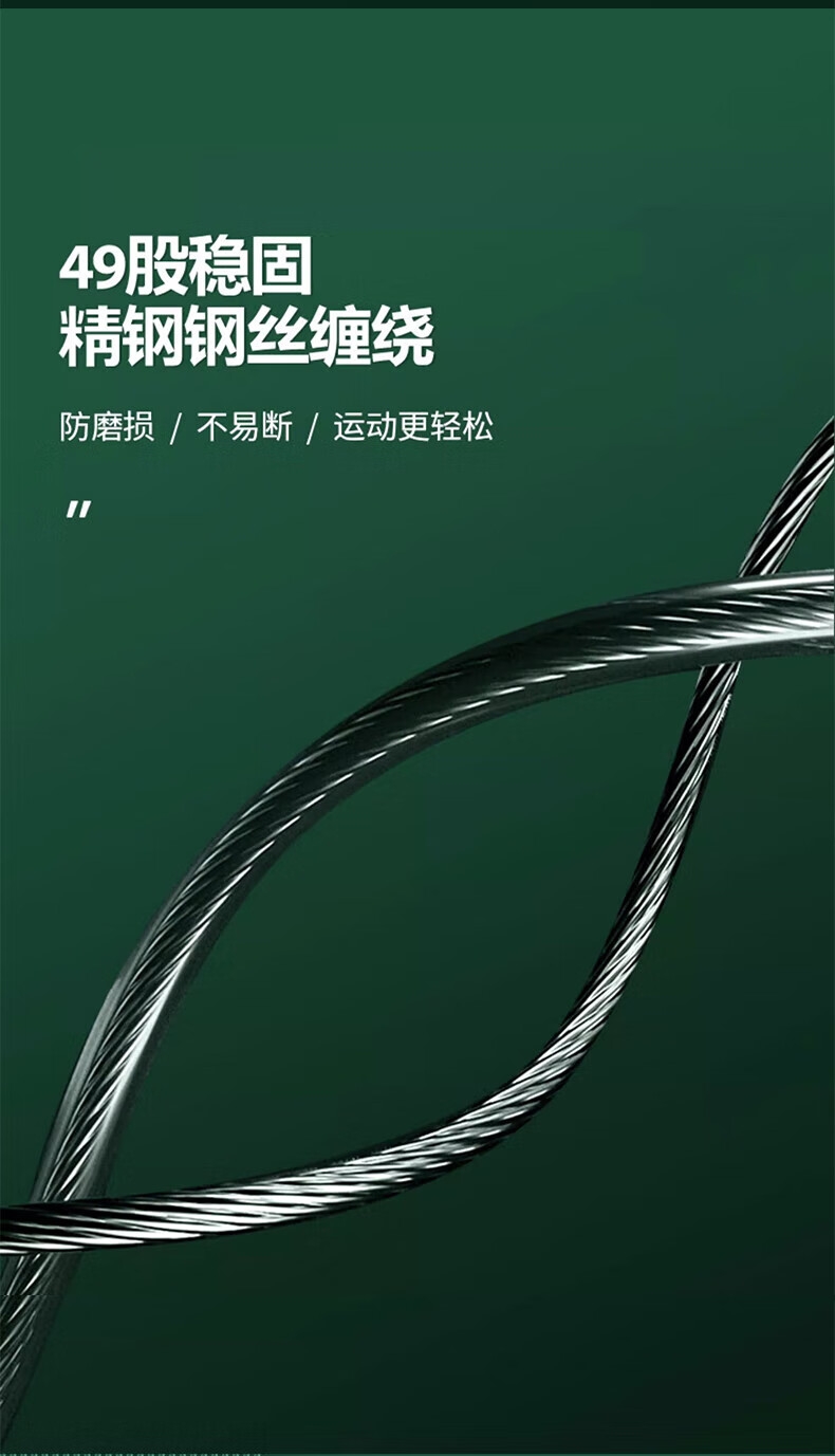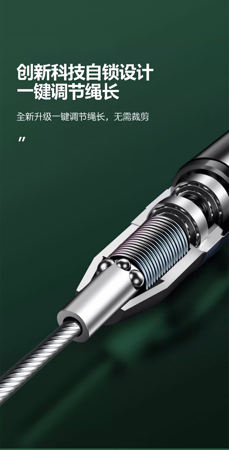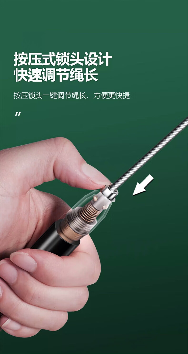 按压式锁头设计快速调节绳长;硅胶铝合金手柄舒适设计不打滑;2.5mm直径,有效减少空气阻力