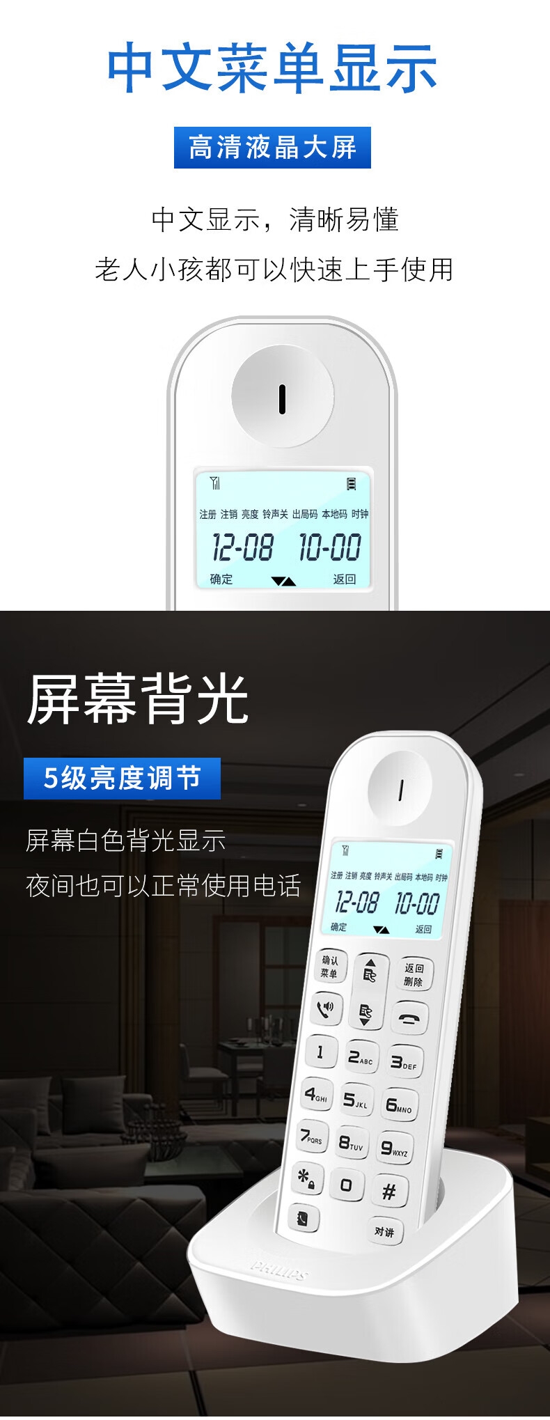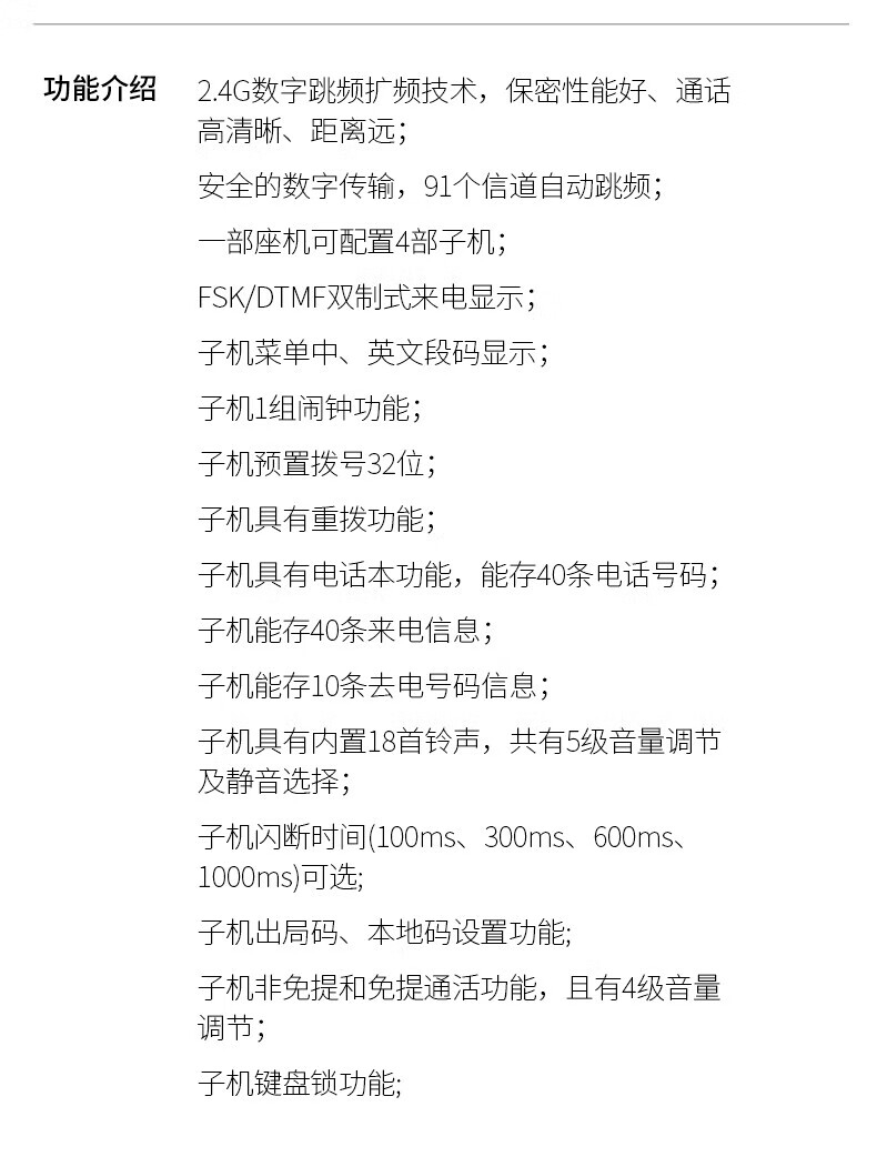 超远距离信号范围;高清液晶大屏,中文显示,清晰易懂;屏幕背光,5级亮度调节;清晰免提通话,一键免提,解放双手;自动接听功能,方便快捷