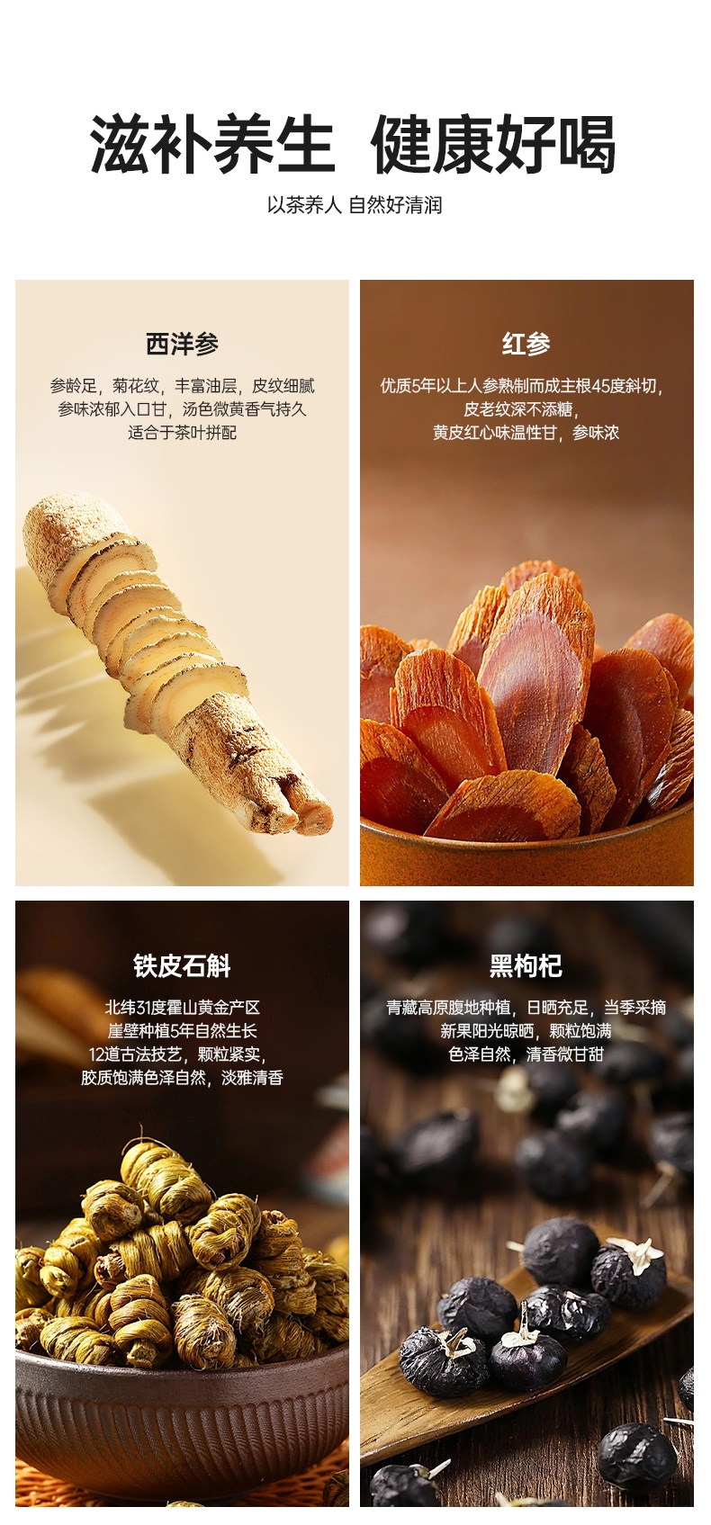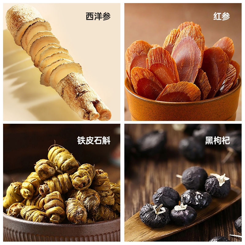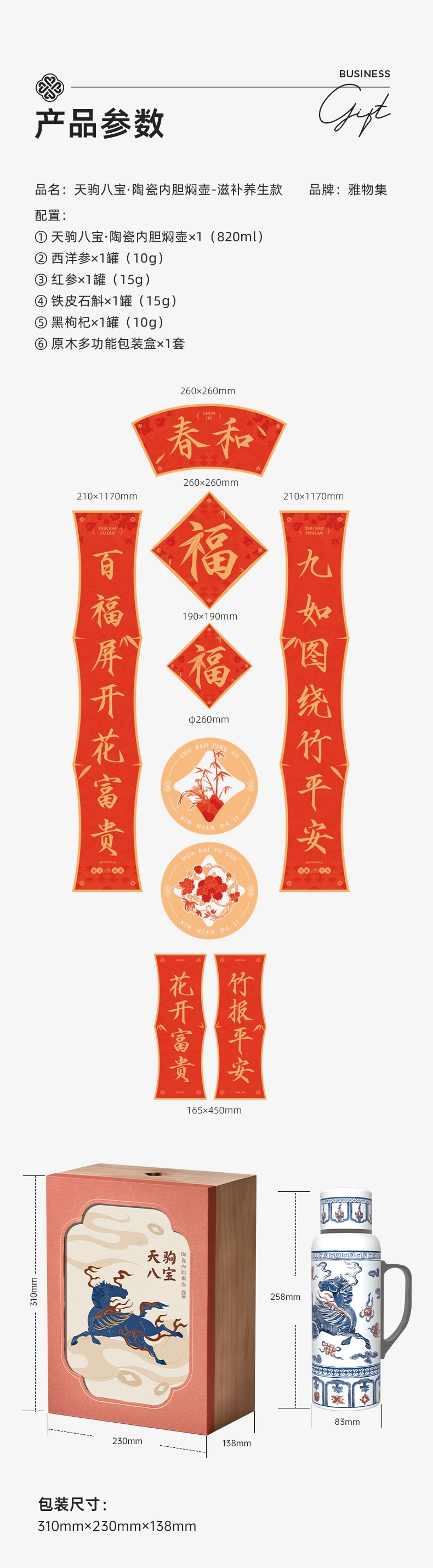 配置:① 天驹八宝·陶瓷内胆焖壶×1(820ml) ② 西洋参×1罐(10g) ③ 红参×1罐(15g) ④ 铁皮石斛×1罐(15g) ⑤ 黑枸杞×1罐(10g) ⑥ 原木多功能包装盒×1套