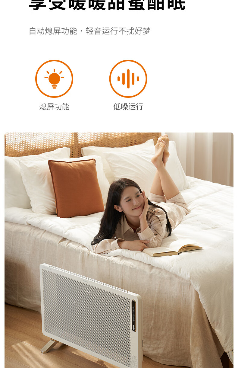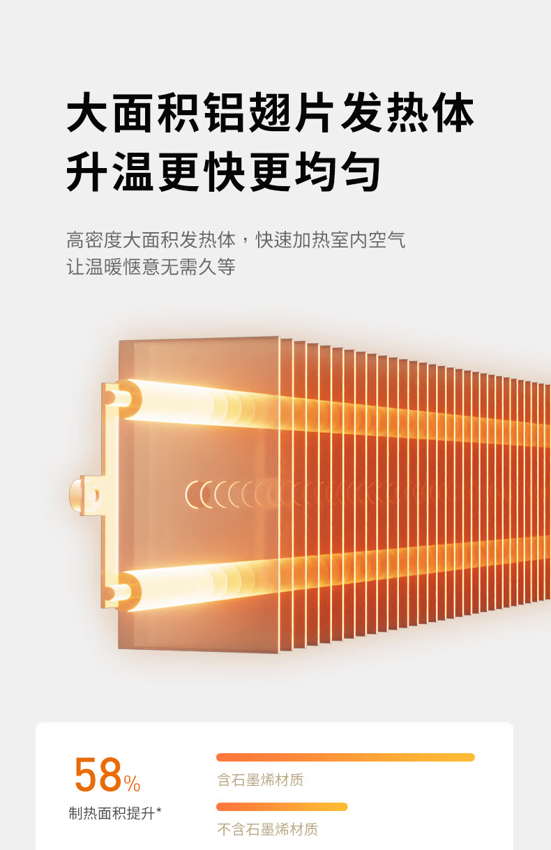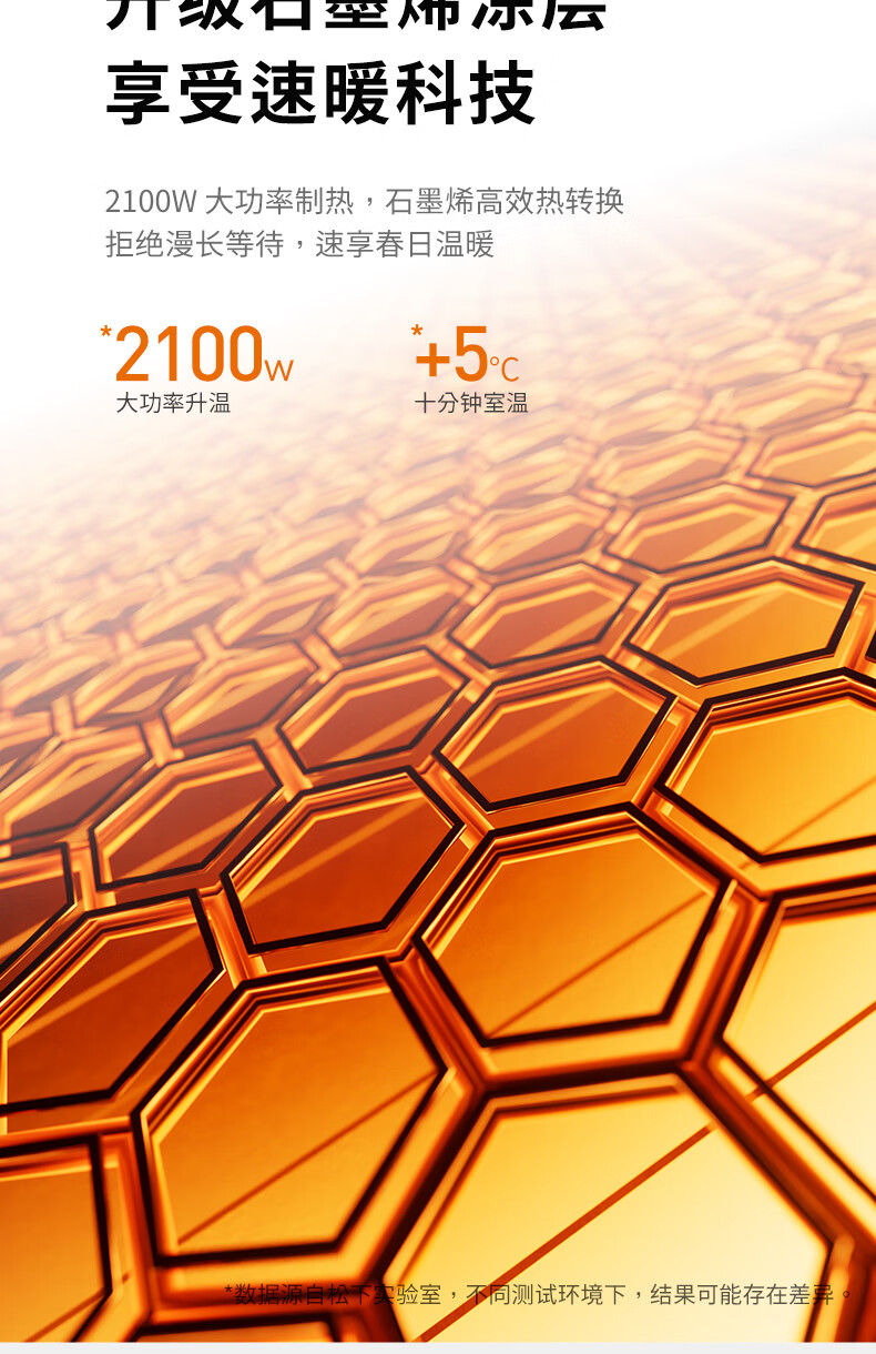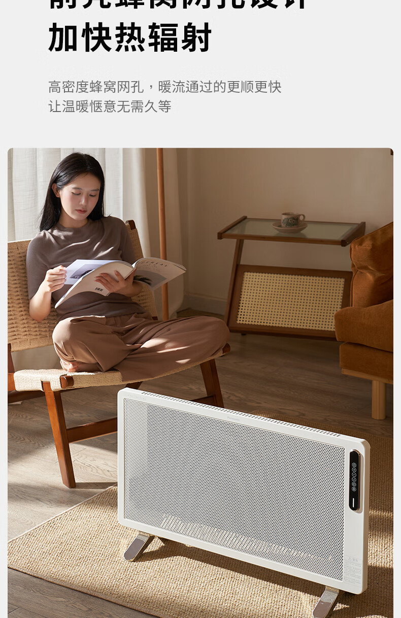 采用铝翅片发热体,低燥无光,取暖不干燥; 两档(1050W、2100W)功率调节;前壳蜂窝网孔设计,加快热辐射