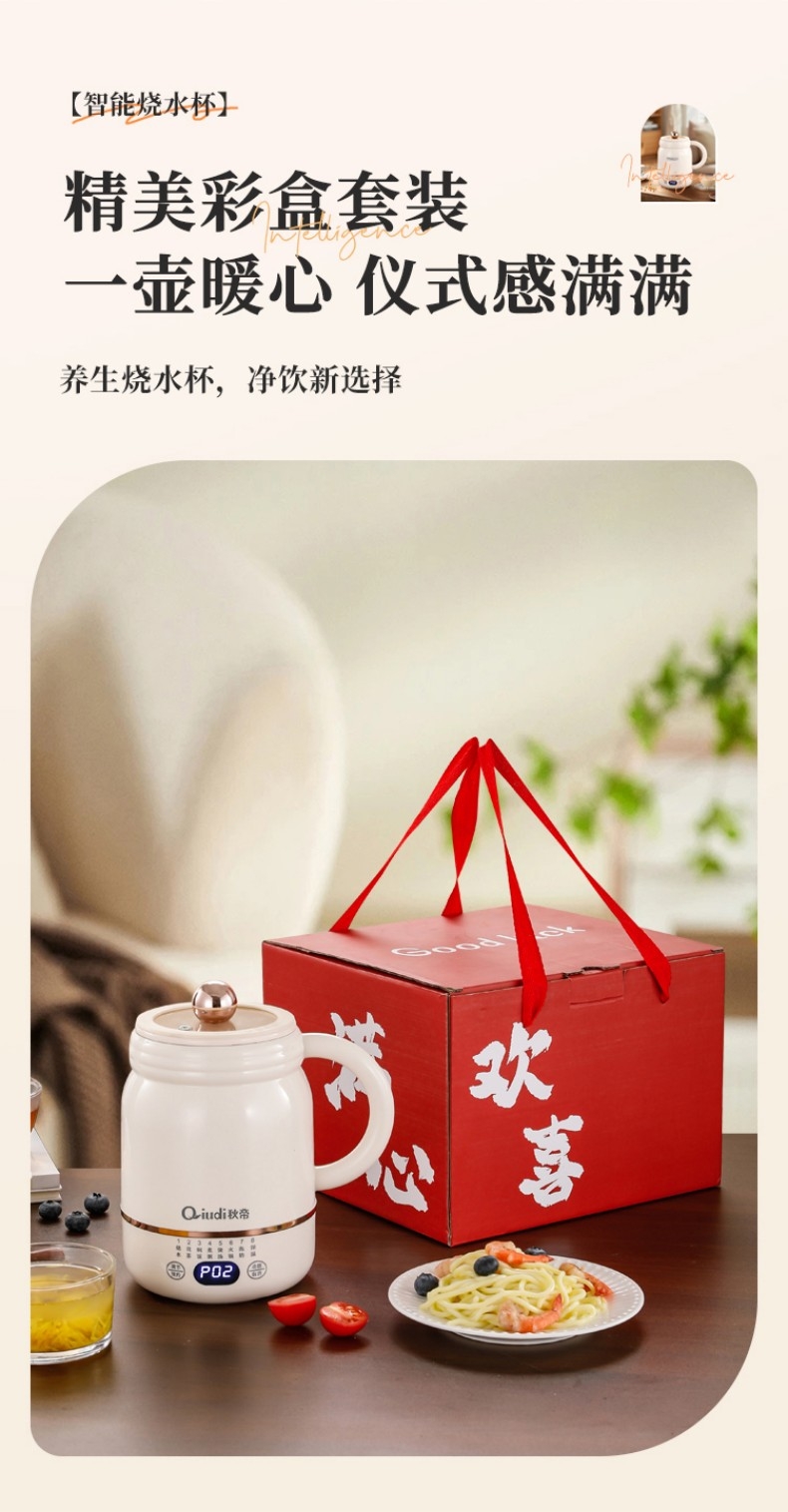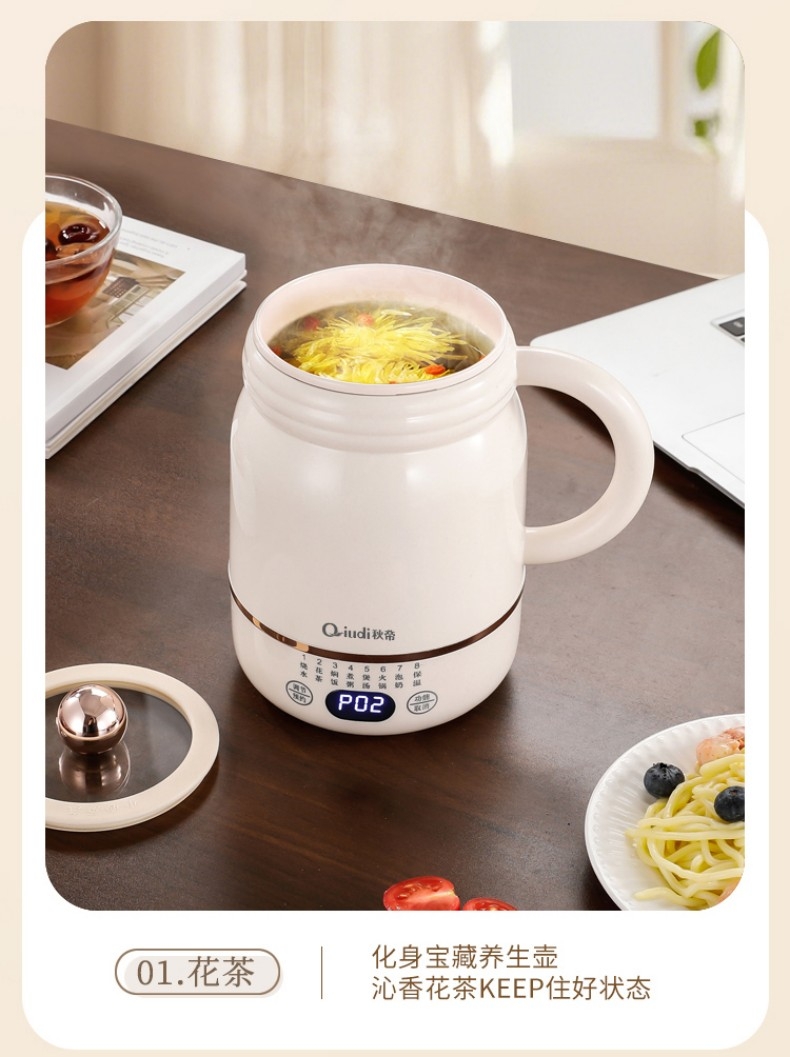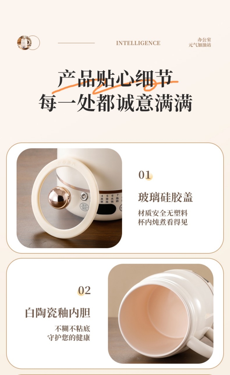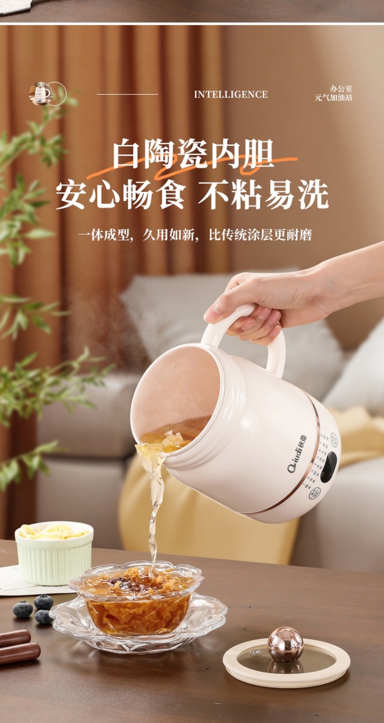 八大智能菜单选项,一键可多段调温,小巧便携一机多用;温润轻奢养生,居家旅行办公必备随时补充营养好喝健康;白陶瓷釉内胆安全畅食,不粘易清洗,比传统涂层更耐用;精美礼盒套装,一壶暖心,仪式感慢慢送礼自用更有心意;预约保温暖饮常伴,安全温控干烧自动断电,使用更放心