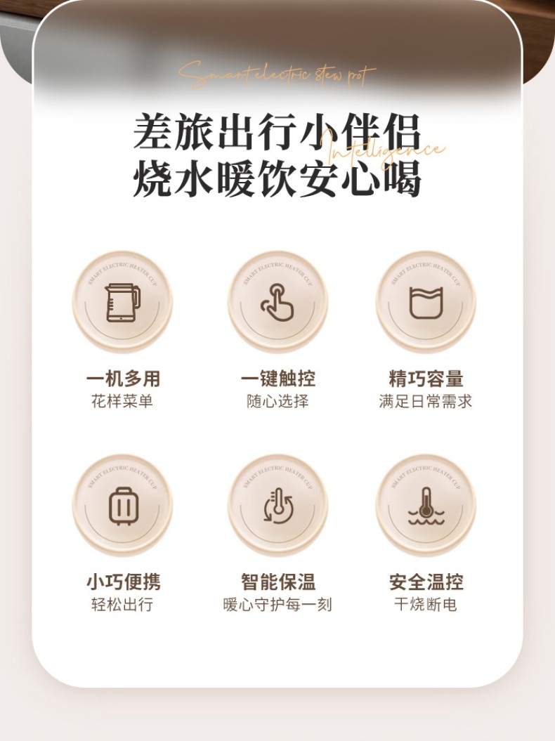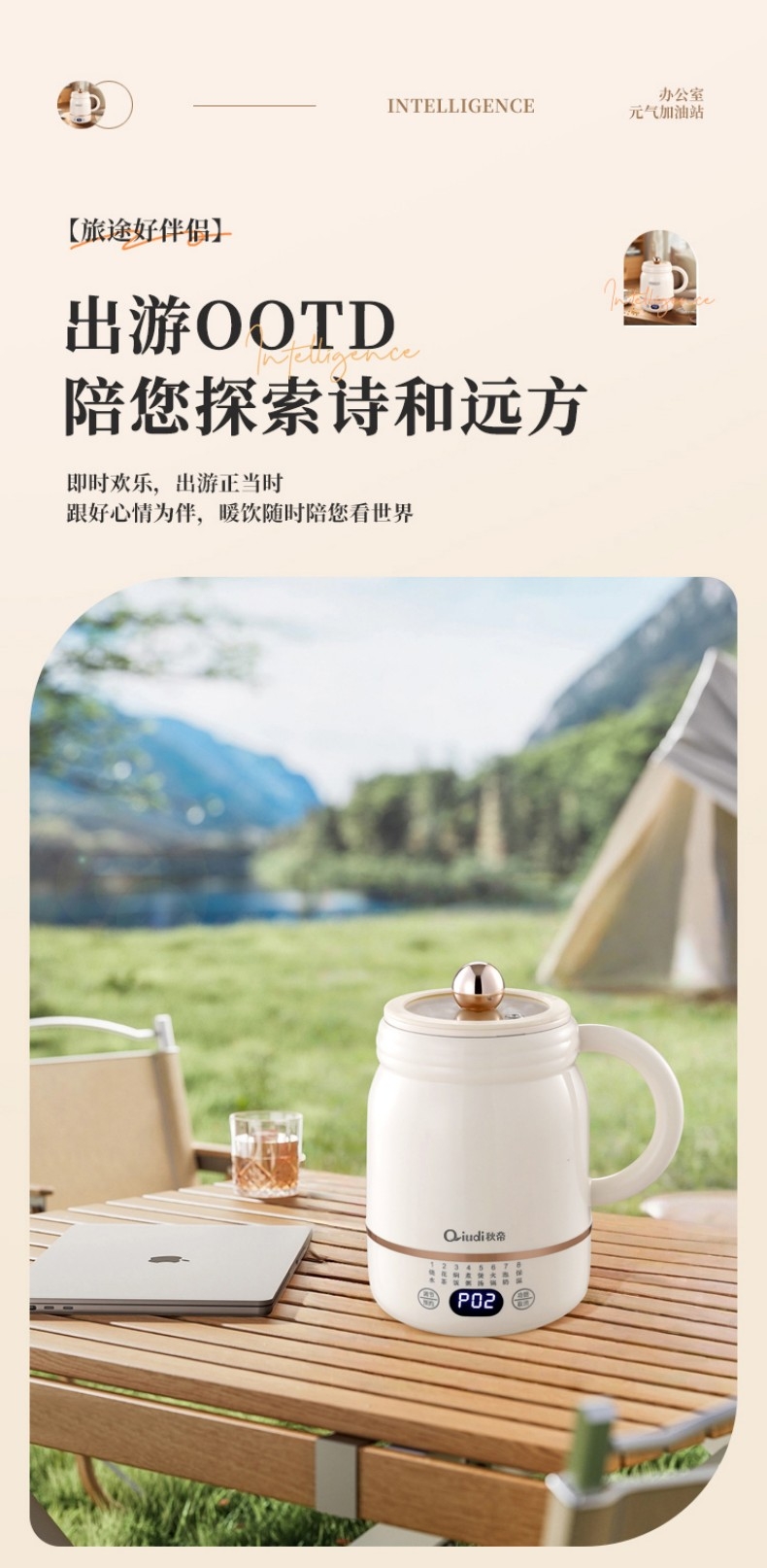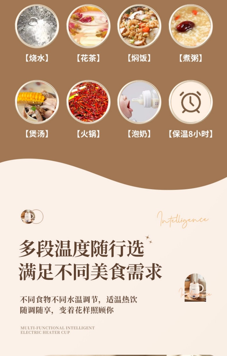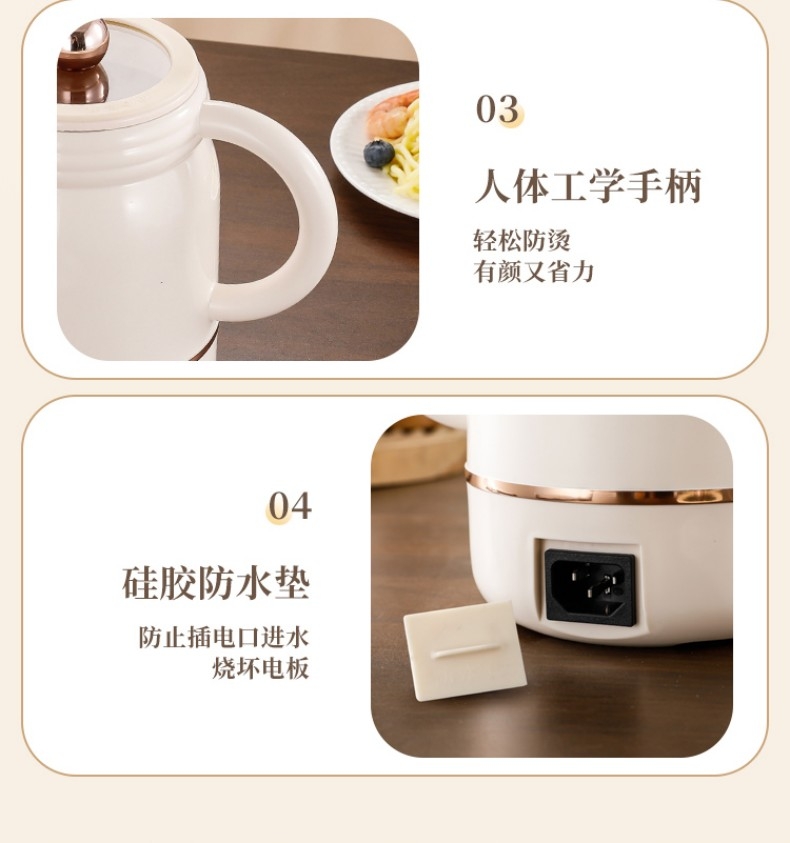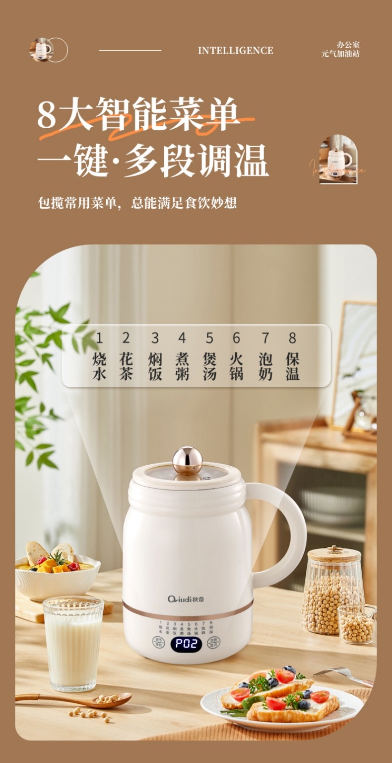 八大智能菜单选项,一键可多段调温,小巧便携一机多用;温润轻奢养生,居家旅行办公必备随时补充营养好喝健康;白陶瓷釉内胆安全畅食,不粘易清洗,比传统涂层更耐用;精美礼盒套装,一壶暖心,仪式感慢慢送礼自用更有心意;预约保温暖饮常伴,安全温控干烧自动断电,使用更放心