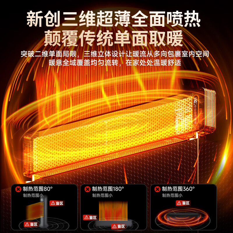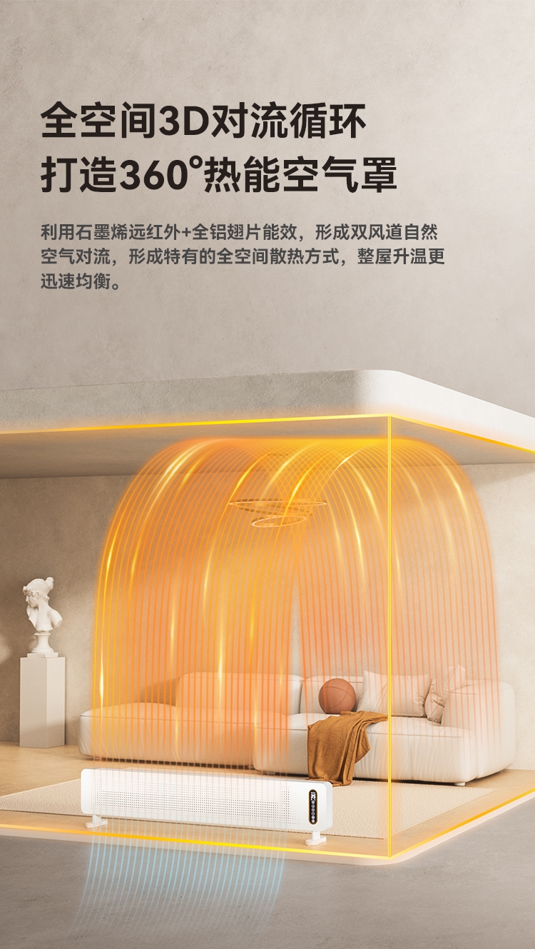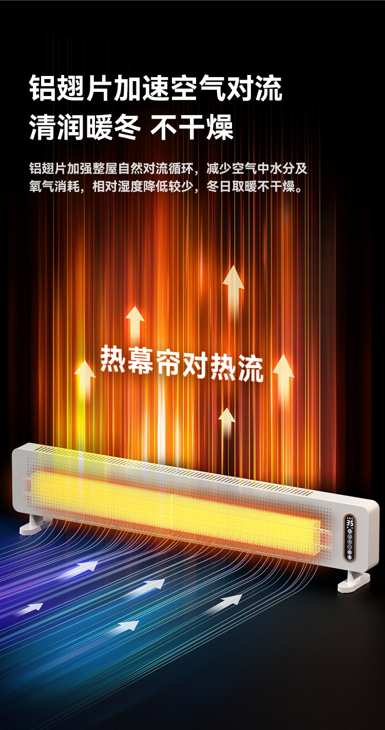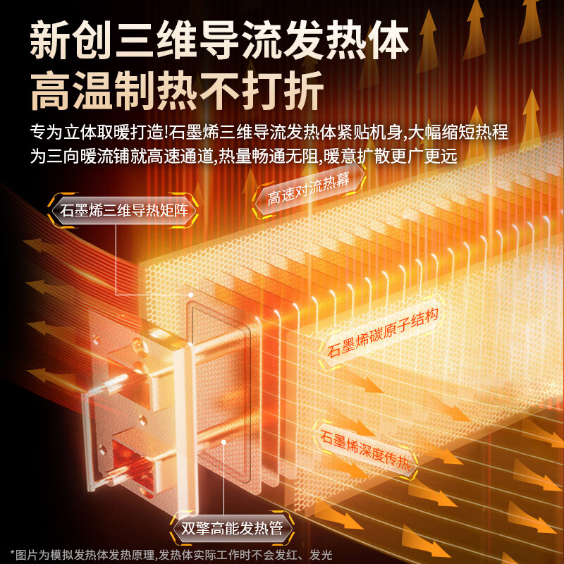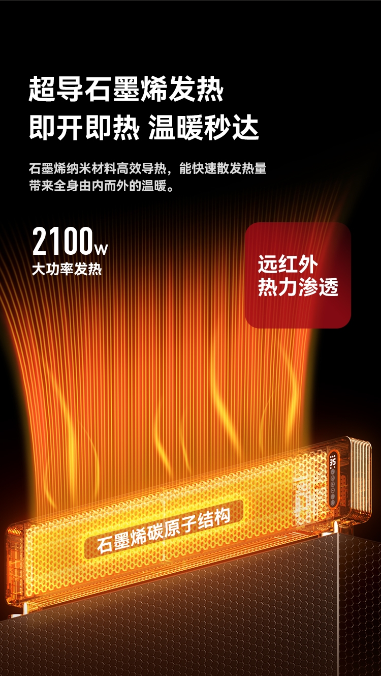 采用铝翅片发热体,低燥无光,取暖不干燥;发热体石墨烯涂层工艺,提高导热效率;数码屏显示,工作状态一目了然