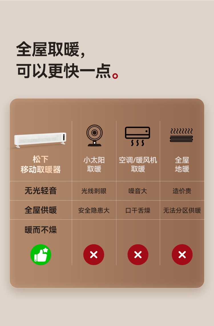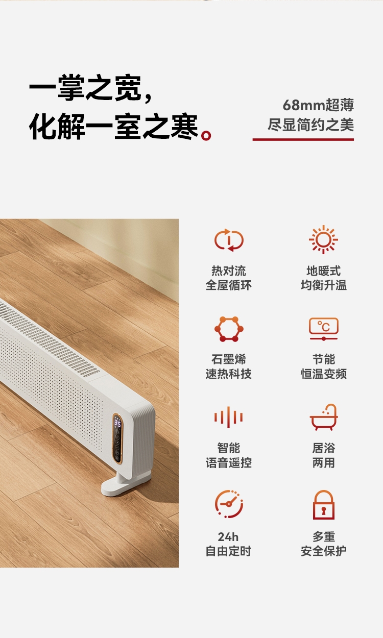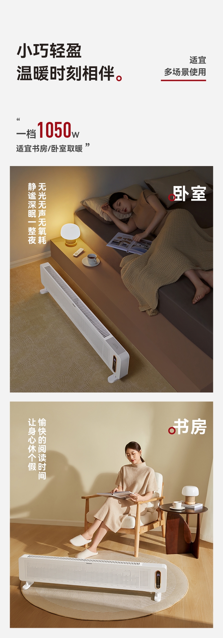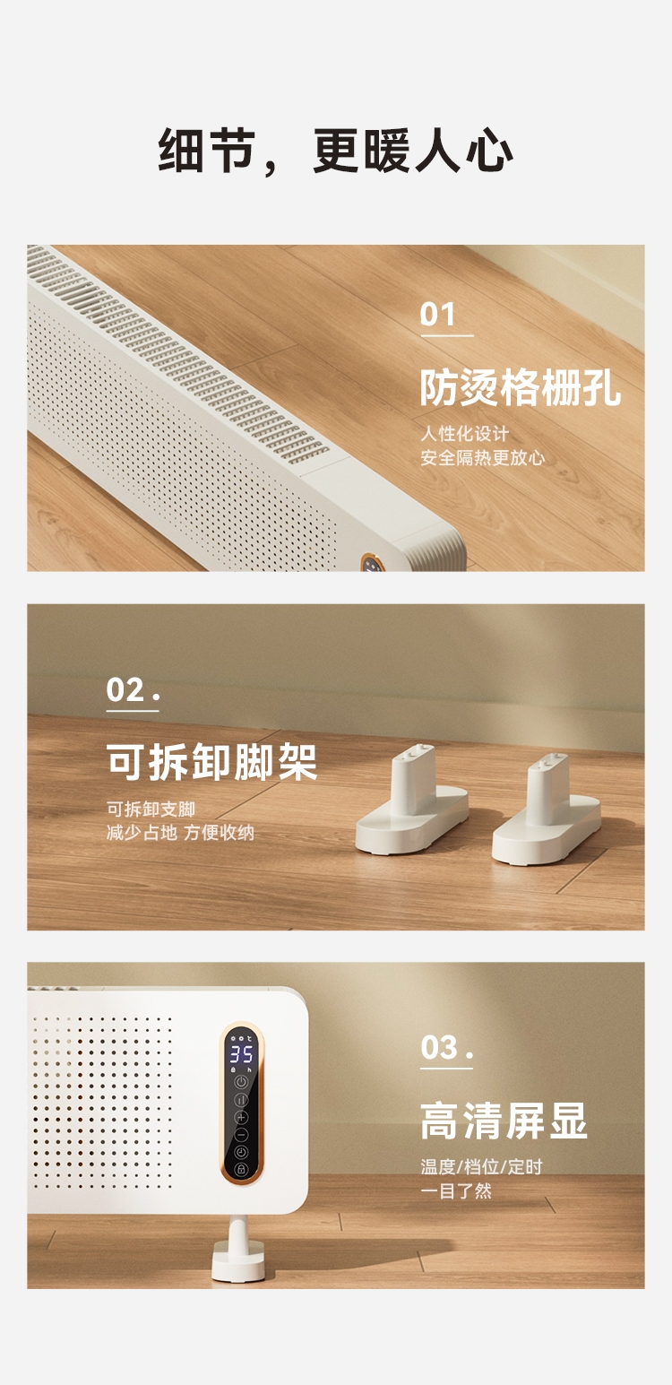 采用铝翅片发热体,低燥无光,取暖不干燥;发热体石墨烯涂层工艺,提高导热效率;数码屏显示,工作状态一目了然