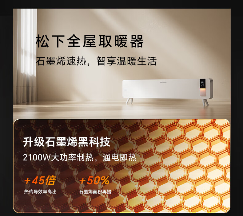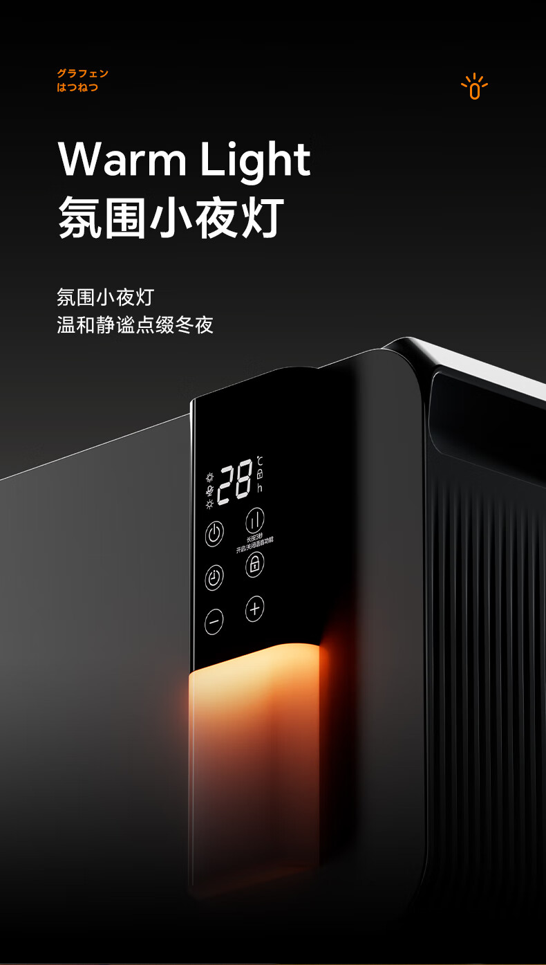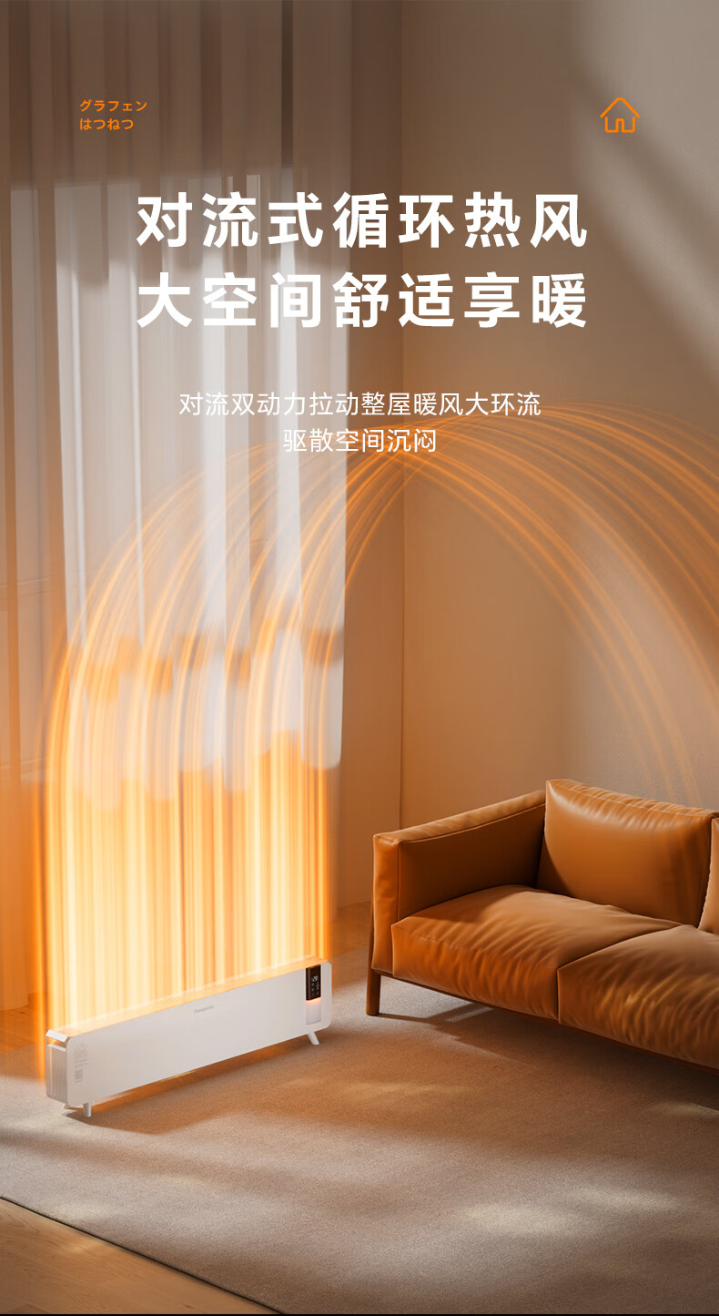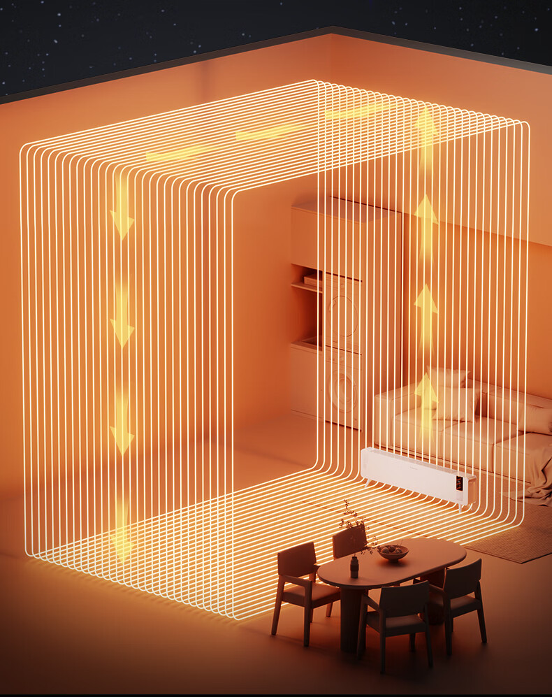 对流式循环热风,大空间舒适享暖;石墨烯远红外发热体,高效传到热量;两档调节,随心切换,灵活驱寒舒适自定义
