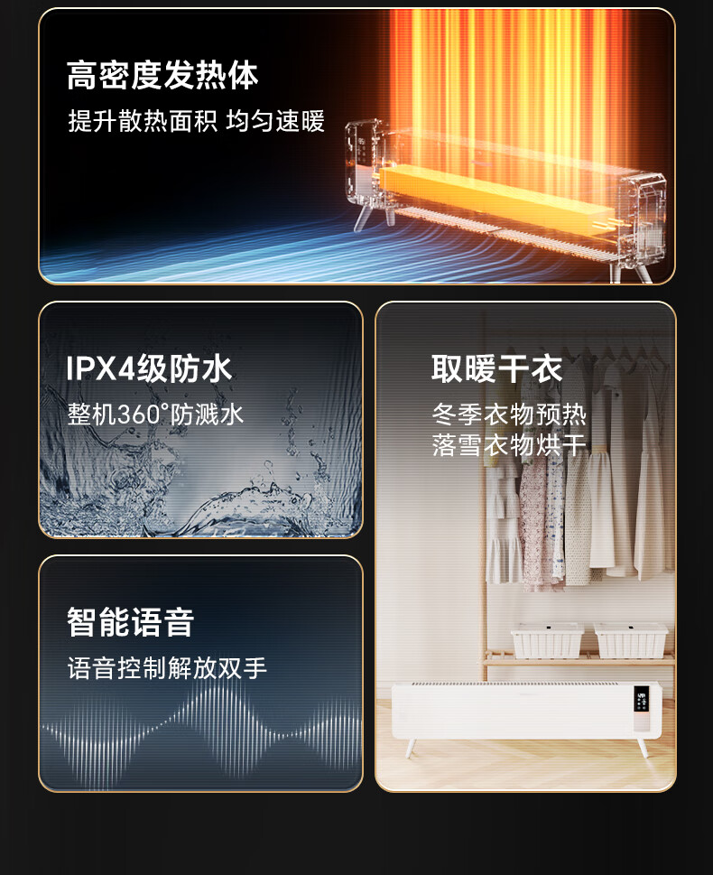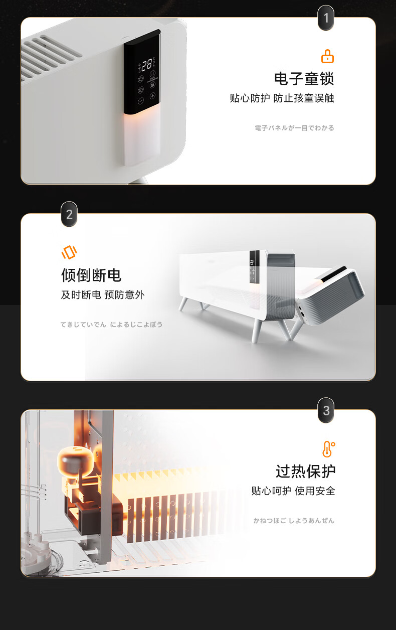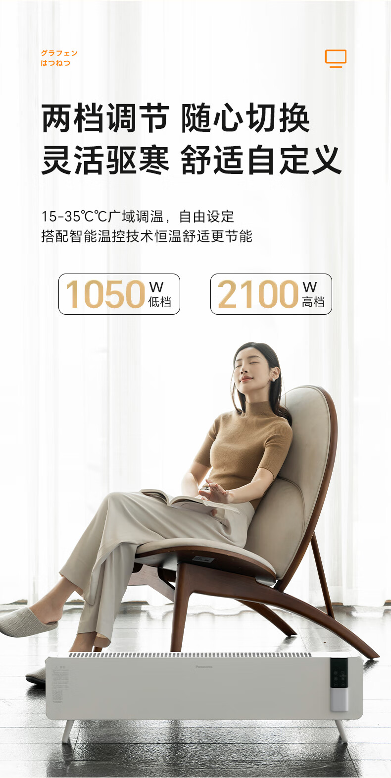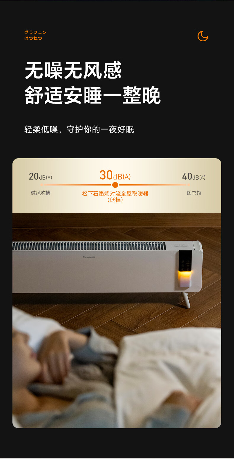 对流式循环热风,大空间舒适享暖;石墨烯远红外发热体,高效传到热量;两档调节,随心切换,灵活驱寒舒适自定义