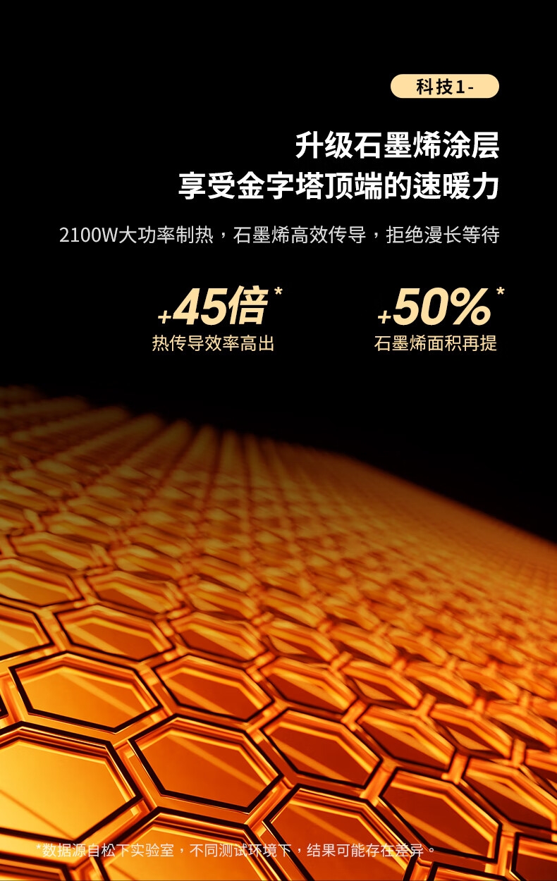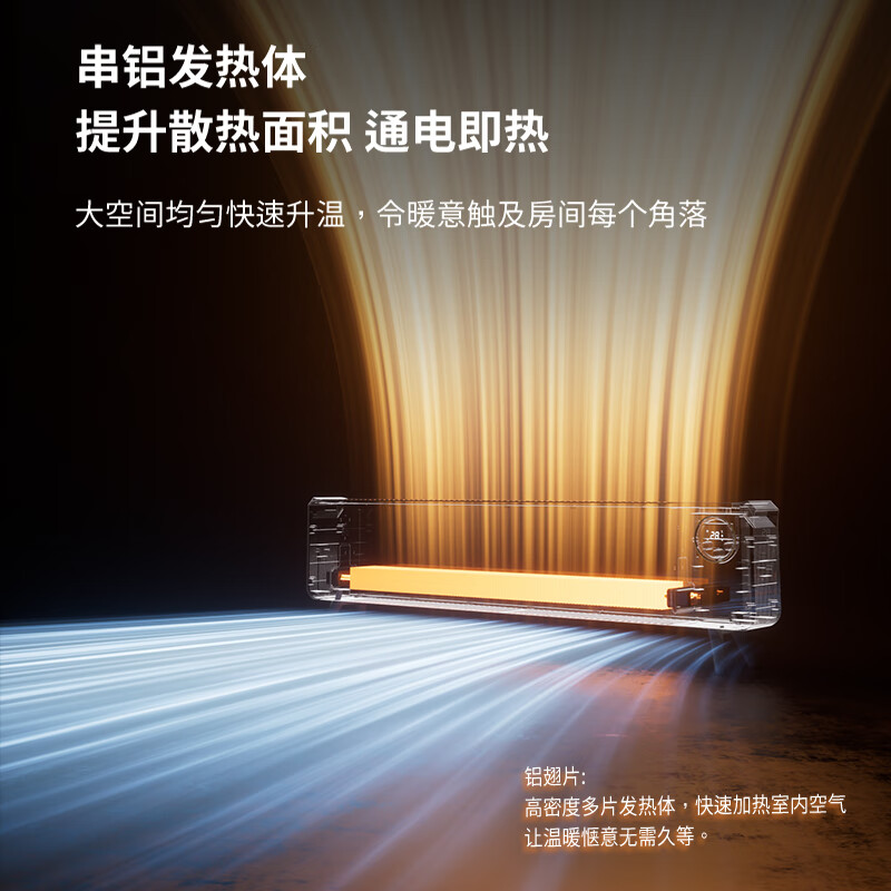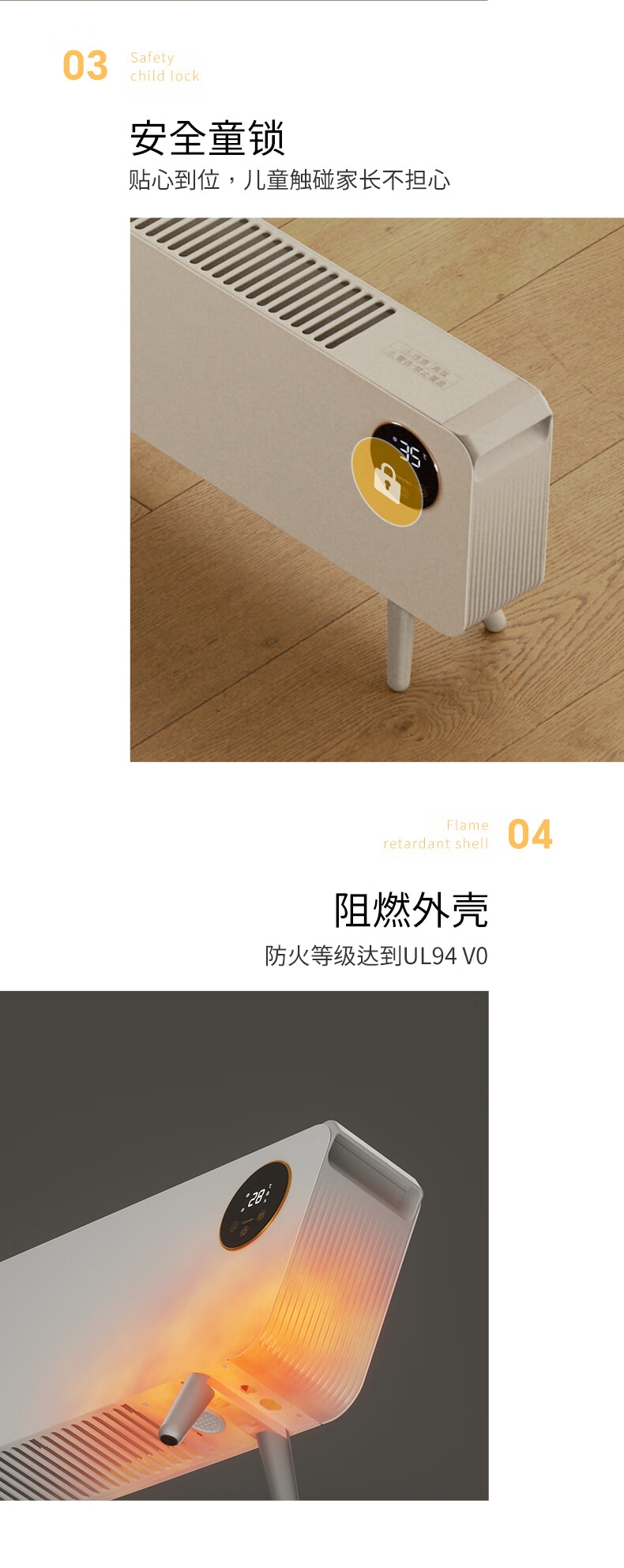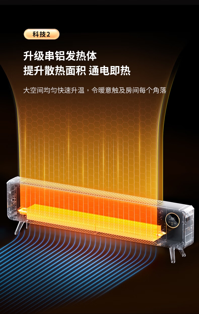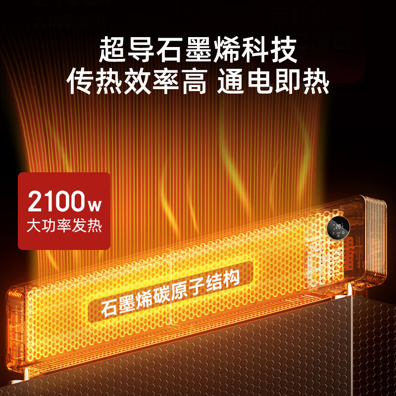 采用铝翅片发热体,低燥无光,取暖不干燥; 发热体石墨烯涂层工艺,提高导热效率;数码屏显示,工作状态一目了然