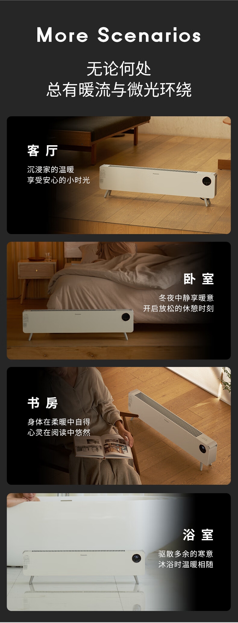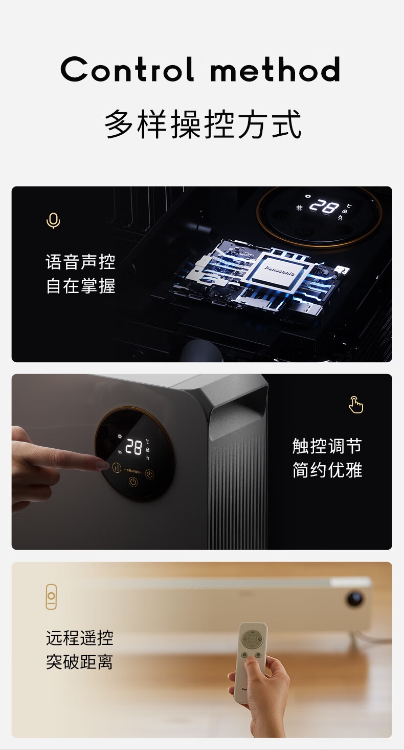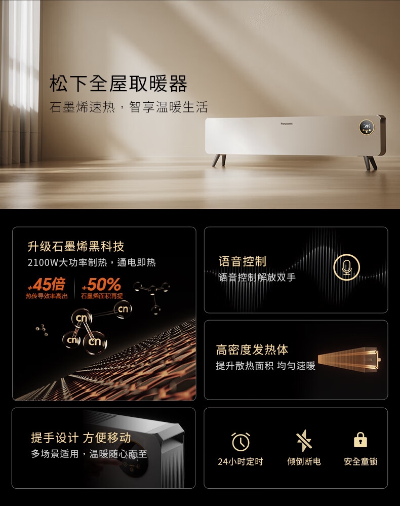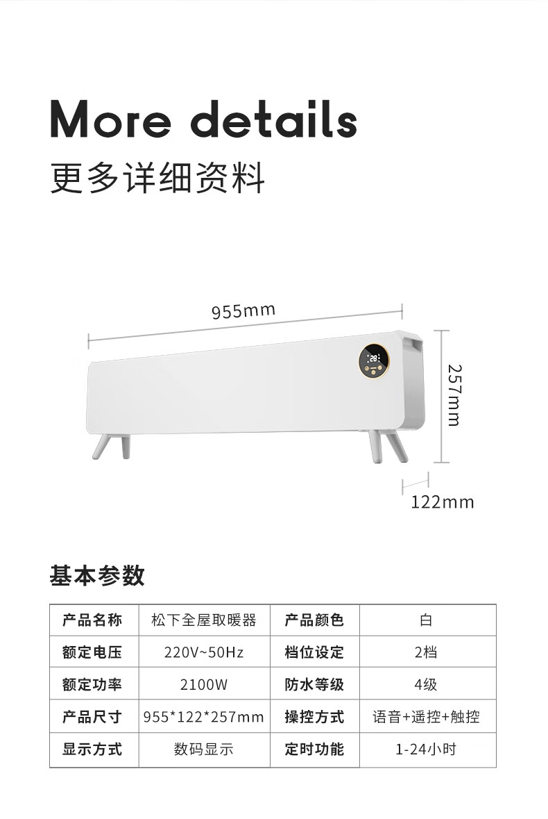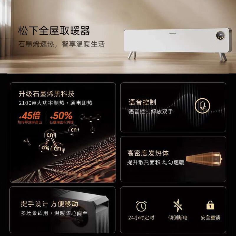 采用铝翅片发热体,低燥无光,取暖不干燥; 发热体石墨烯涂层工艺,提高导热效率;数码屏显示,工作状态一目了然