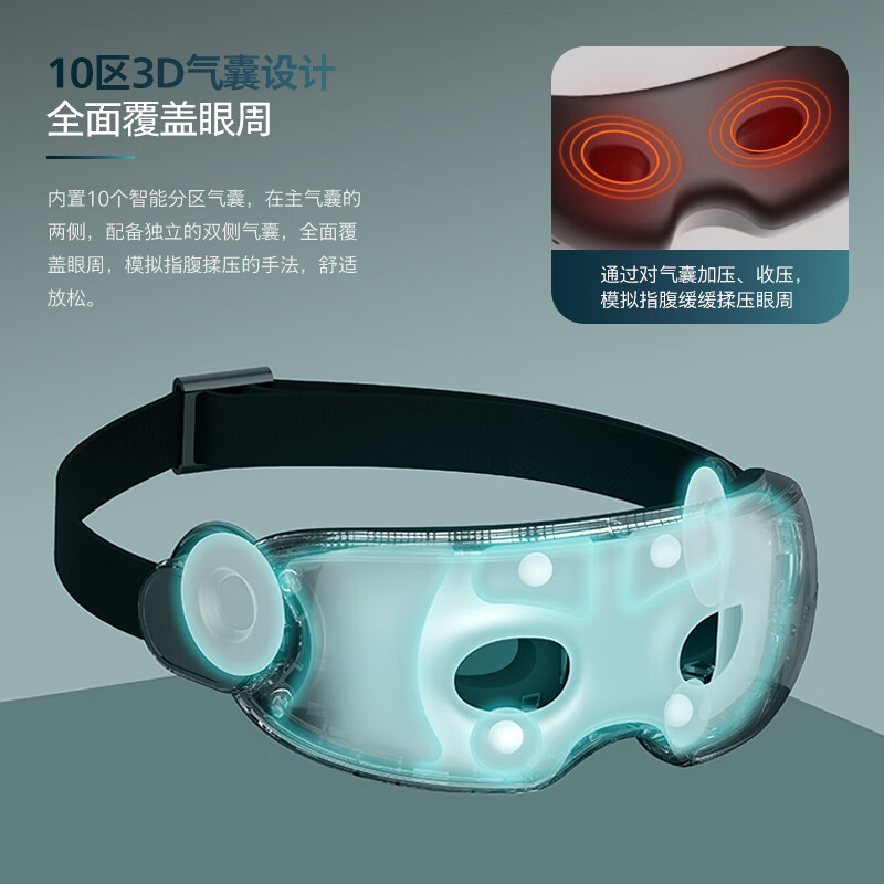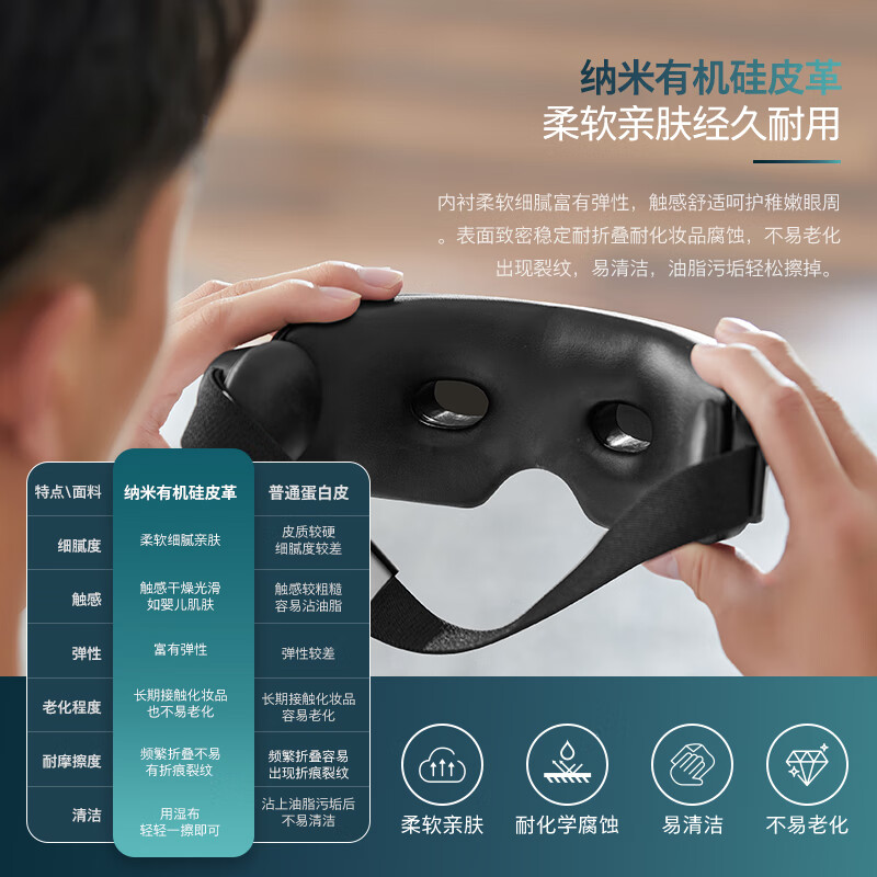 3D镂空+可视化窗口设计,零压迫缓解焦虑感;40℃恒温热敷+四大按摩模式,感受不一样的眼部按摩;纳米有机硅皮革贴肤面,亲肤又洁净,呵护脆弱眼周零