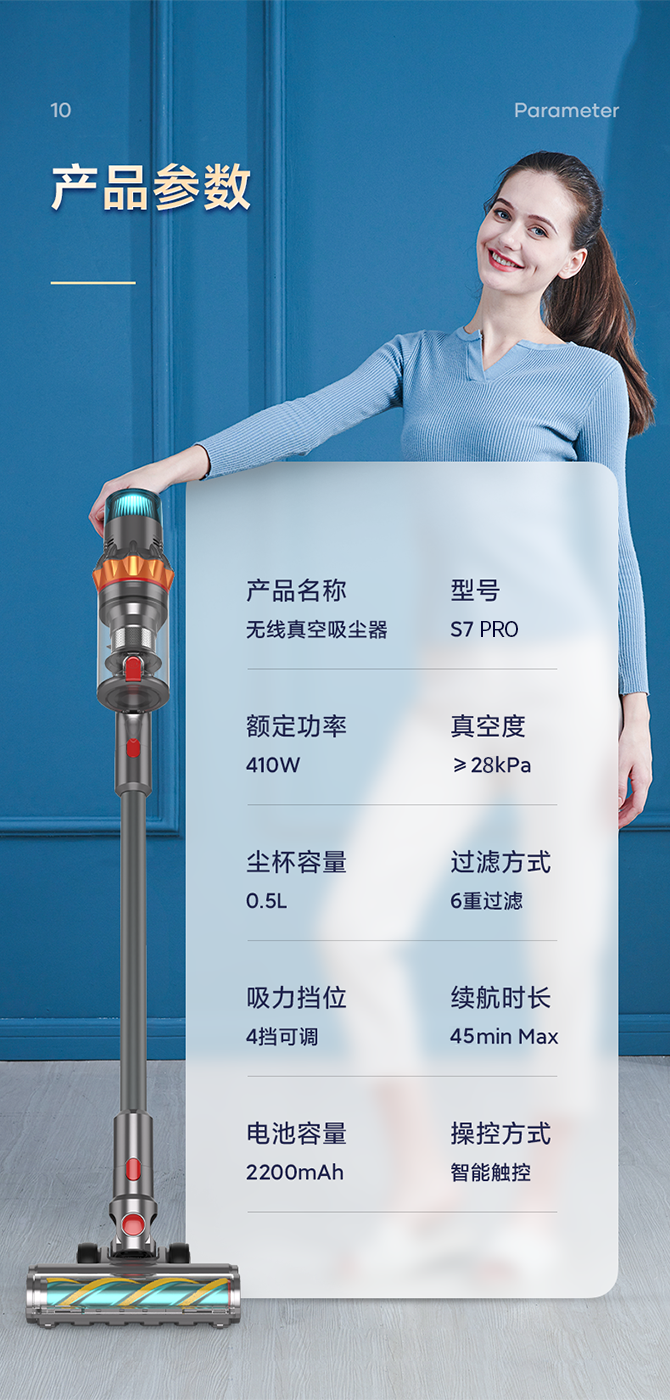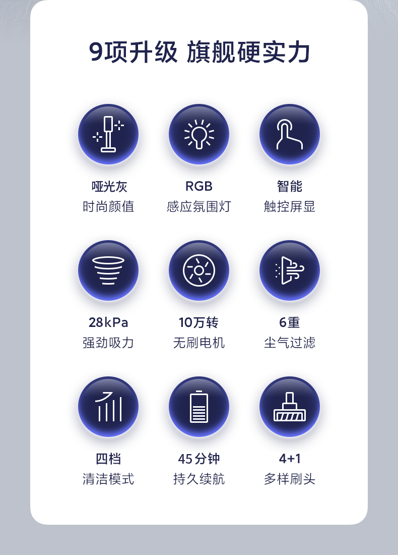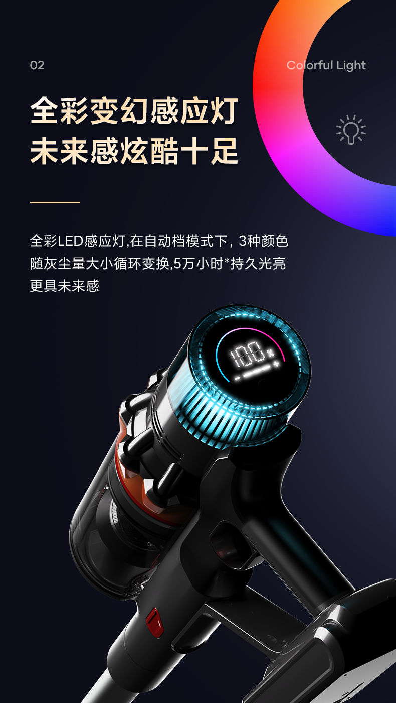数码无刷电机吸力强劲 ;自动灰尘感应;智能触控屏显 LED彩色氛围灯