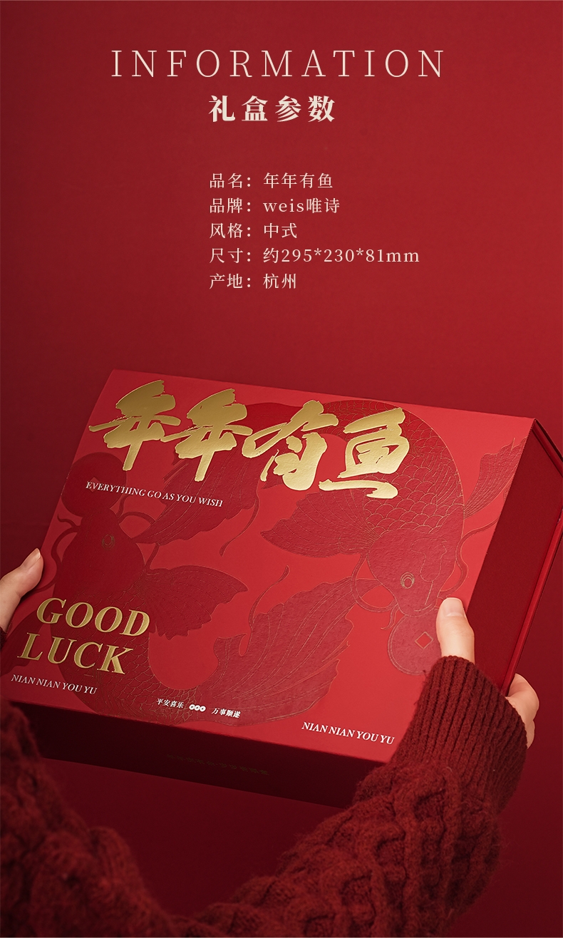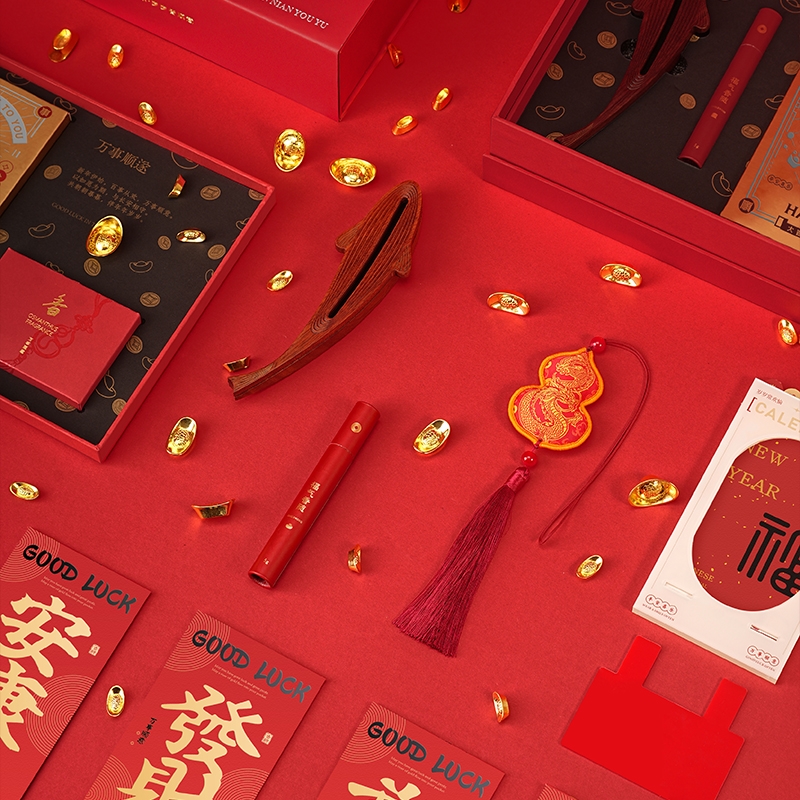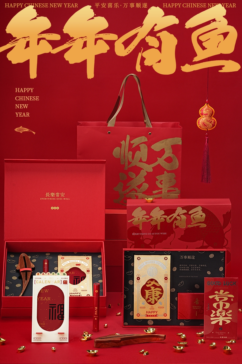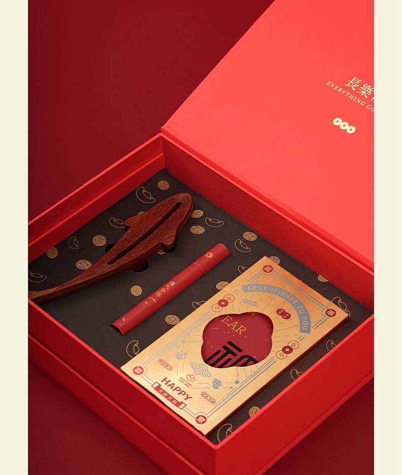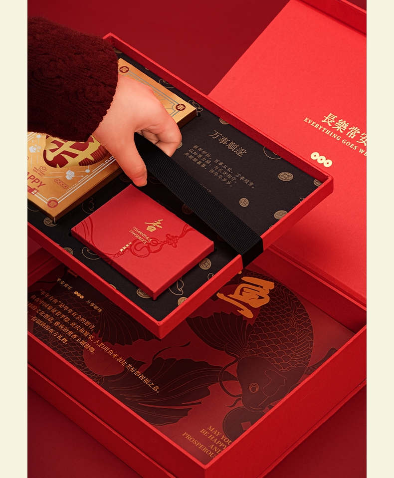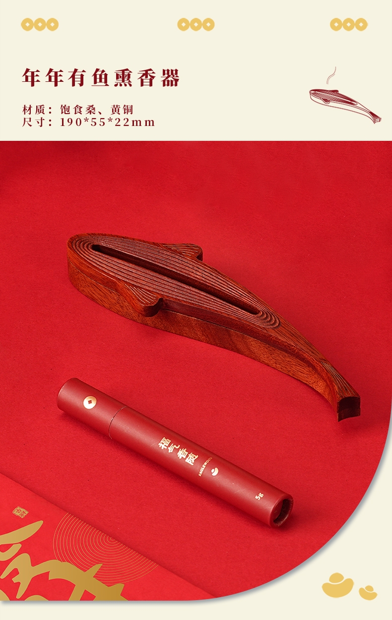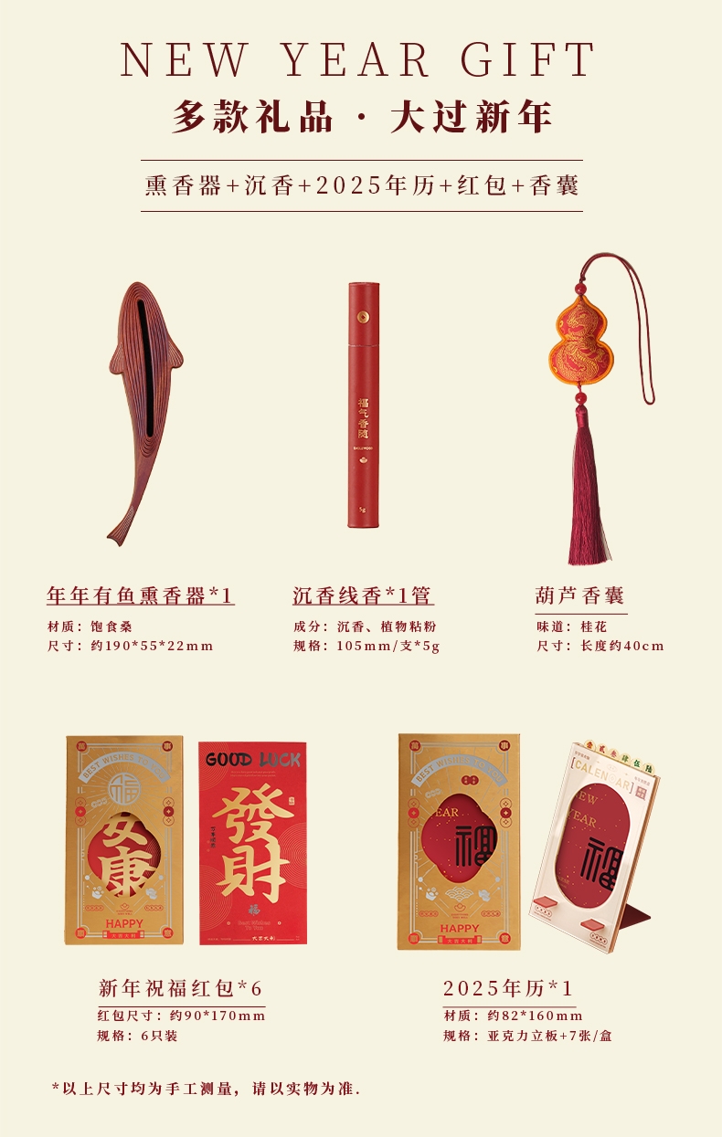 配置:·年年有鱼香器×1 ·沉香线香×1(5g装) ·桂花香囊×1 ·新年红包×6 ·新年日历×1 ·使用说明×1