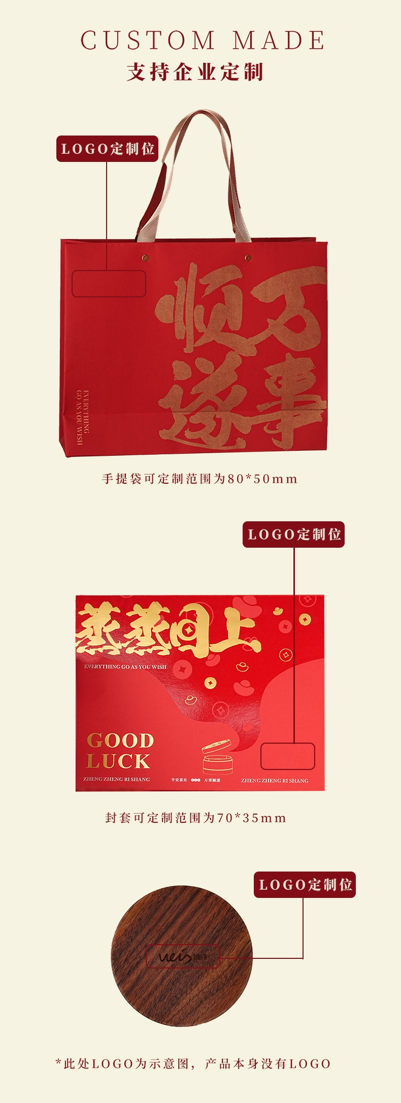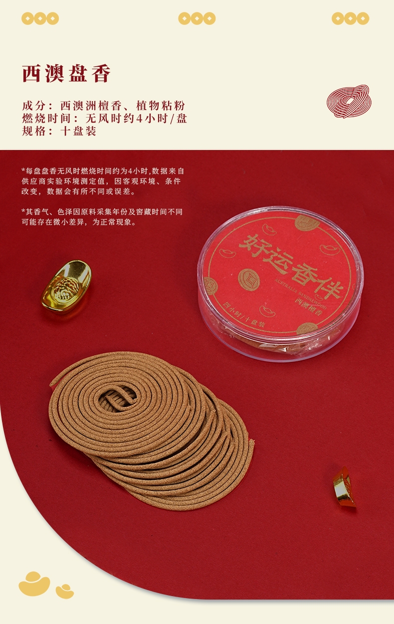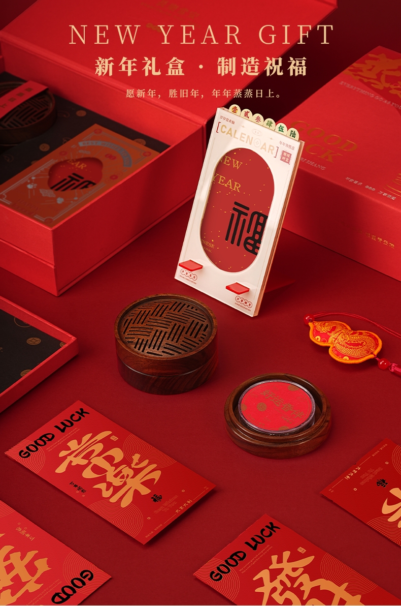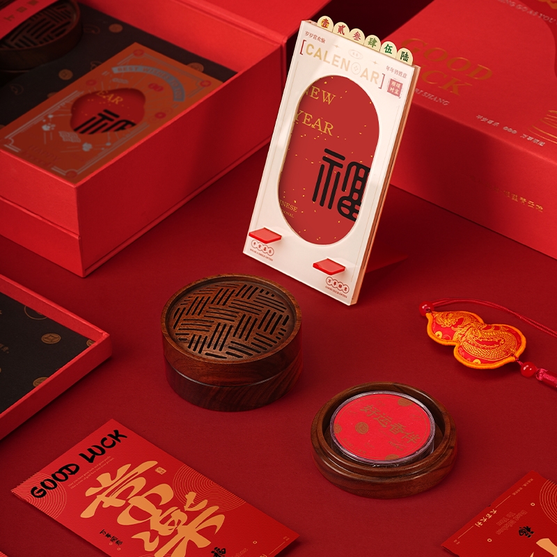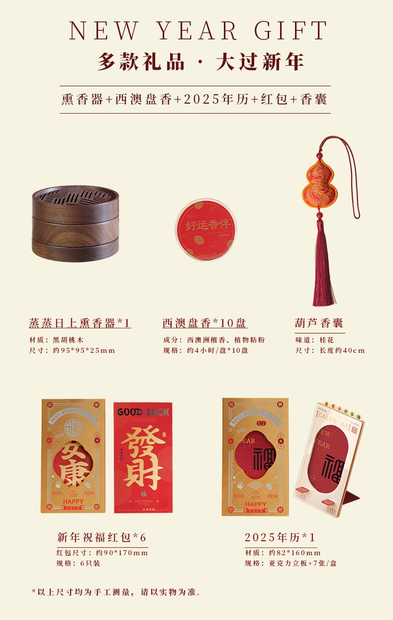 配置:·蒸蒸日上香器×1 ·西澳檀香×1(十盘装) ·桂花香囊×1 ·新年红包×6 ·新年日历×1 ·使用说明×1