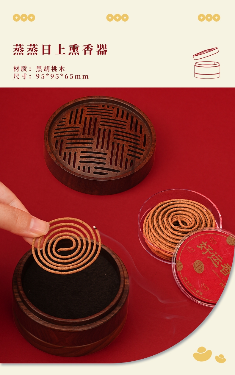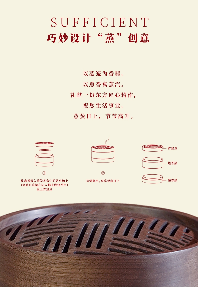 以蒸笼为香器, 以熏香寓蒸汽;巧妙设计“蒸”创意;每盘盘香无风时燃烧时间约为4小时