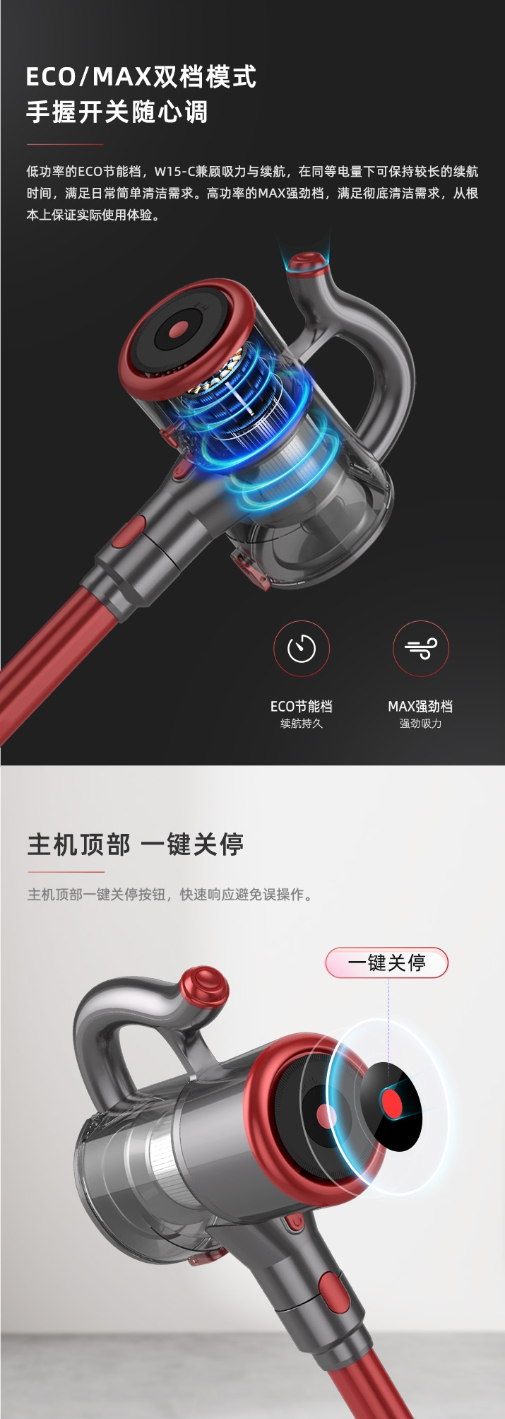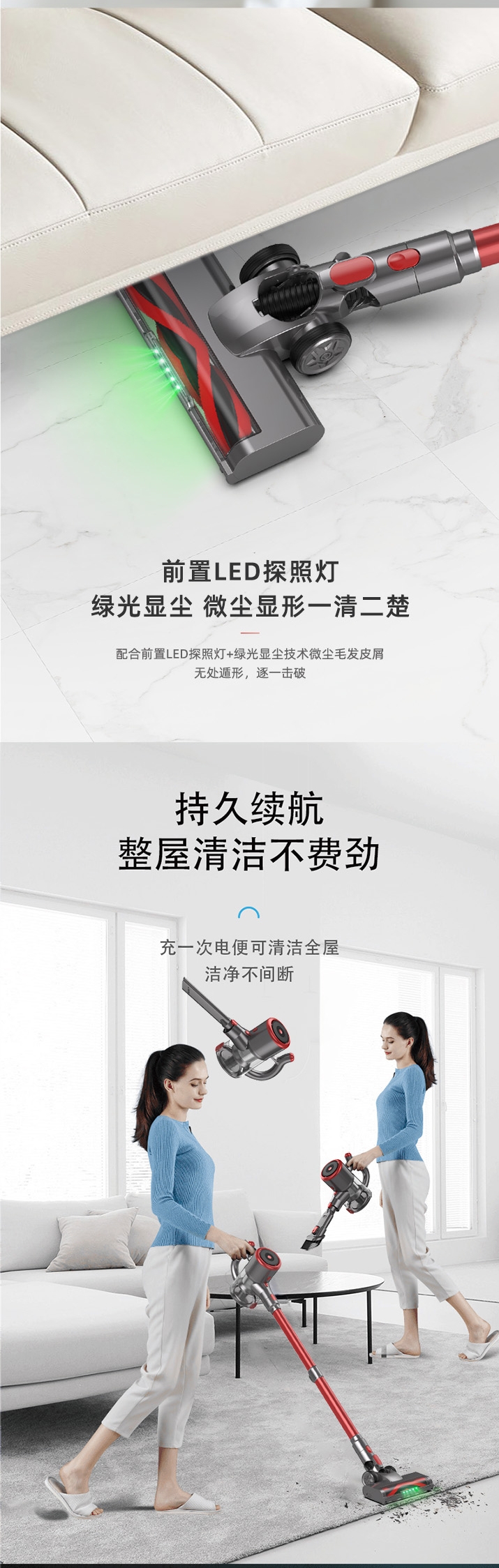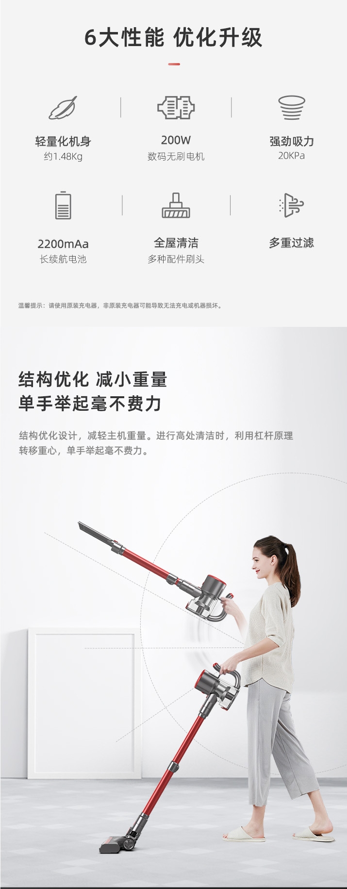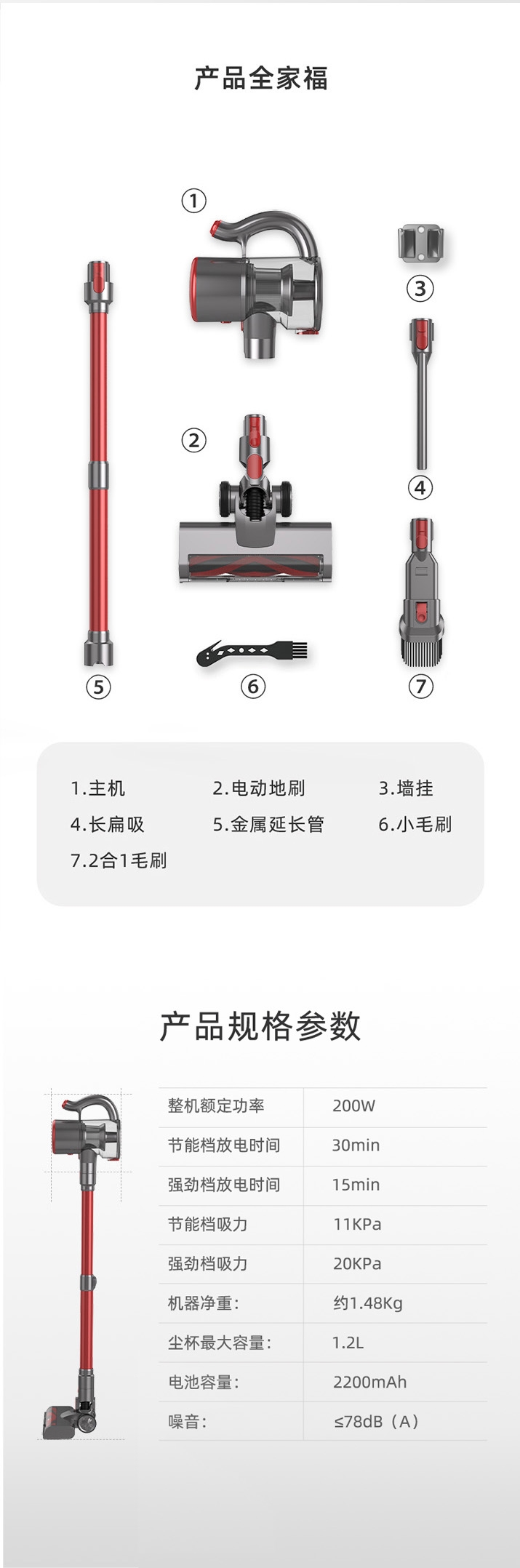 200W数码无刷电机;V形防缠绕电动地刷,有效减少毛发缠绕,使用更舒心;200mAh 可充电电池,ECO模式可持续工作30