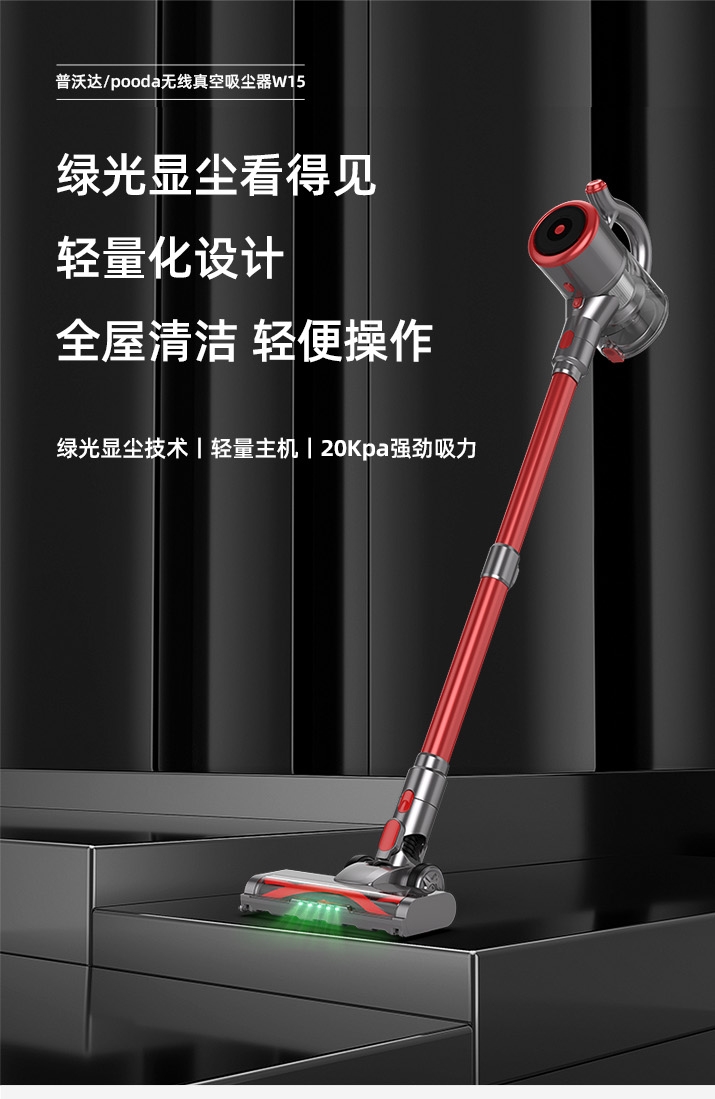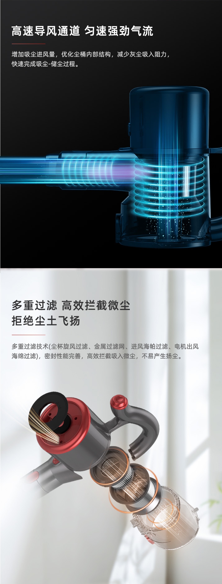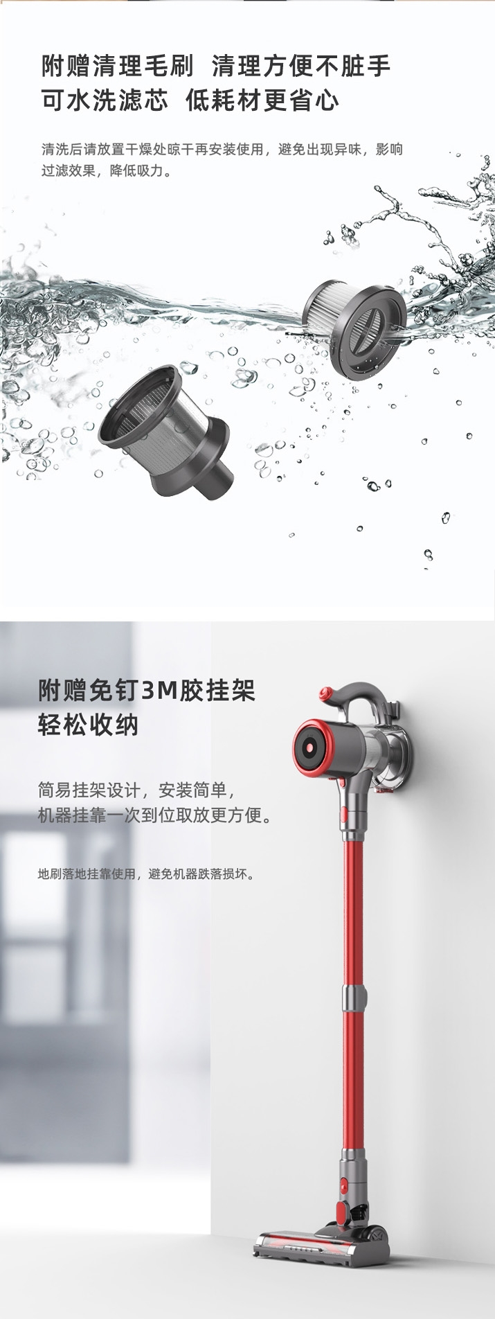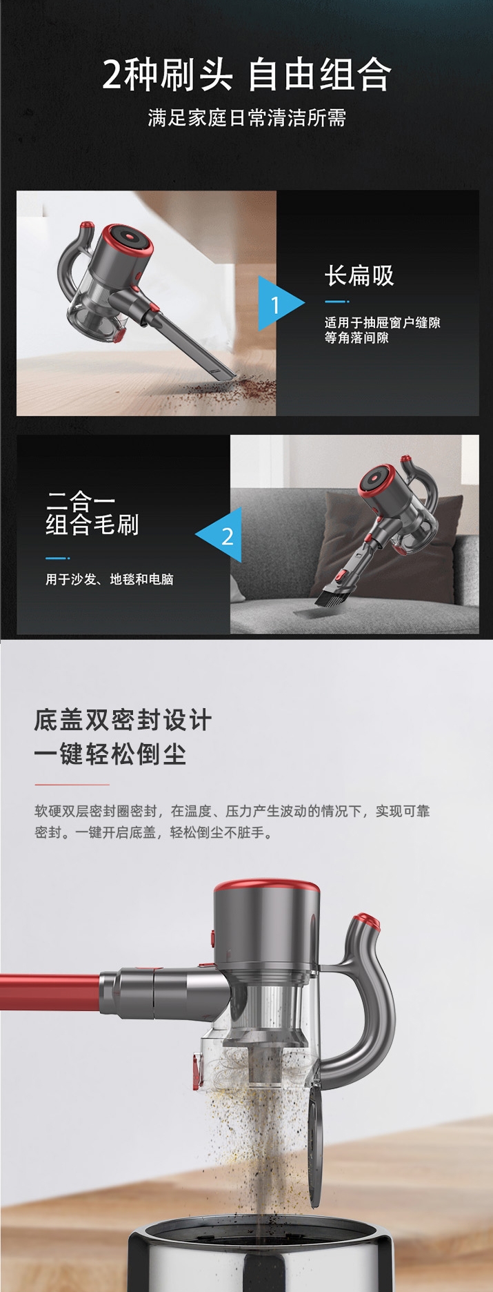 200W数码无刷电机;V形防缠绕电动地刷,有效减少毛发缠绕,使用更舒心;200mAh 可充电电池,ECO模式可持续工作30
