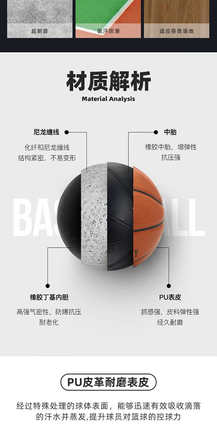 表皮颗粒顶部进行了强化处理,表皮更加耐磨防滑,;橡胶丁基内胆,高强气密性,防爆抗压.耐老化;室内室外皆可使用,科技表皮不惧磨损.越打手感越好