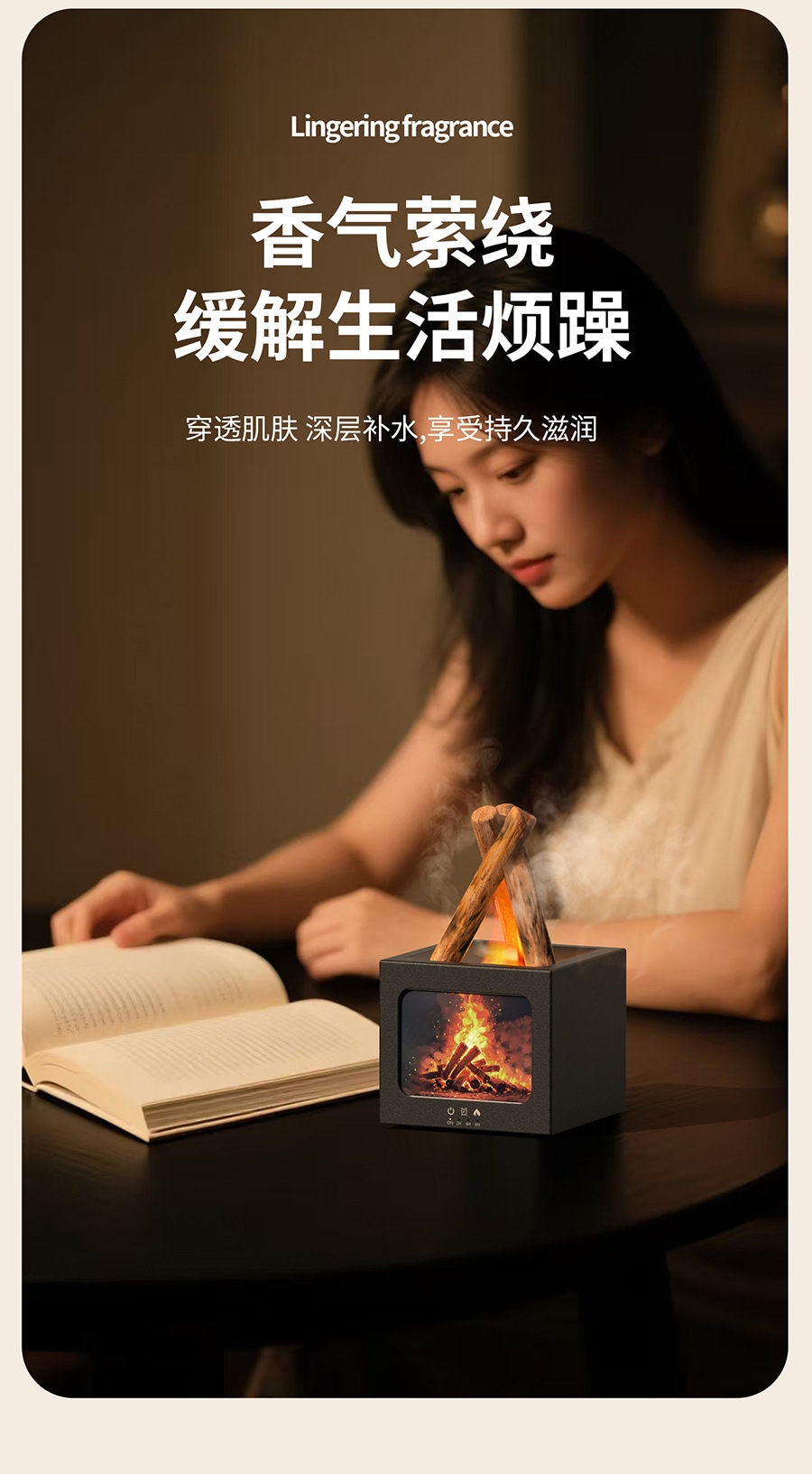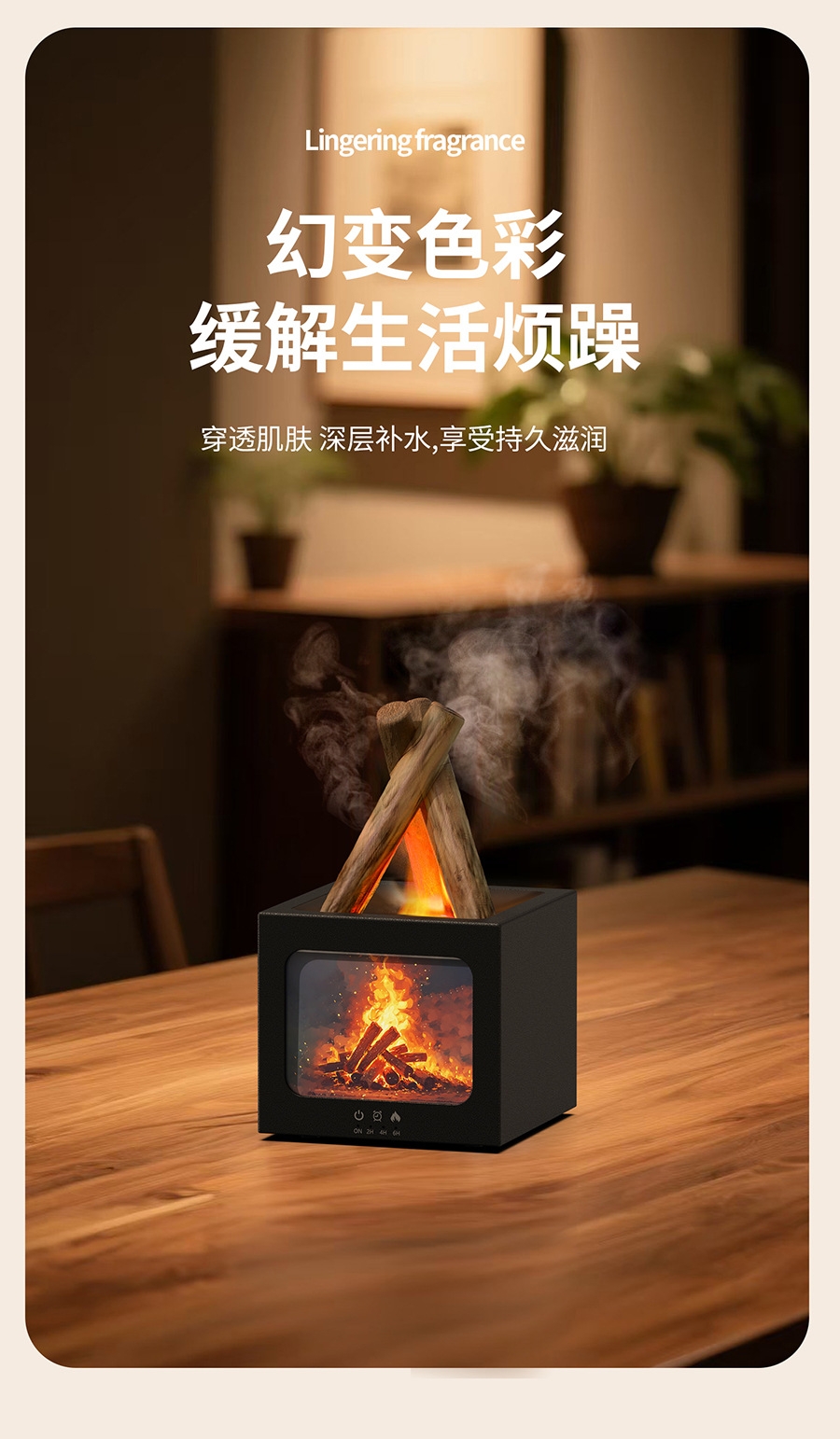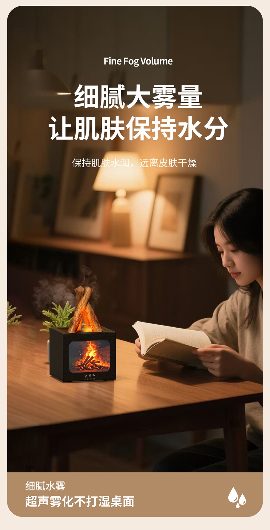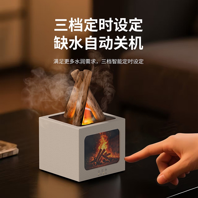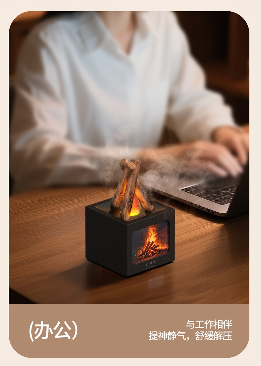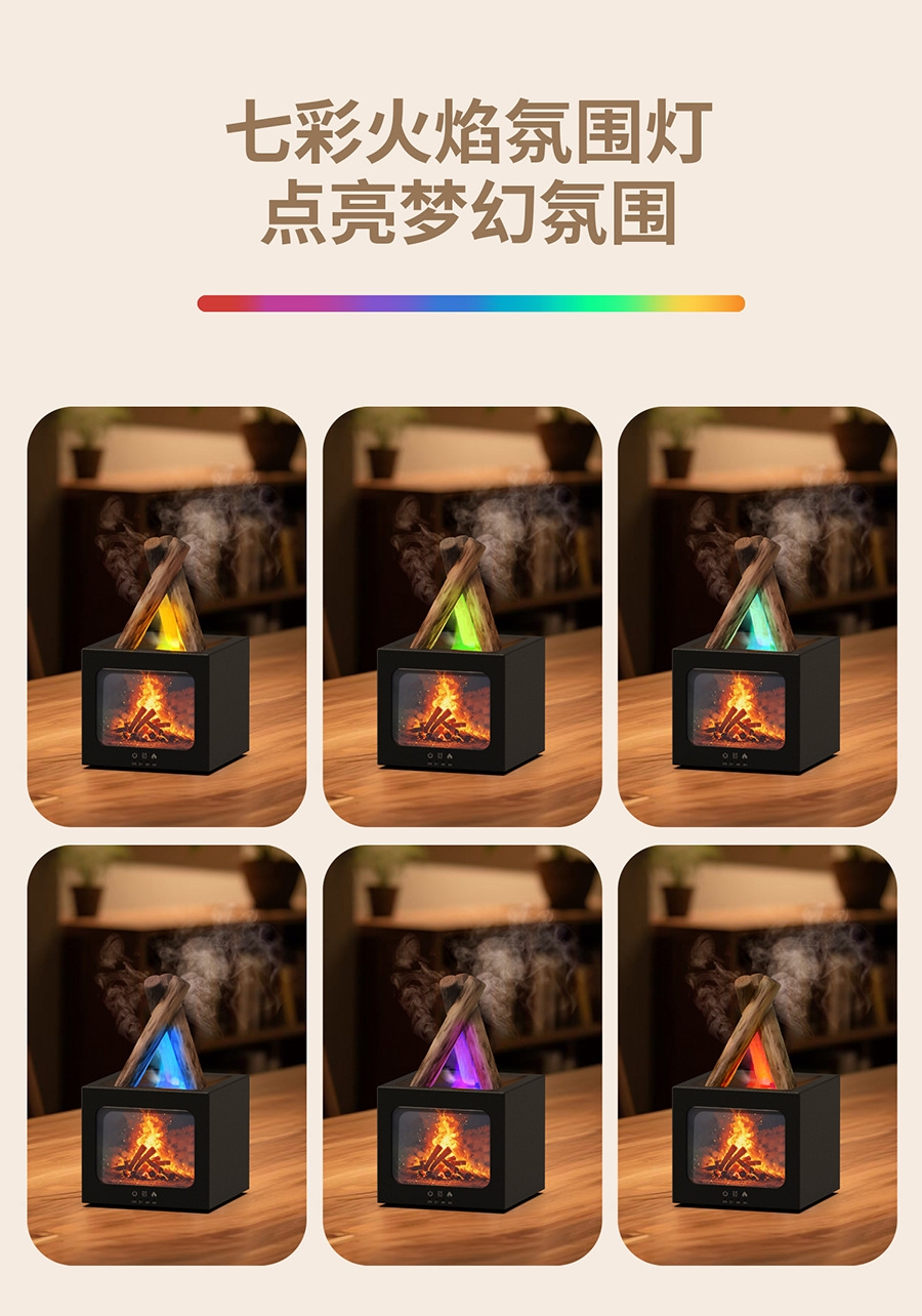 七彩火焰氛围灯,三档定时;轻音加湿,持久水润,断电保护;超声雾化不打湿桌面