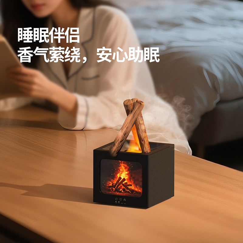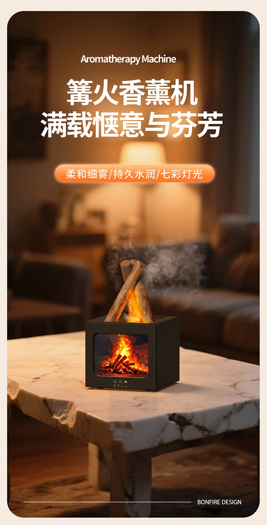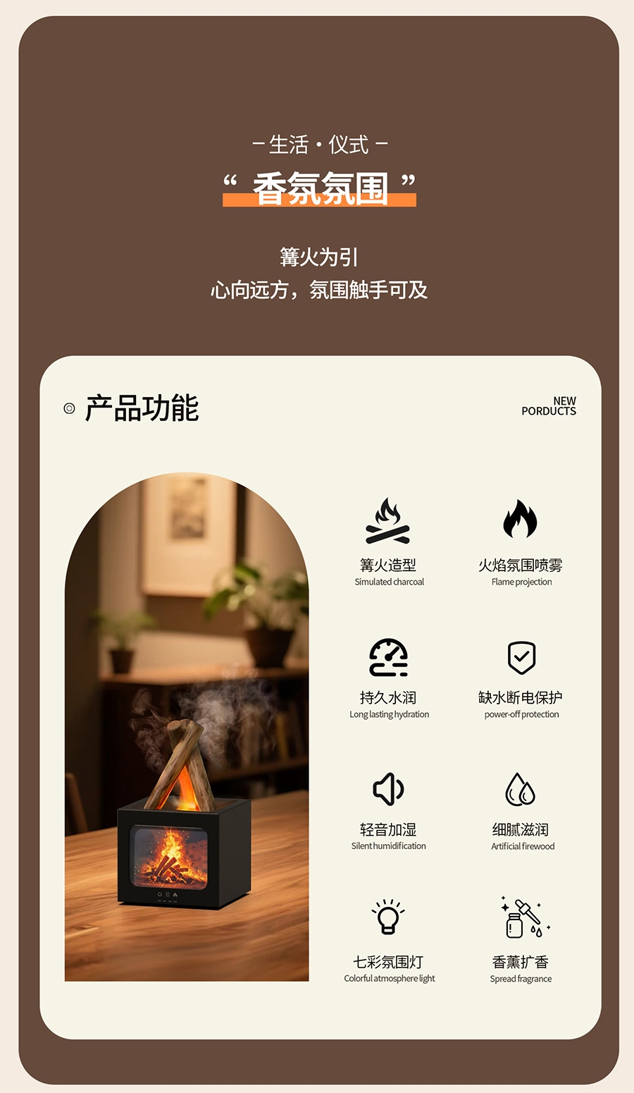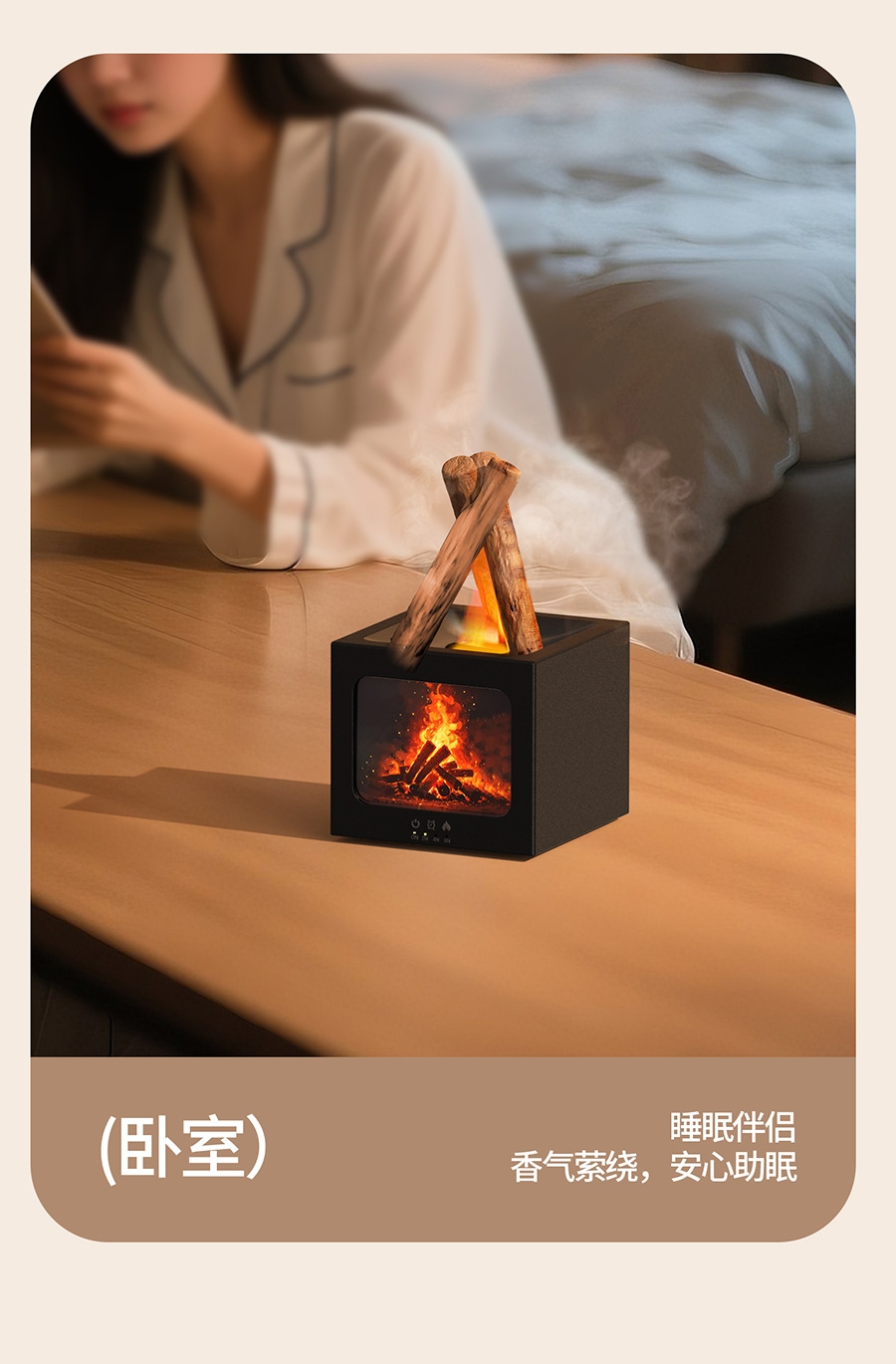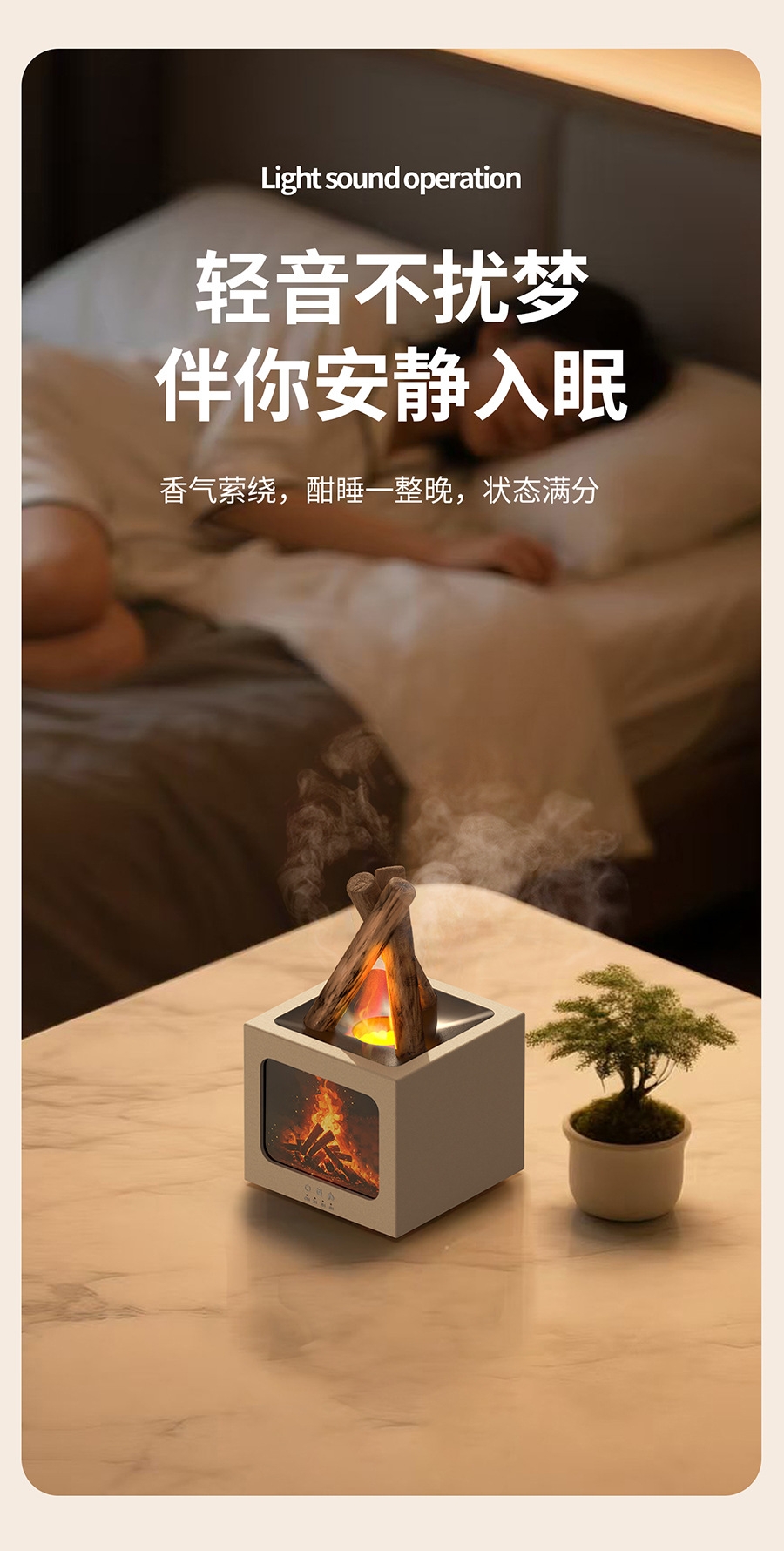 七彩火焰氛围灯,三档定时;轻音加湿,持久水润,断电保护;超声雾化不打湿桌面
