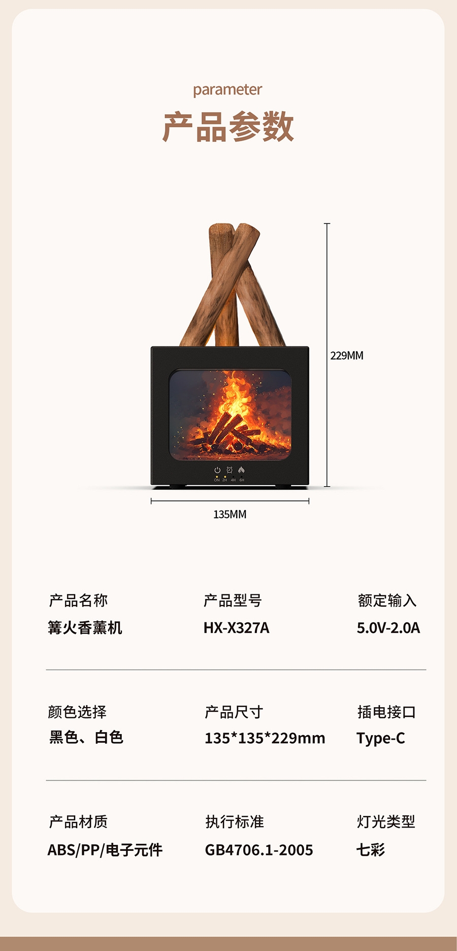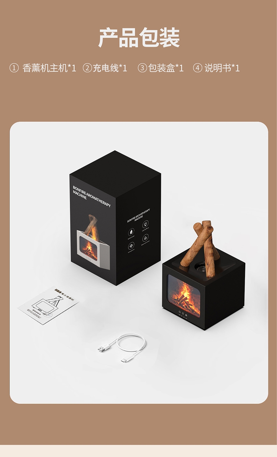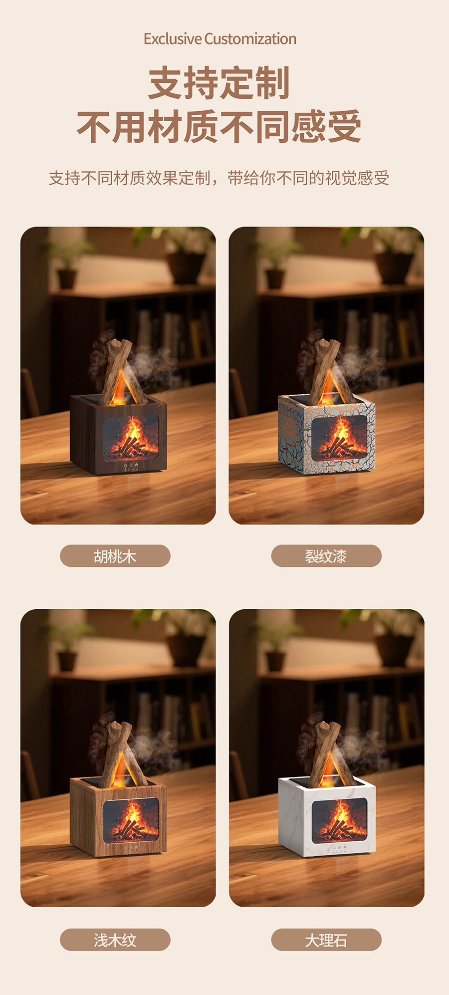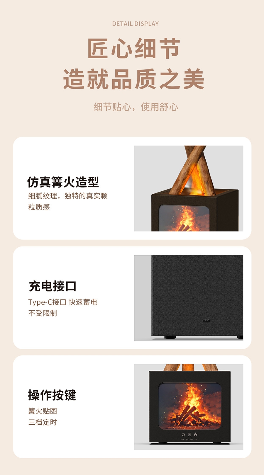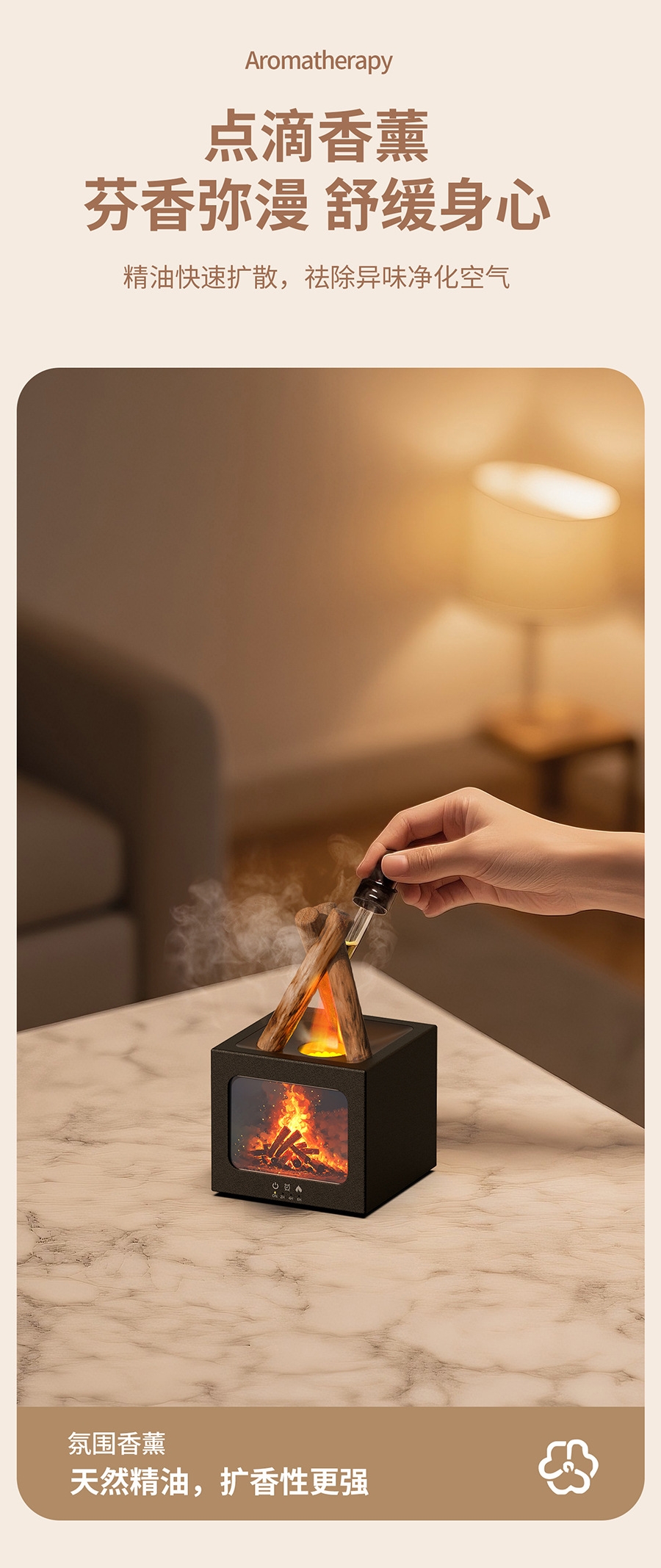 七彩火焰氛围灯,三档定时;轻音加湿,持久水润,断电保护;超声雾化不打湿桌面