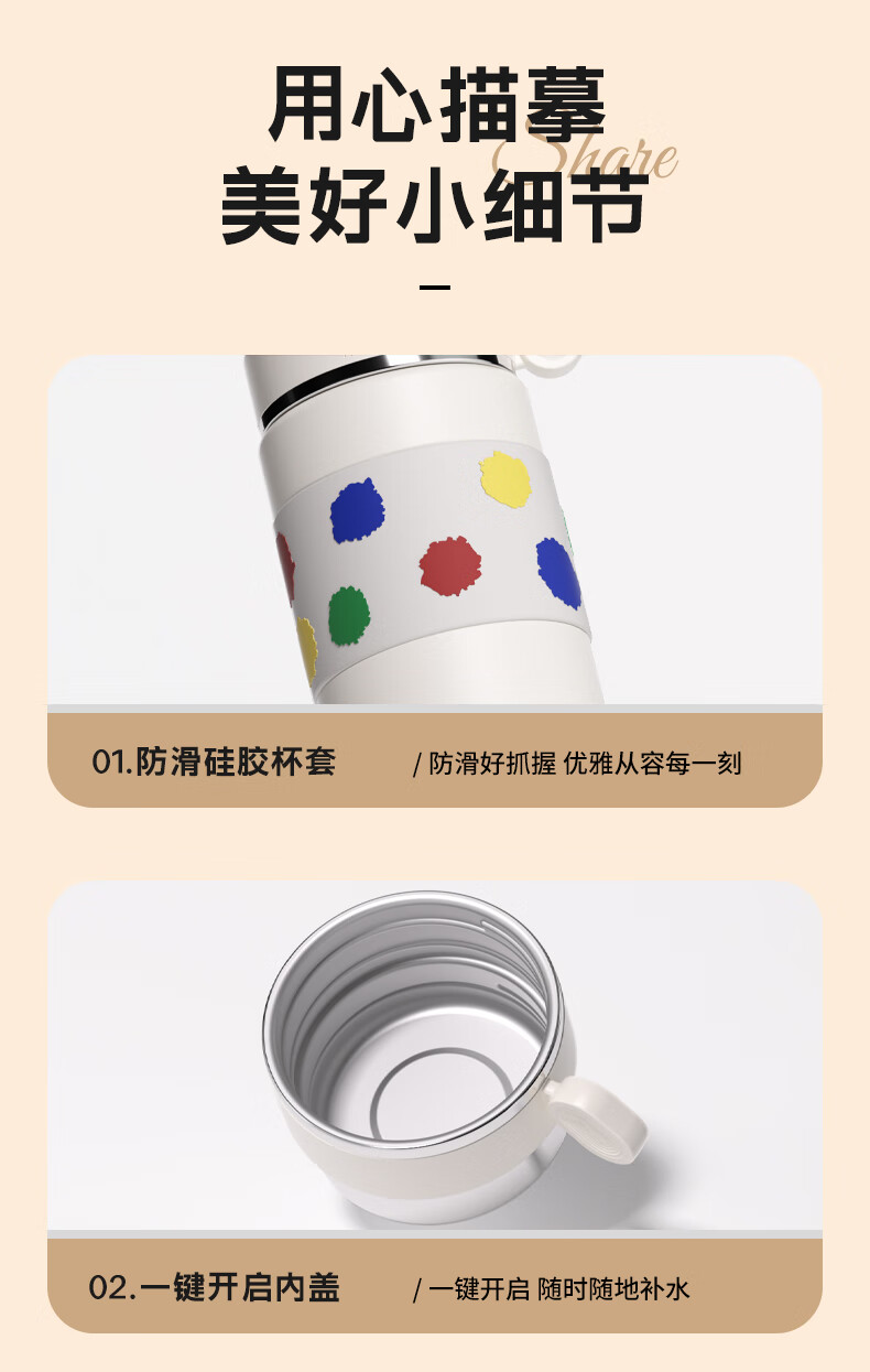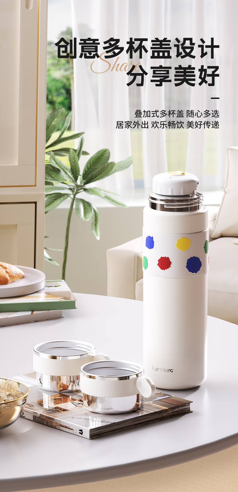 创意多杯盖叠加设计,分享盖畅饮;防滑硅胶杯套,780ml大容量设计;防滑静音硅胶底垫,抗震防摔