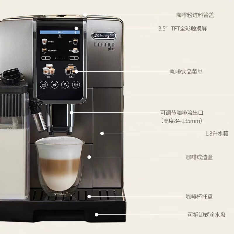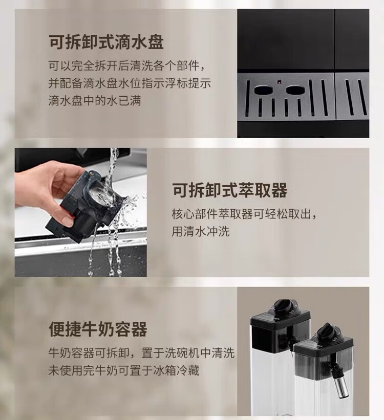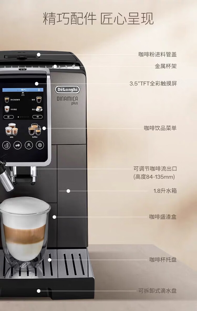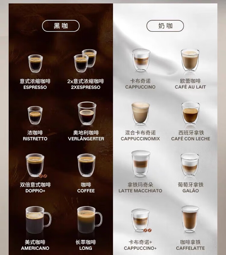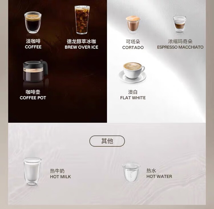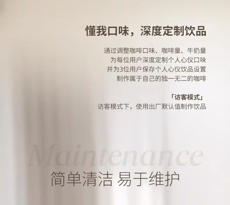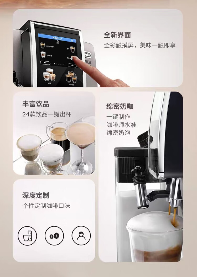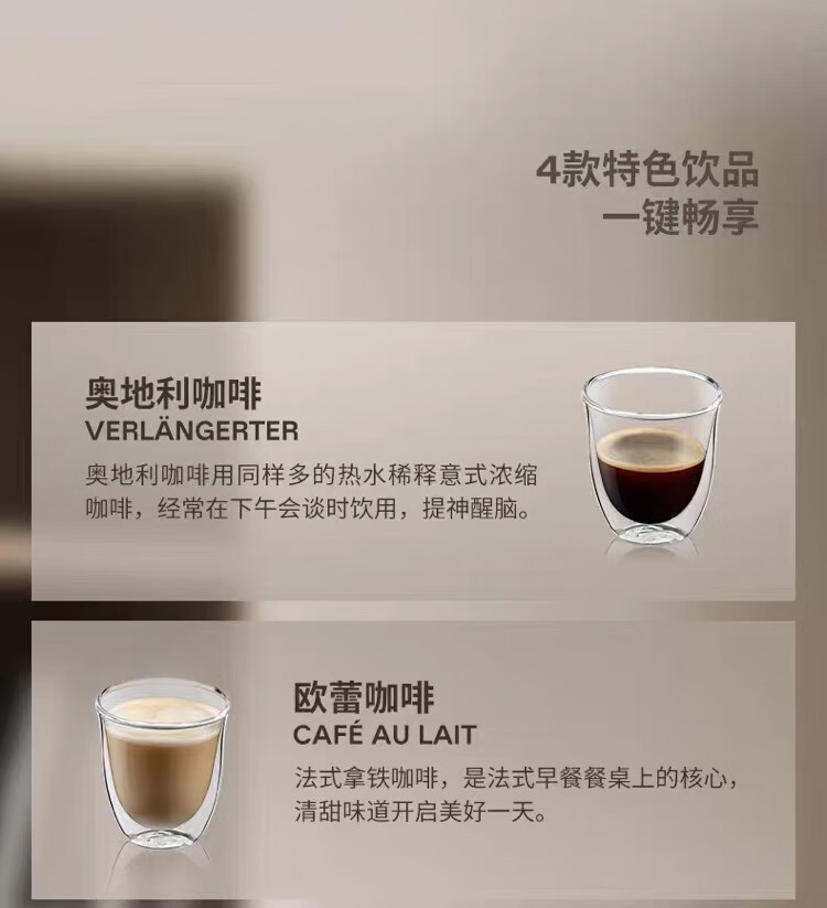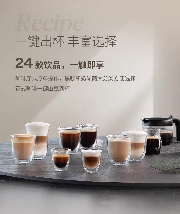 低温醇萃, 在家即可享受酷爽冰咖;智能记忆,咖啡菜单实时排序,为全家定制专属菜单;一键获得咖啡厅经典饮品(24种饮品任您选择)